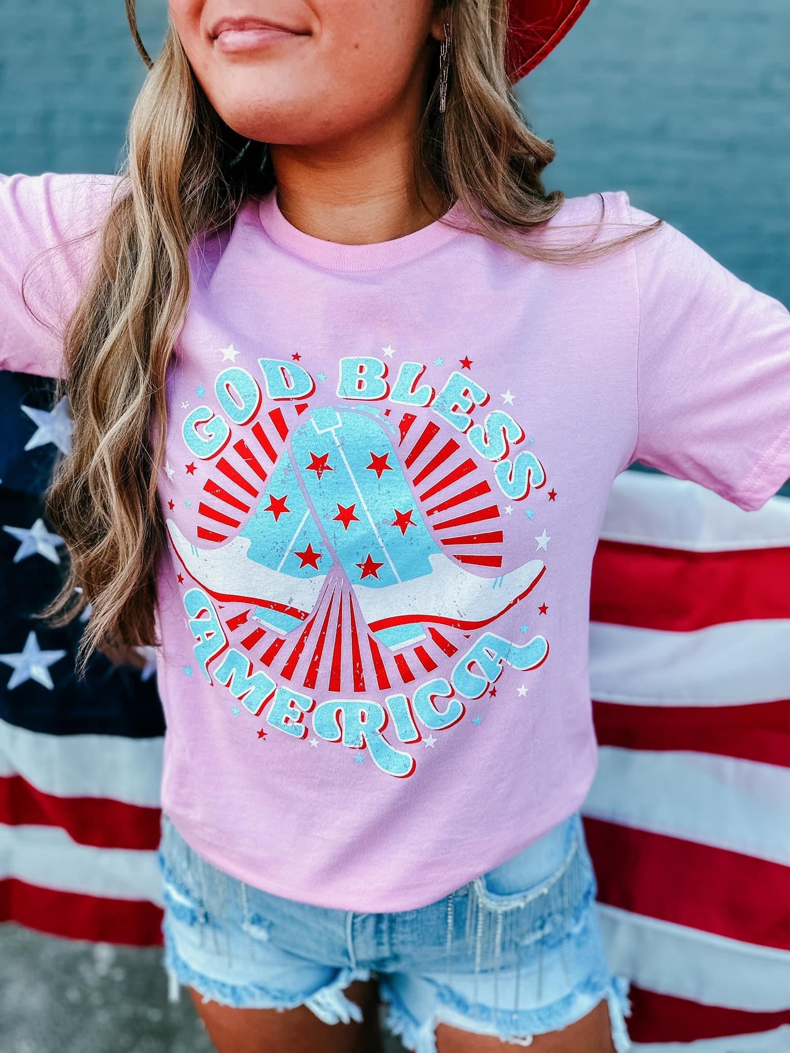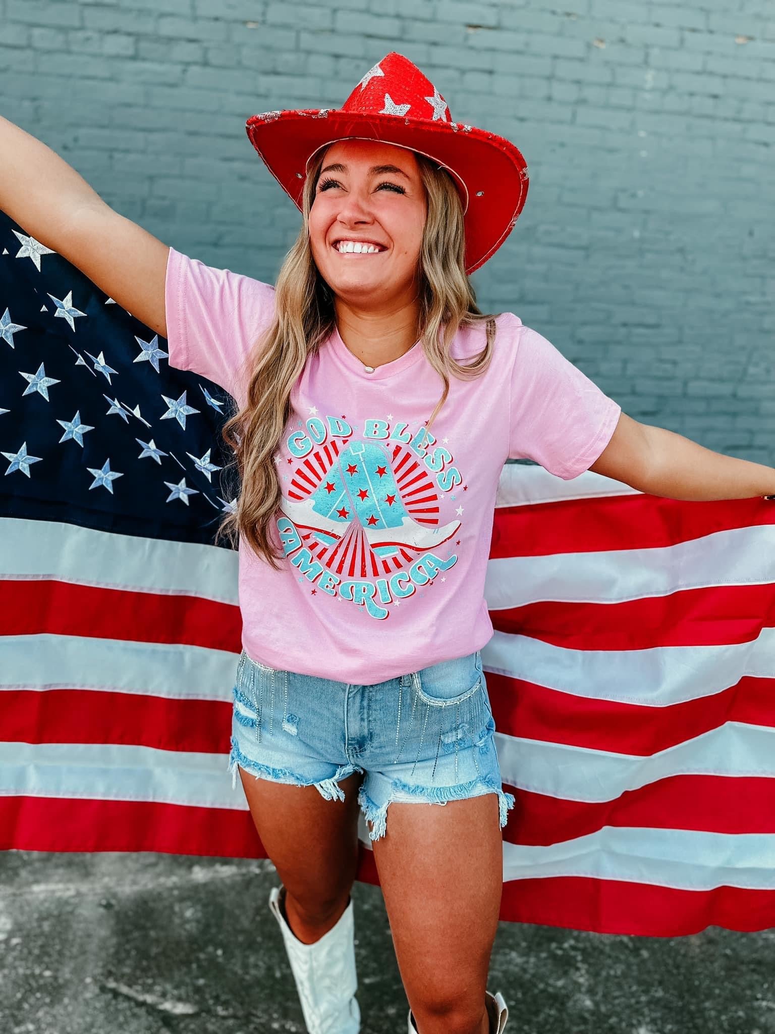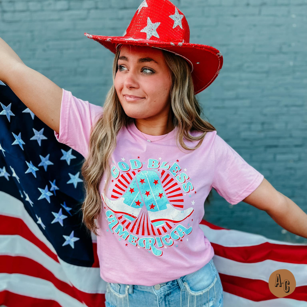 God Bless America! Show off your patriotic side with these star cowgirl boots. Express your freedom with every step and never forget that the best things in life are free! * Bubble Gum Pink * Bella + Canvas * Poly/Cotton * Unisex Fit, True to Size * Screen printed with Red, White & Bright Blue Inks