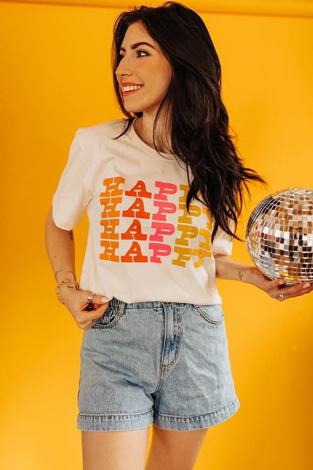 Spring & Summer is calling with this Happy graphic tee! Printed on Bella Canvas in “happy” shades of peach, pink, yellow, coral, & orange! Fit is true to size. The tee is not white, but a light cream color!