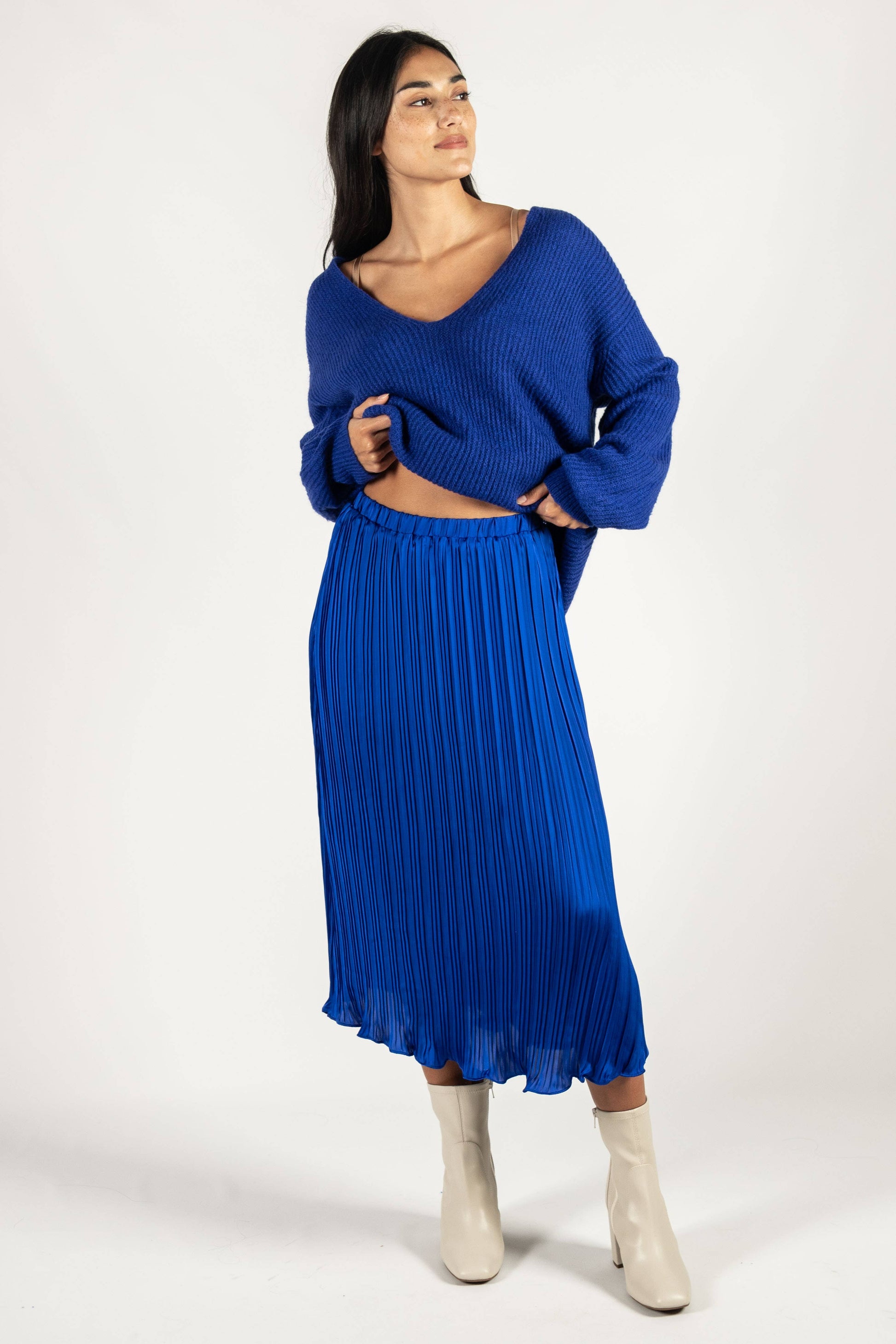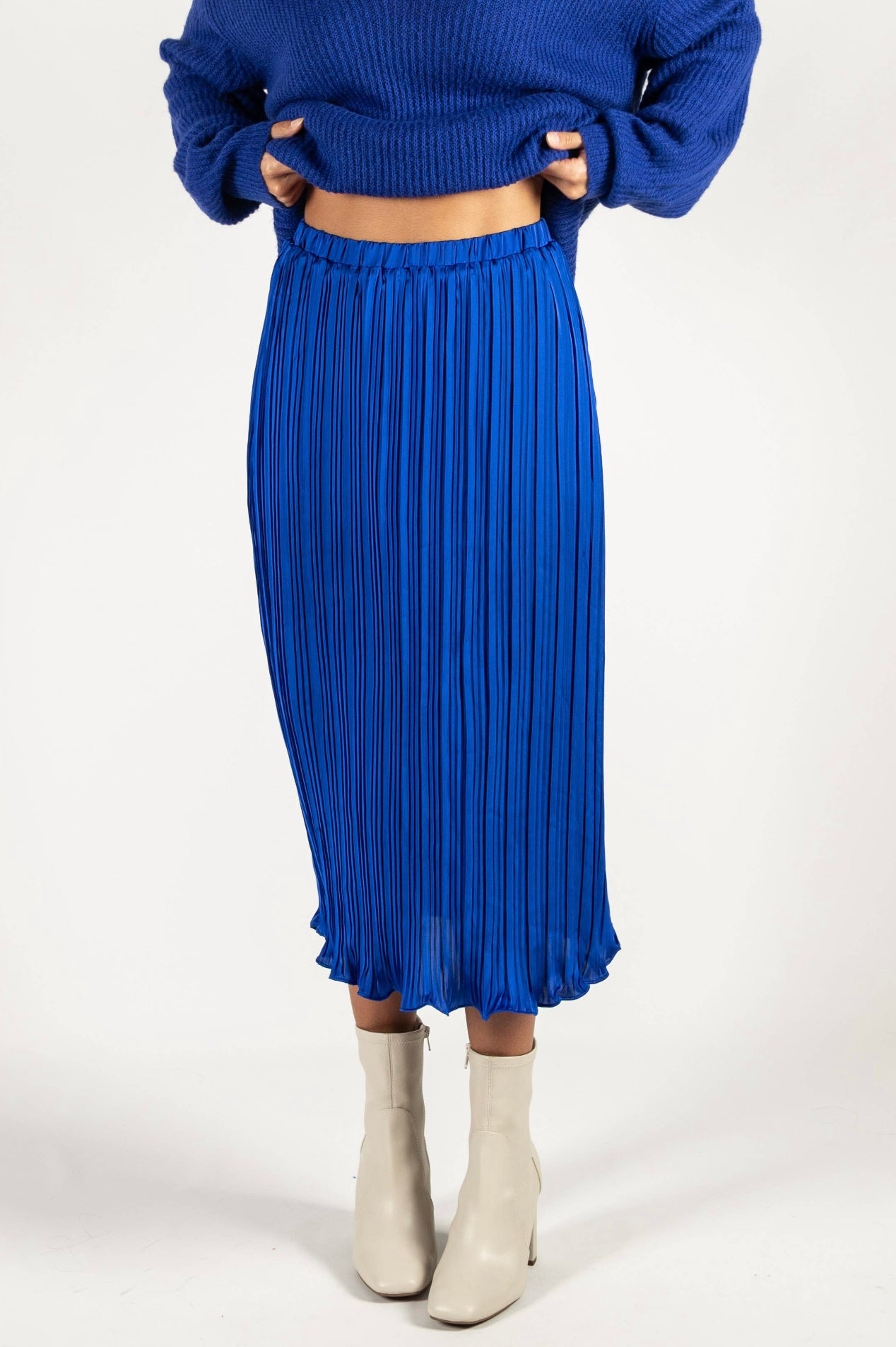 This pleated midi length skirt features slight ruffled edges and a comfortable waist band. We would style this with a matching oversized sweater for a monochromatic look or with a graphic tee for an edgier vibe.
