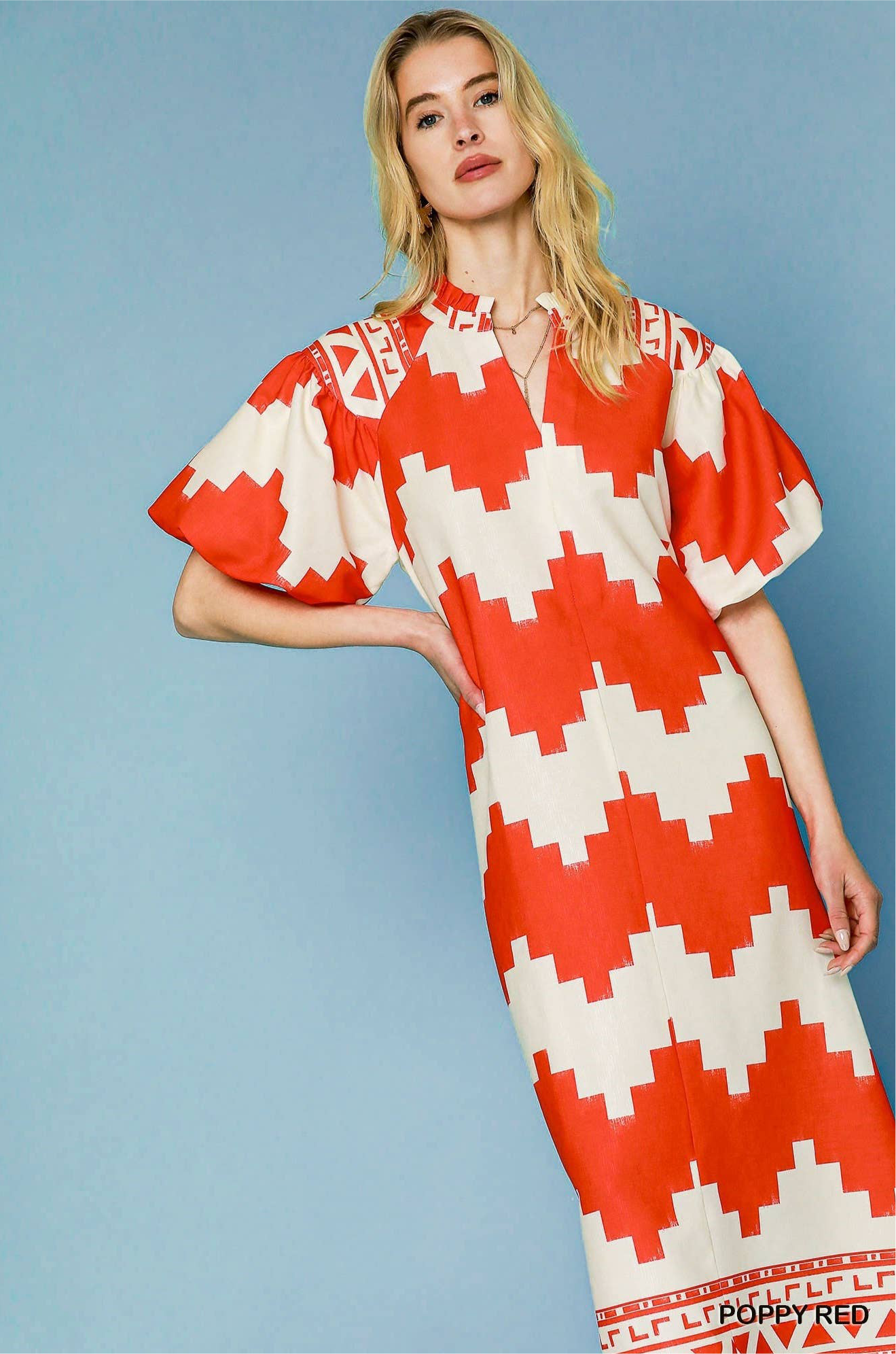 Poppy Printed V Neck Puff Short Sleeve Midi Dress