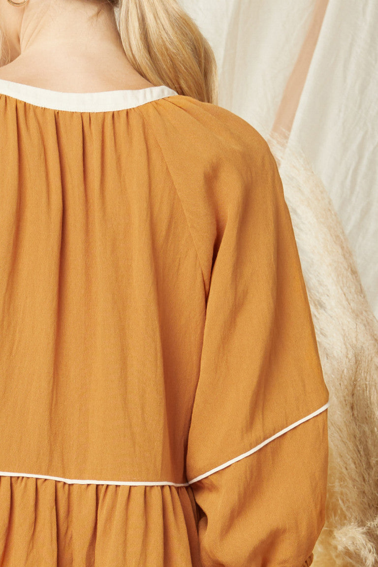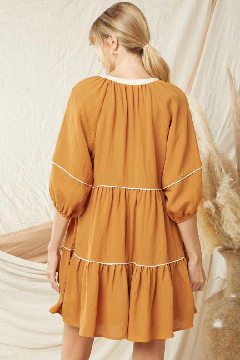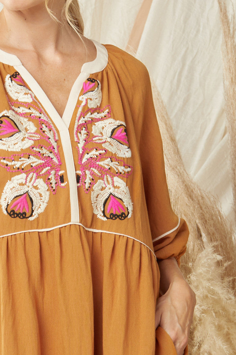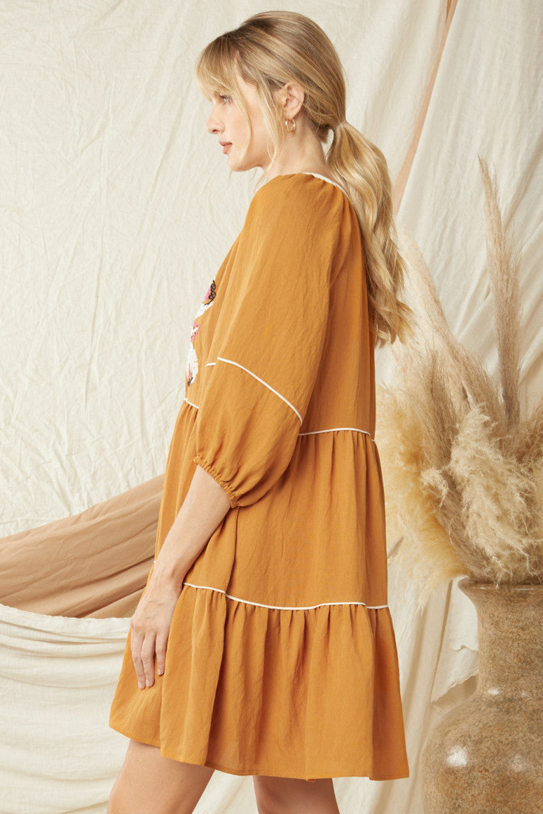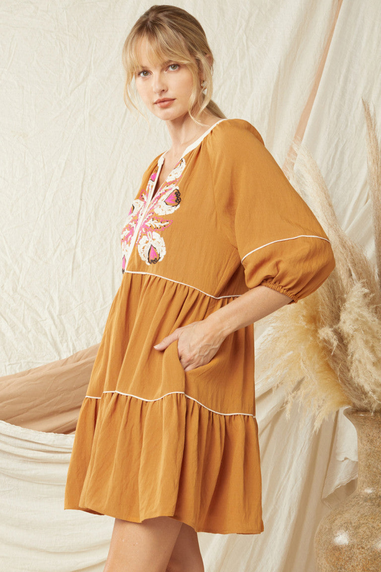 Solid v-neck 3/4 sleeve length tiered dress featuring embroidery detail at bust. Lined! With pockets! Woven. Non-sheer. Lightweight. Gorgeous camel color with pops of pink in the embroidery. Generous fit! Consider sizing down.