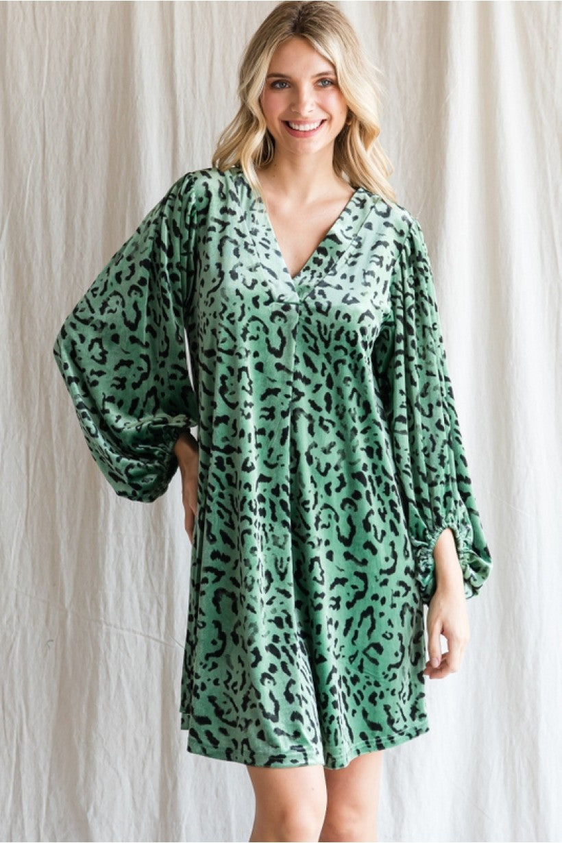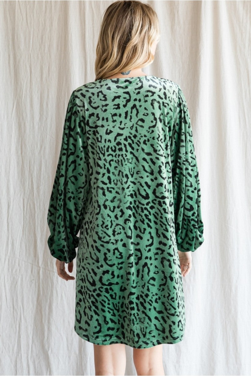 We took leopard up a notch with this green velvet dress in an easy shape and fit.