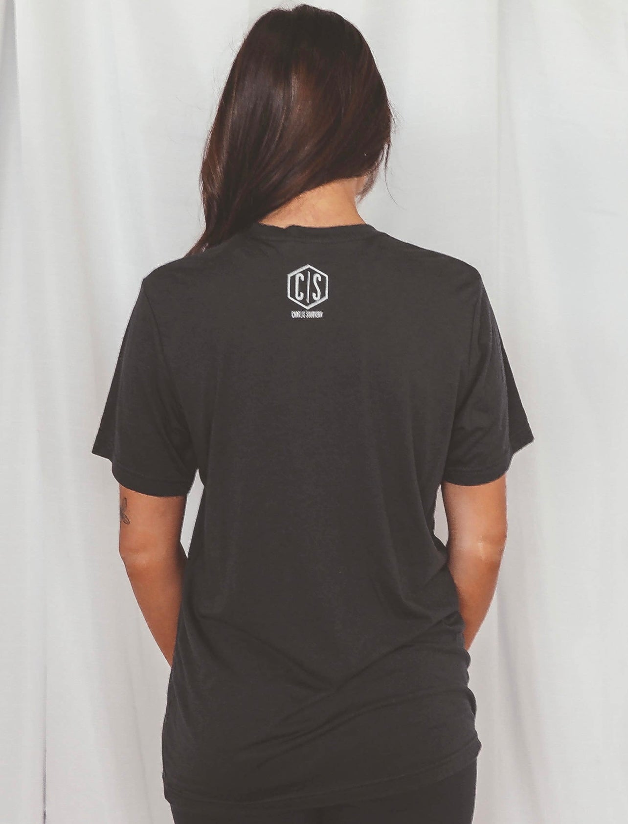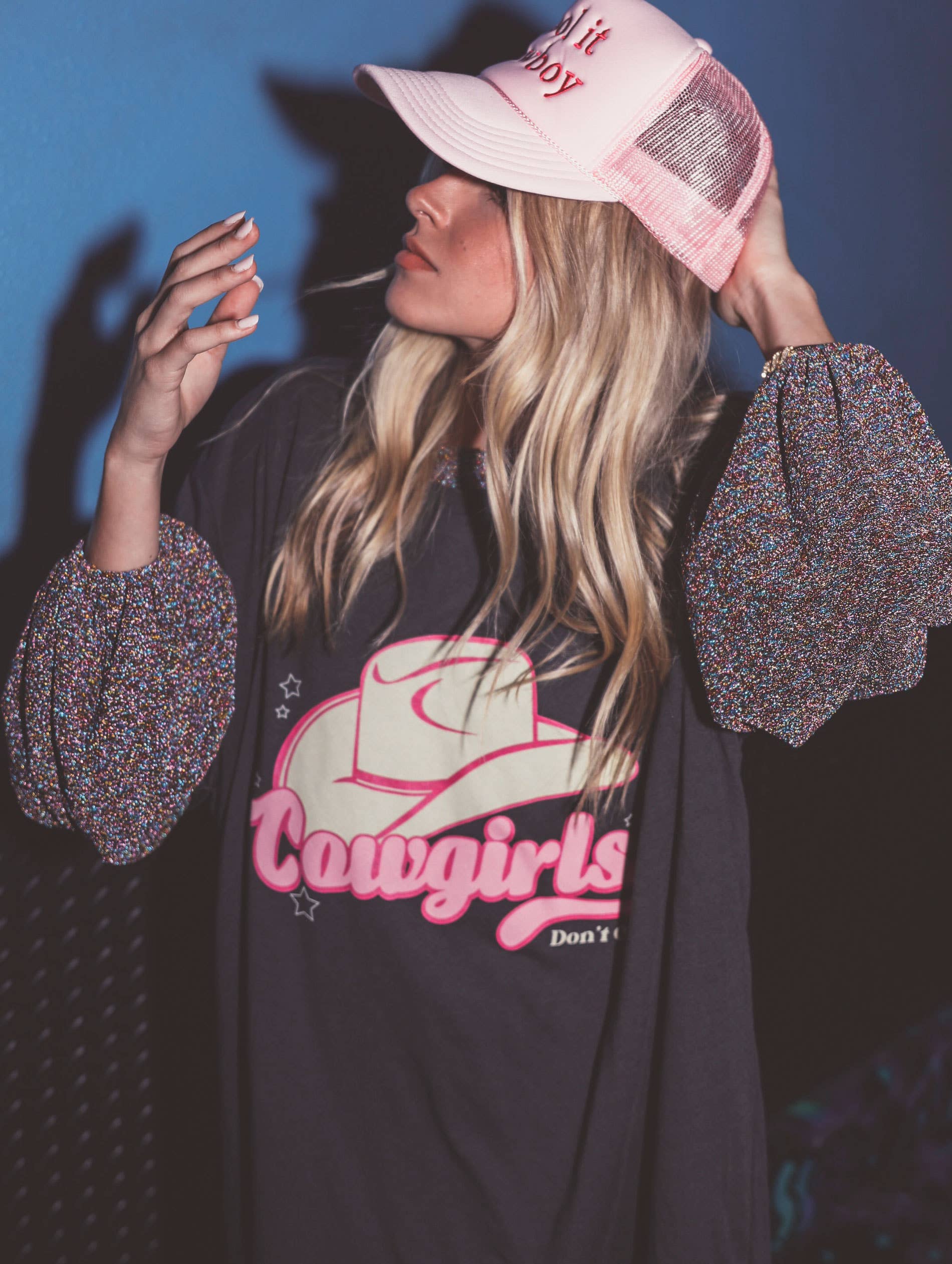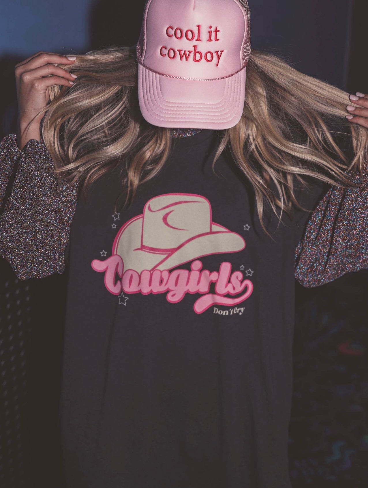 Cowgirls don't cry... but they do if they miss out on this tee! Featuring a charcoal tee with bright pink font and logo. Pair with denim and your favorite cowboy boots to complete the whole vibe! Charlie Southern has done it again with a great graphic tee!