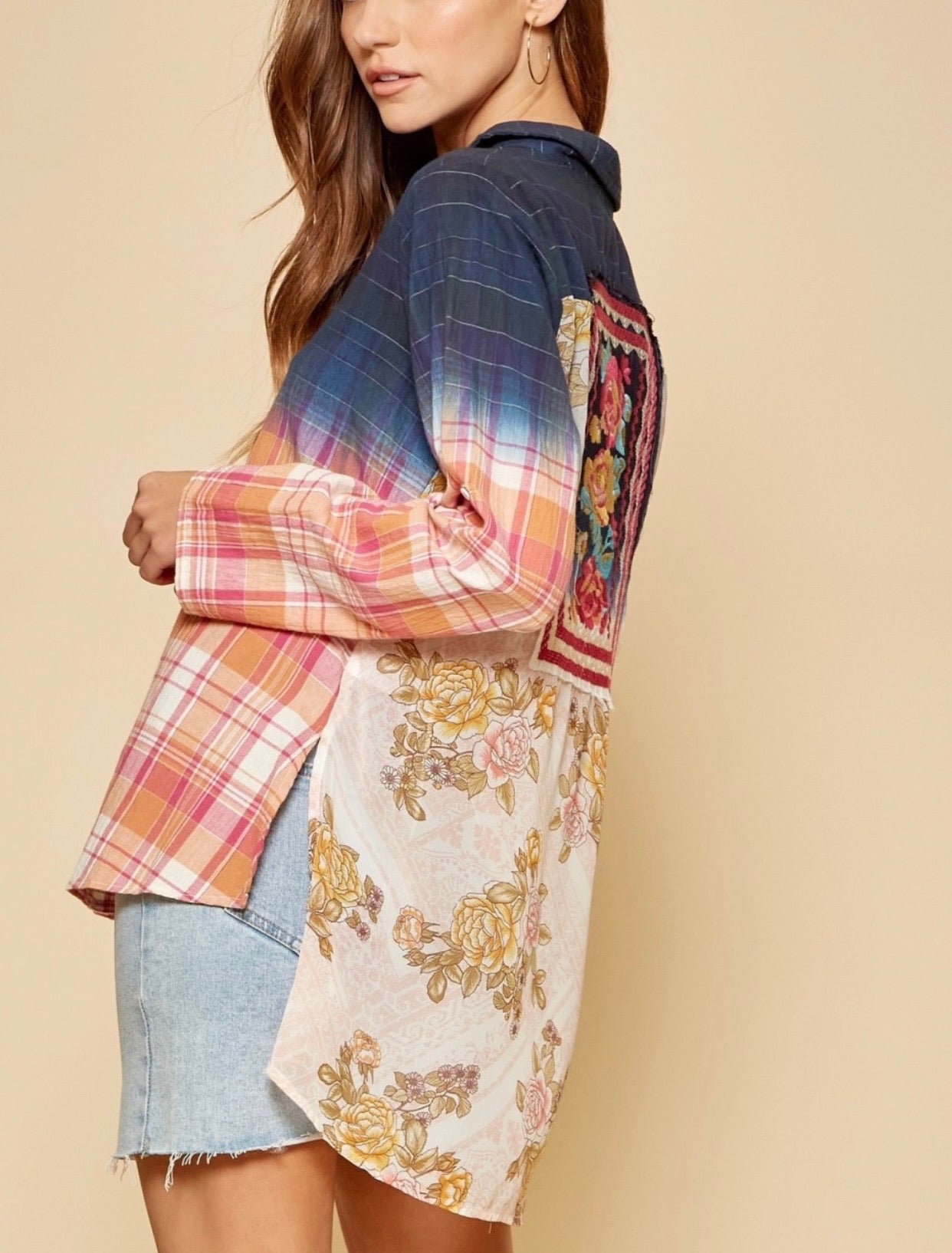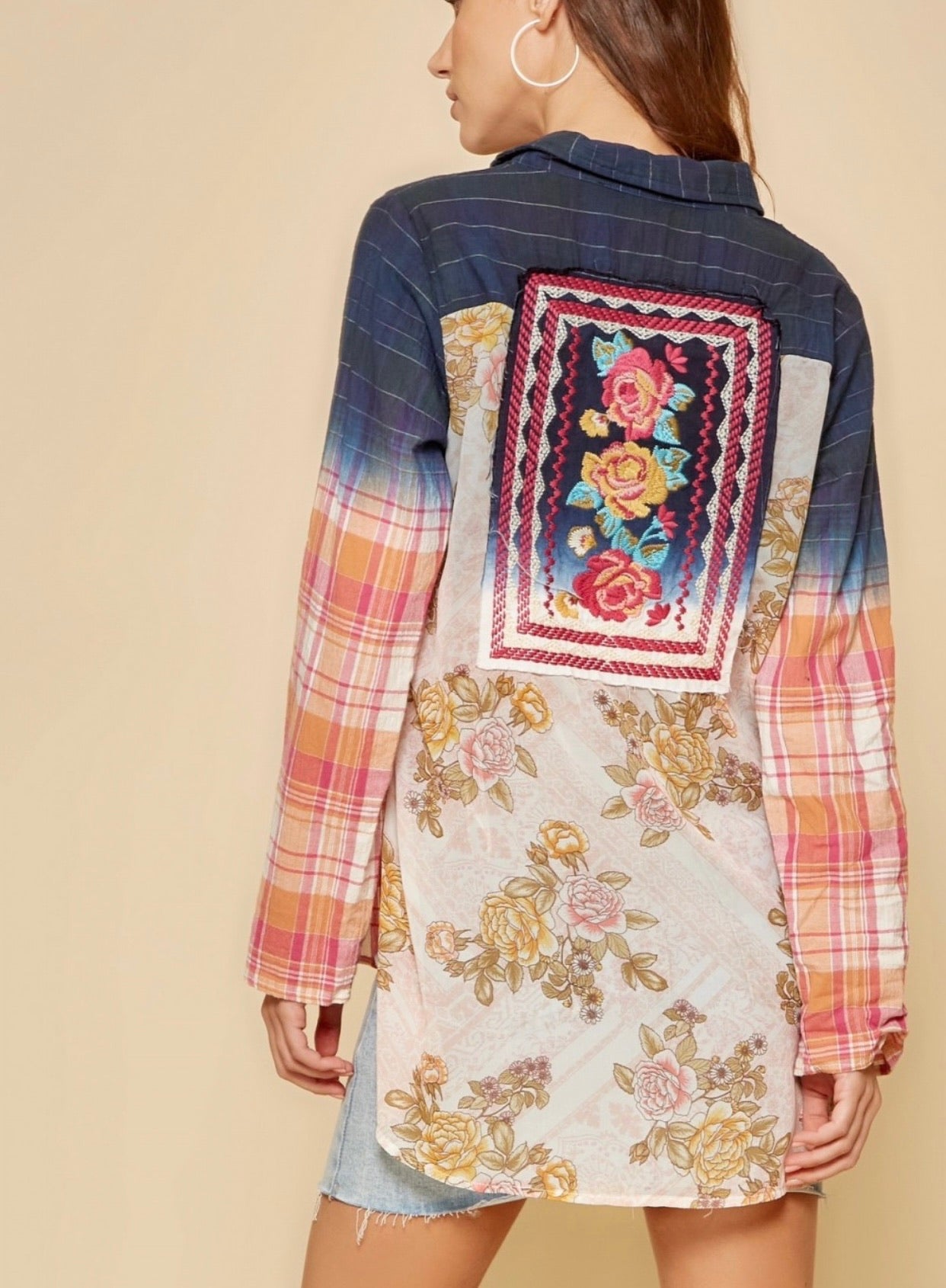 This button down plaid top is beautifully crafted with a stunning patch on back, ombre dye, and contrast print panel on back. Easy fit, loose fit. This is great layered for colder seasons and perfect for spring. I would recommend wearing a cami or tank underneath. ❤️