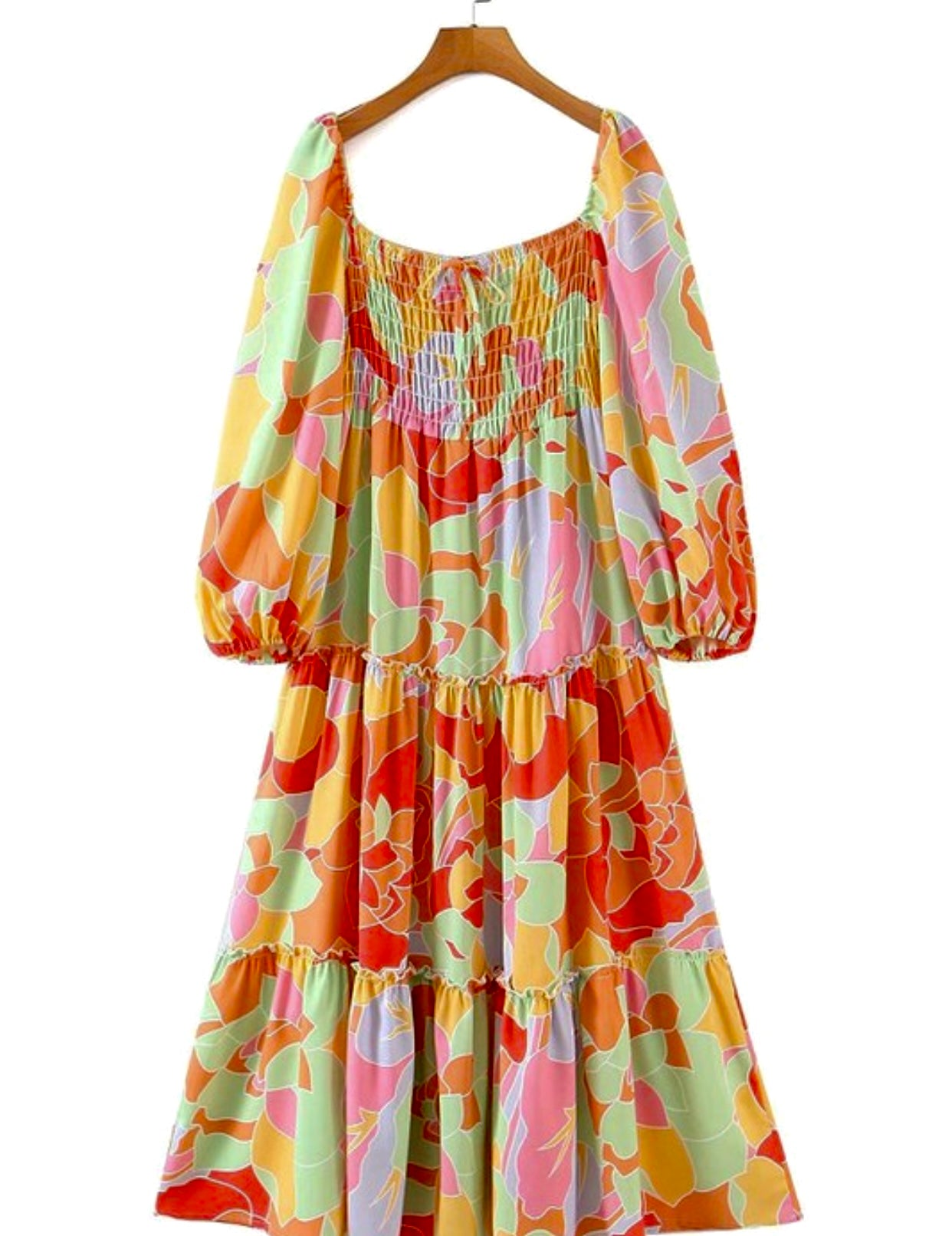 Such a pretty transitional dress when it’s still a bit warm out, but Fall’s right around the corner. The elasticize bust area allows space for the gals without adding bulk. The print is gorgeous! I’ll be wearing this into the fall with booties and now with sandals.