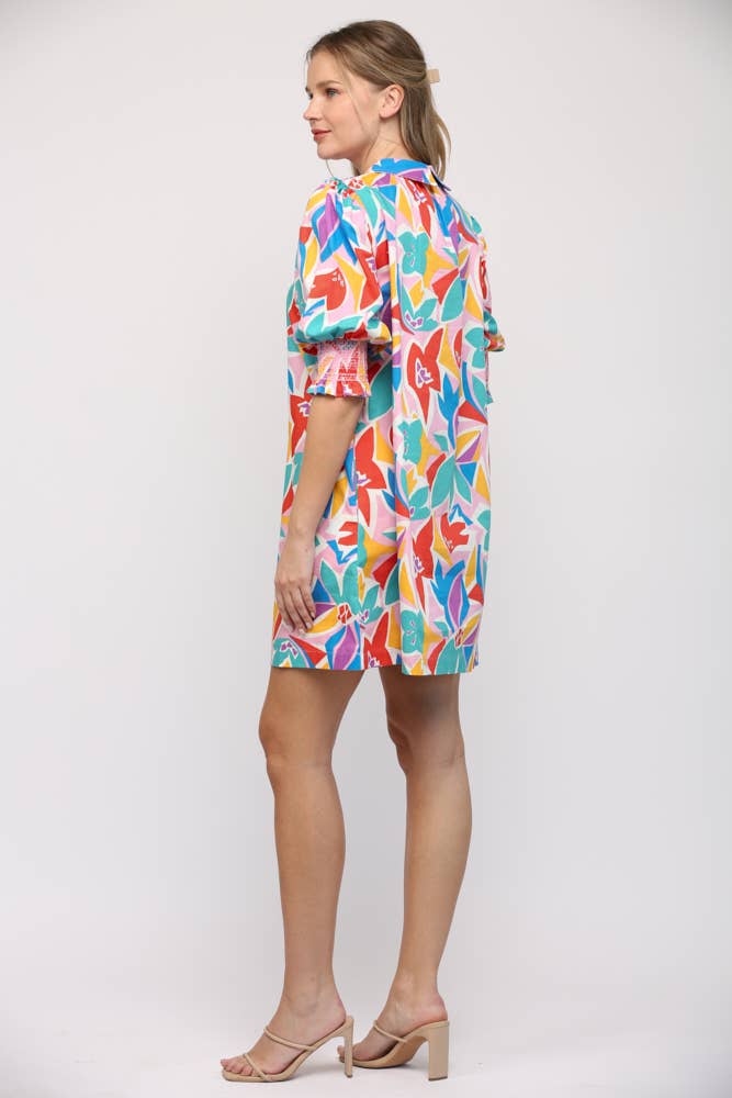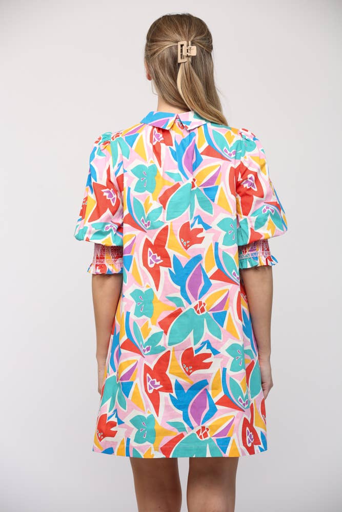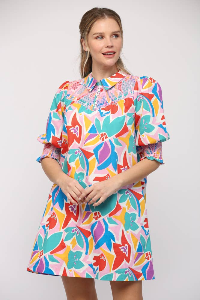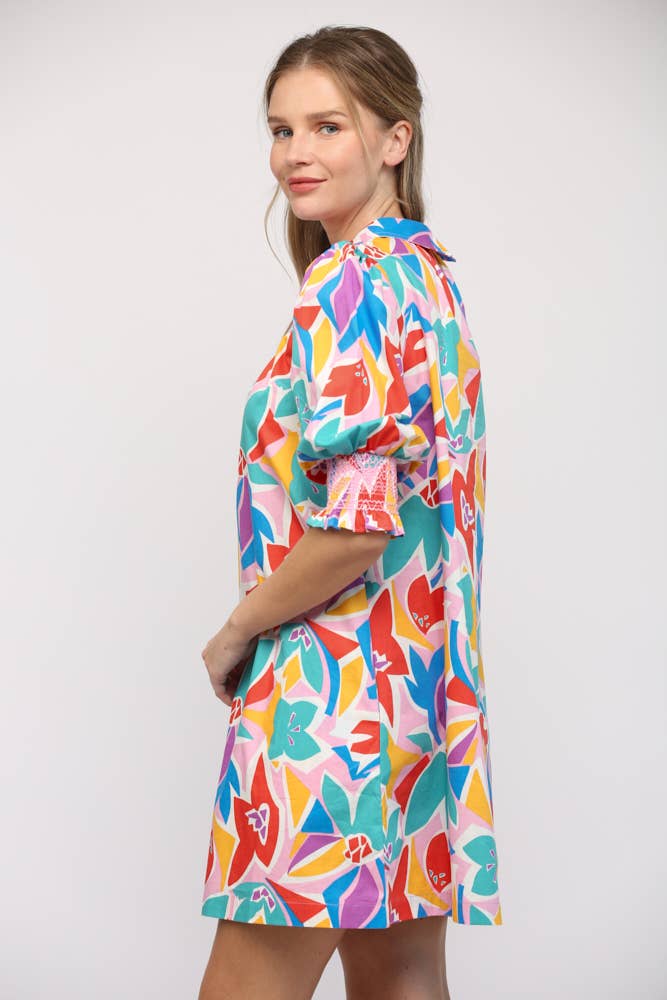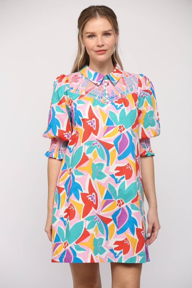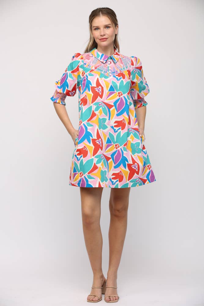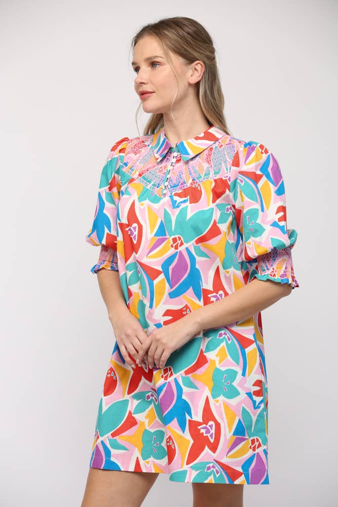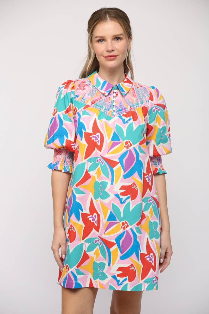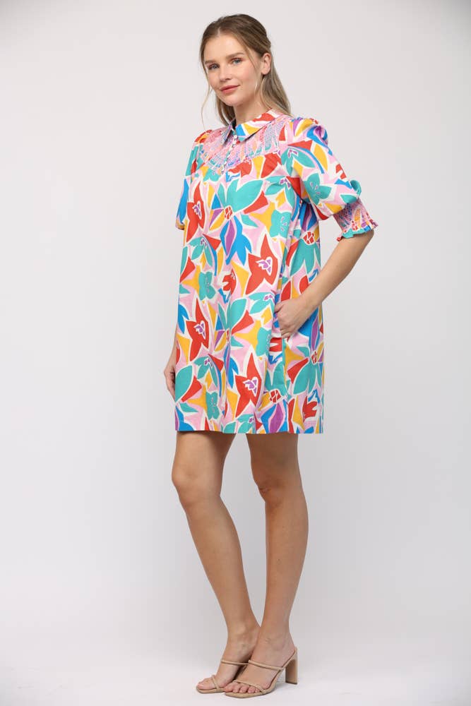 SMOCKED YOKE AND CUFF SHORT PUFF SLV DRESS 100%COTTON