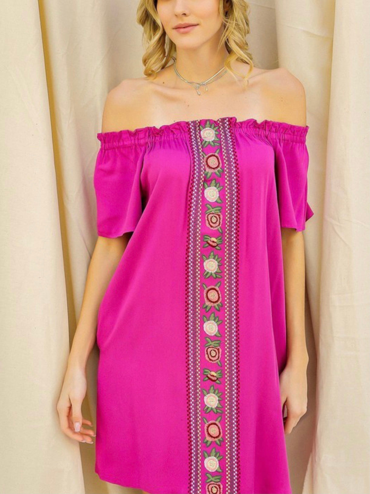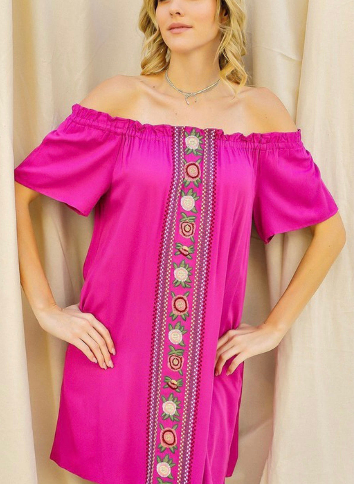 This is an adorable embroidered dress in a gorgeous pink! Easy fit. Can be worn on or off the shoulder. Looks great with flip flops or with wedges.