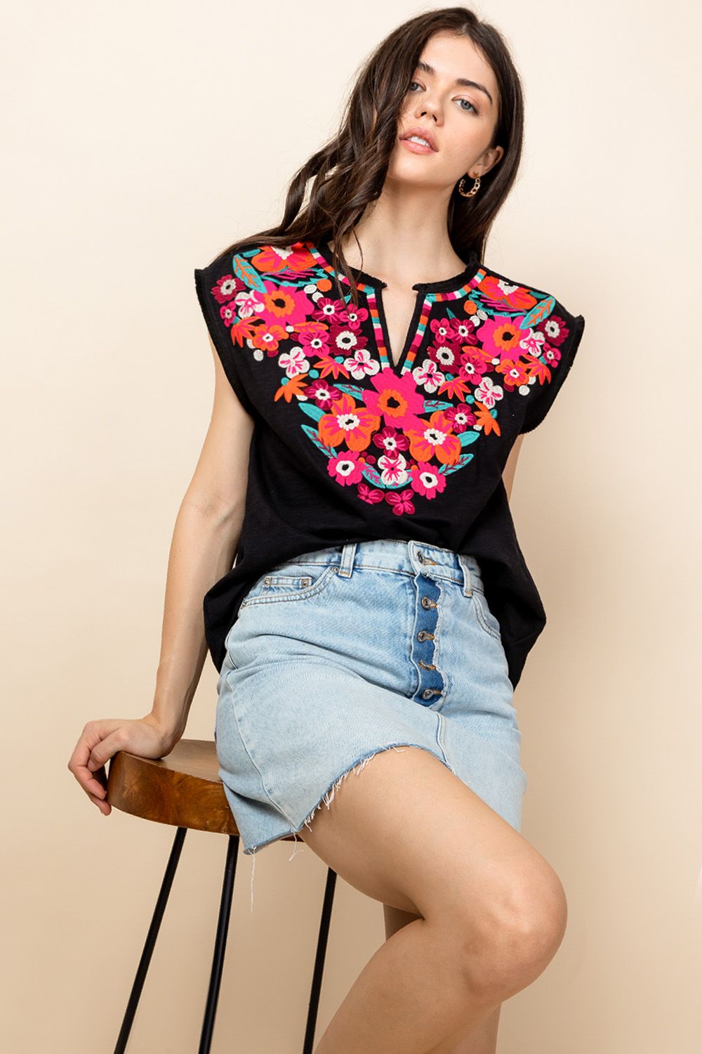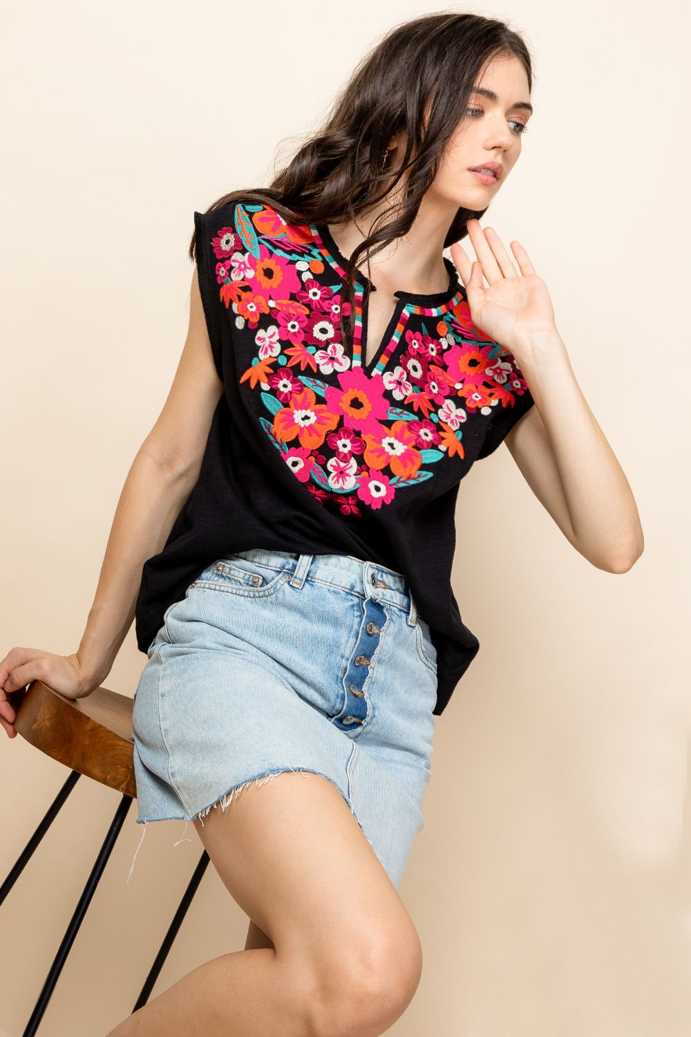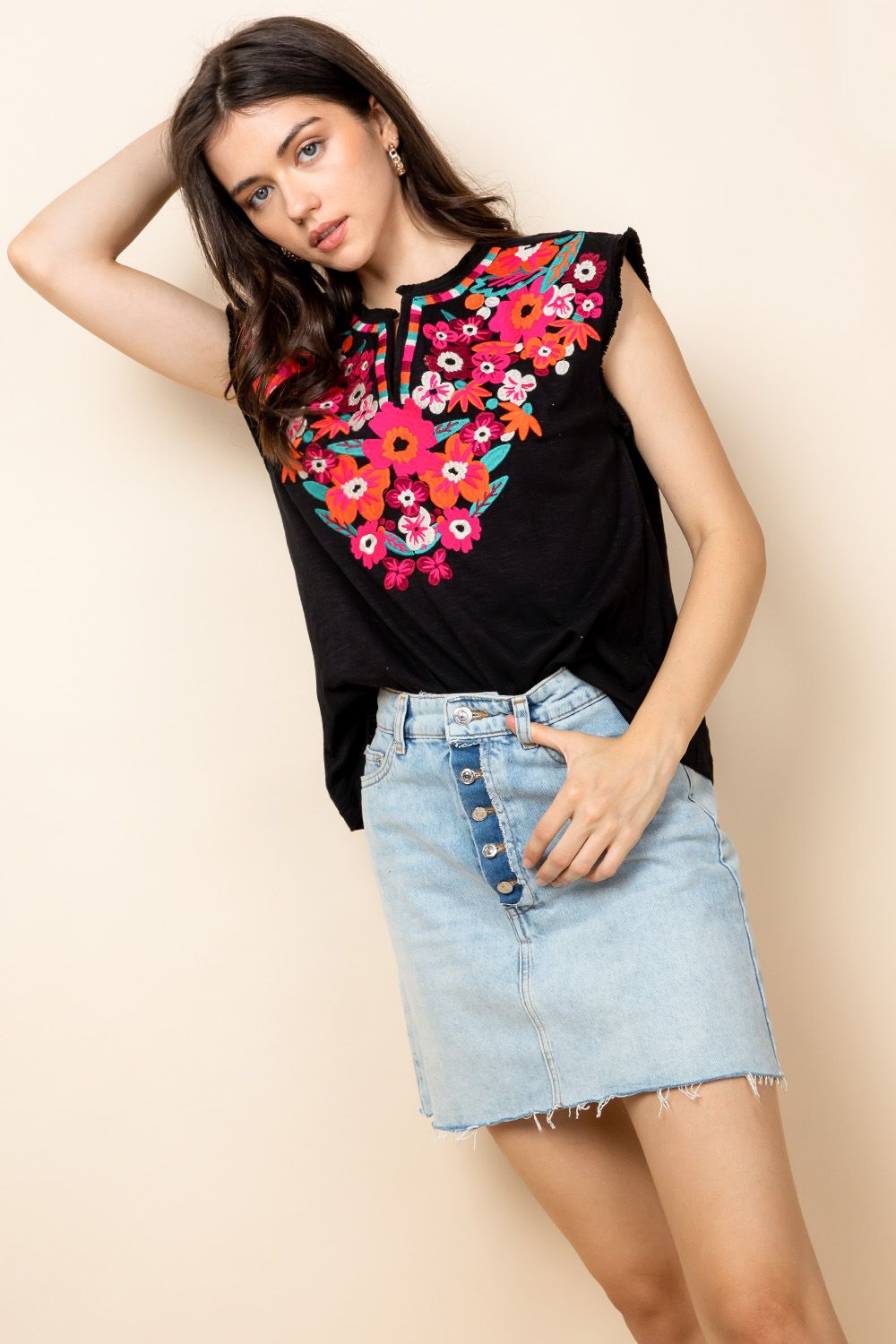The cutest knit top with pops of color & top of the line embroidery on basic black knit. This top dresses up basic denim or looks great with casual cut-offs. The fringe detailing on the neckline makes this top easy to wear & on trend.