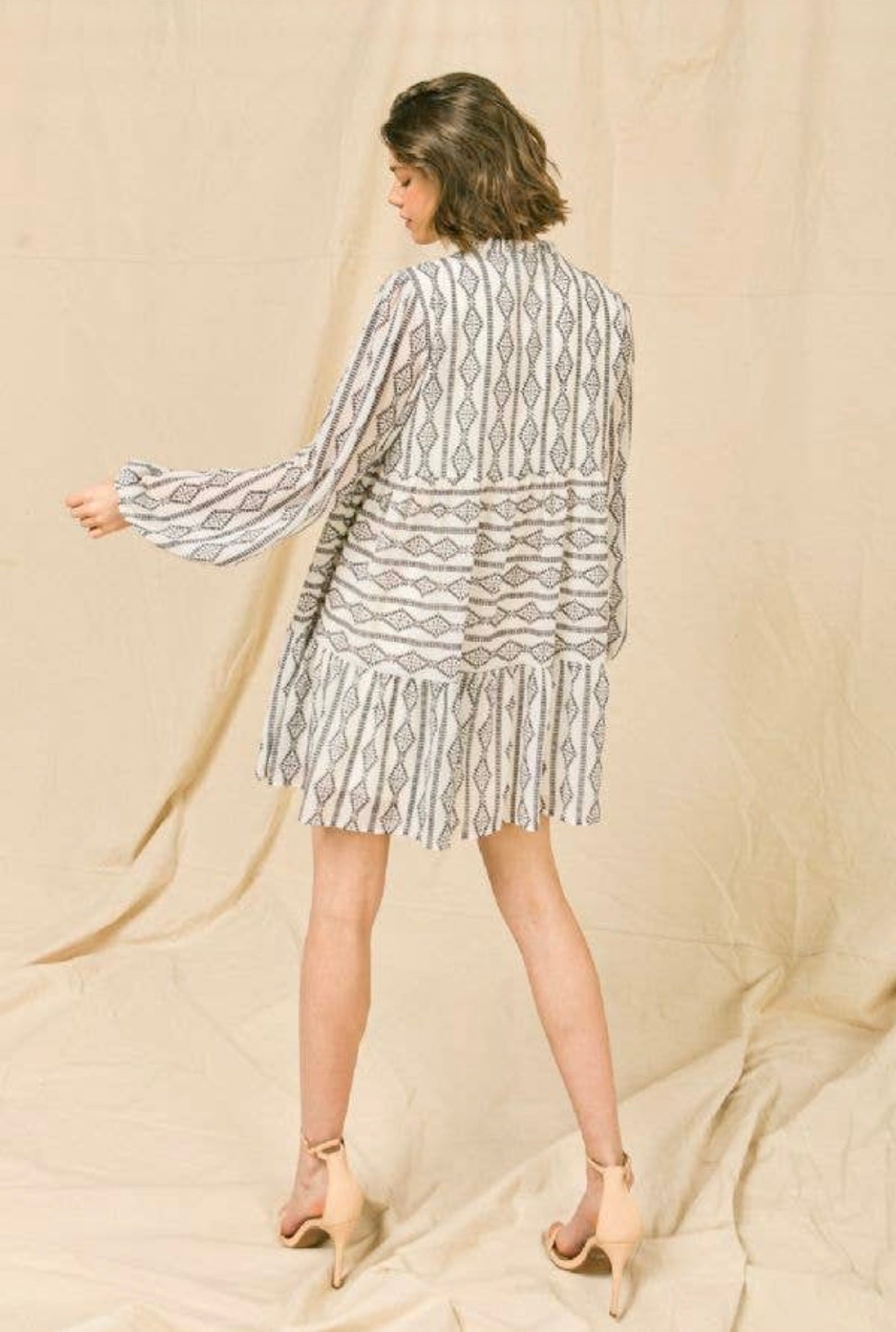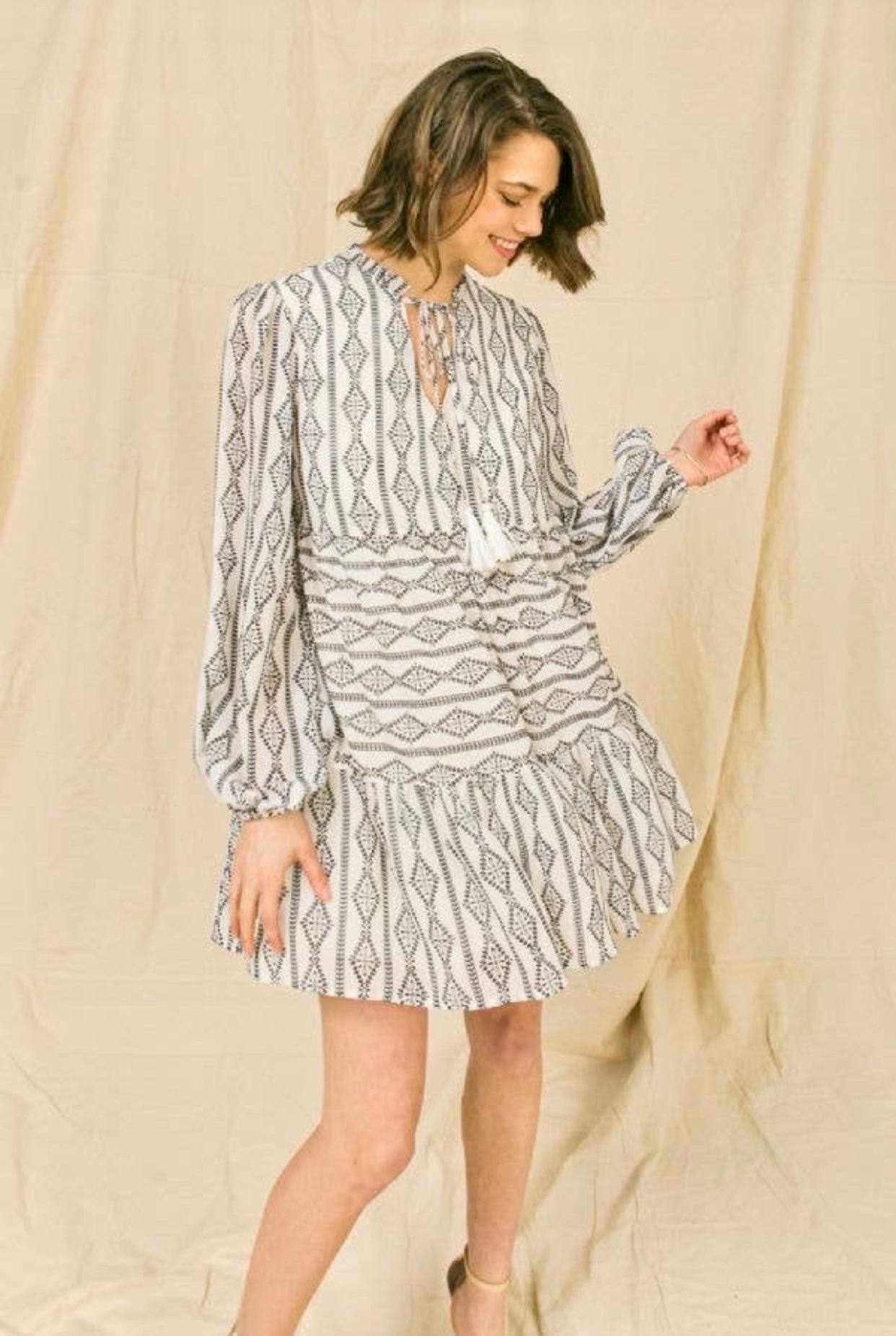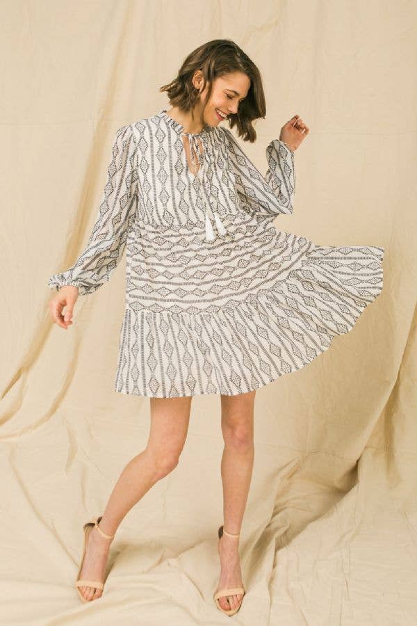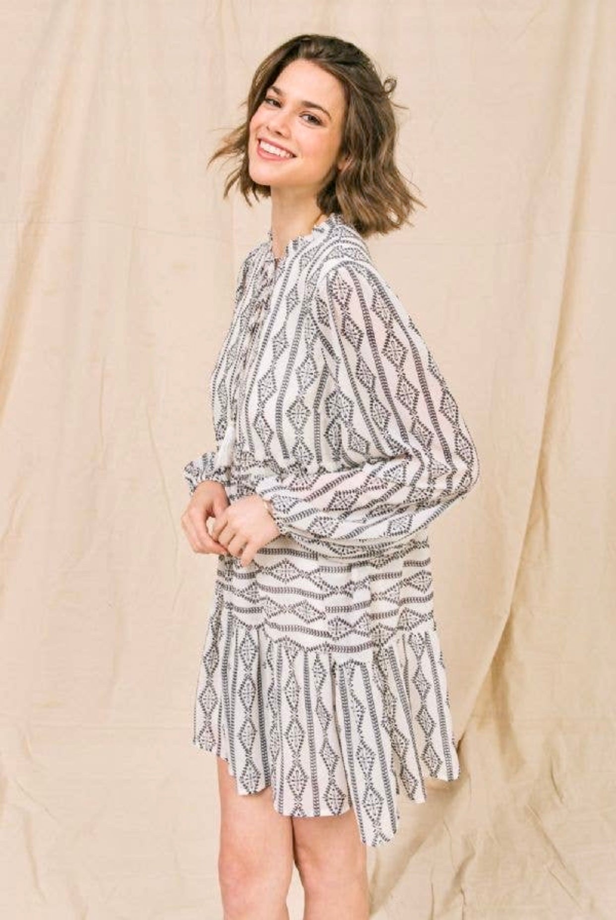 A printed woven tunic/mini dress featuring round neckline with mini ruffled edge and tie/tassel, peasant sleeve and tiered body Details Self: 100% Polyester Lining 100% Polyester Size & Fit - Model is 5`8" And Wearing Size Small - Measurements Taken From Size Small - Approx Length: 35"