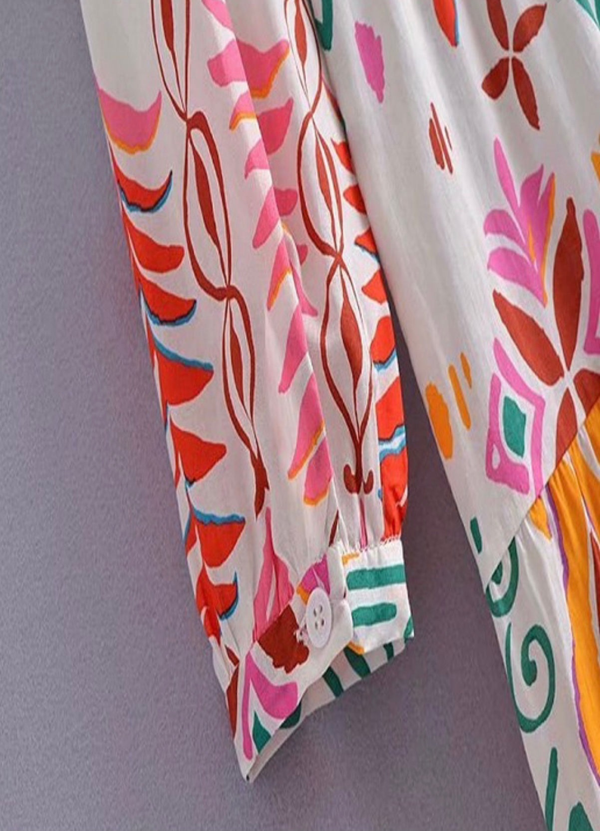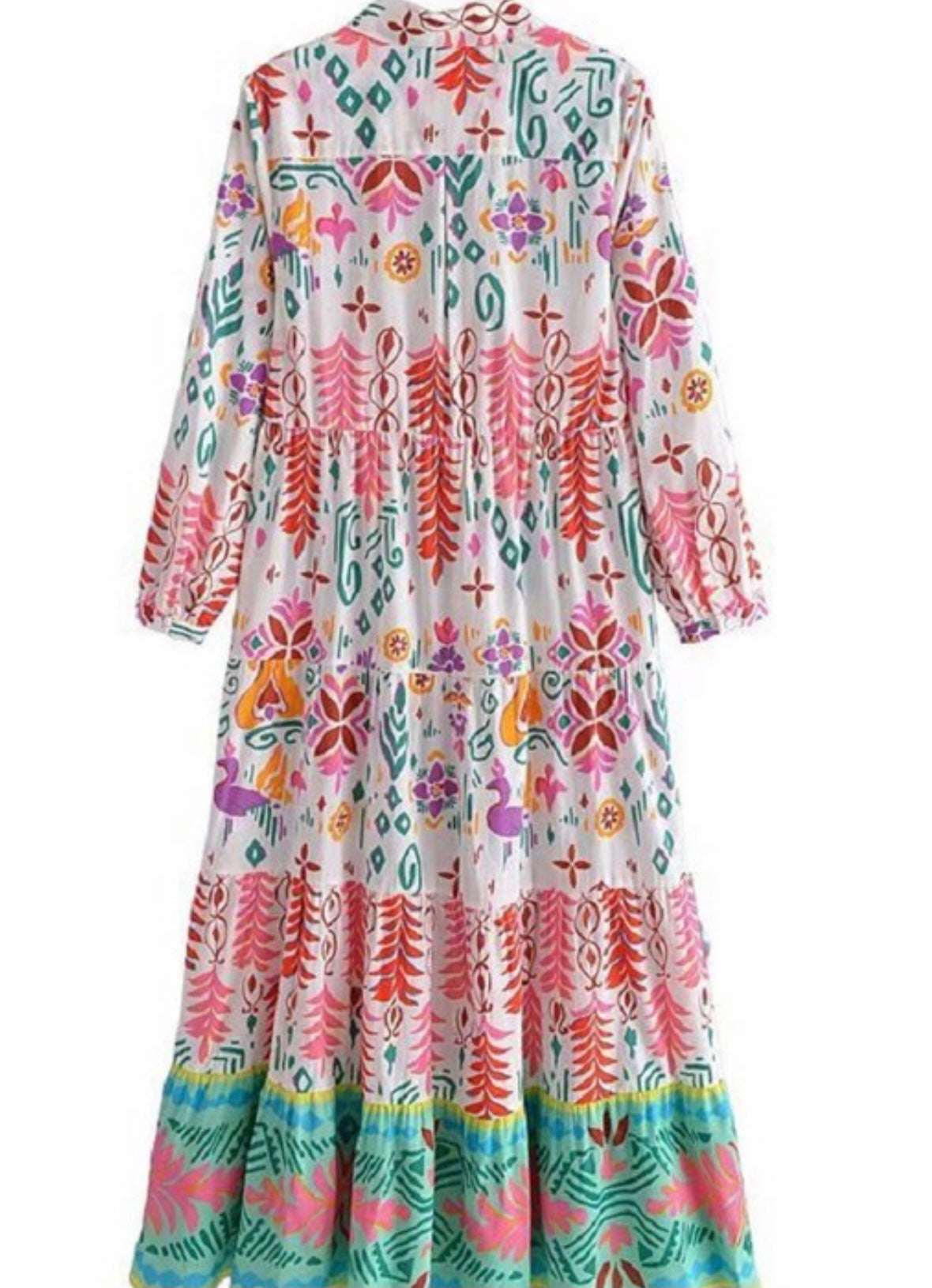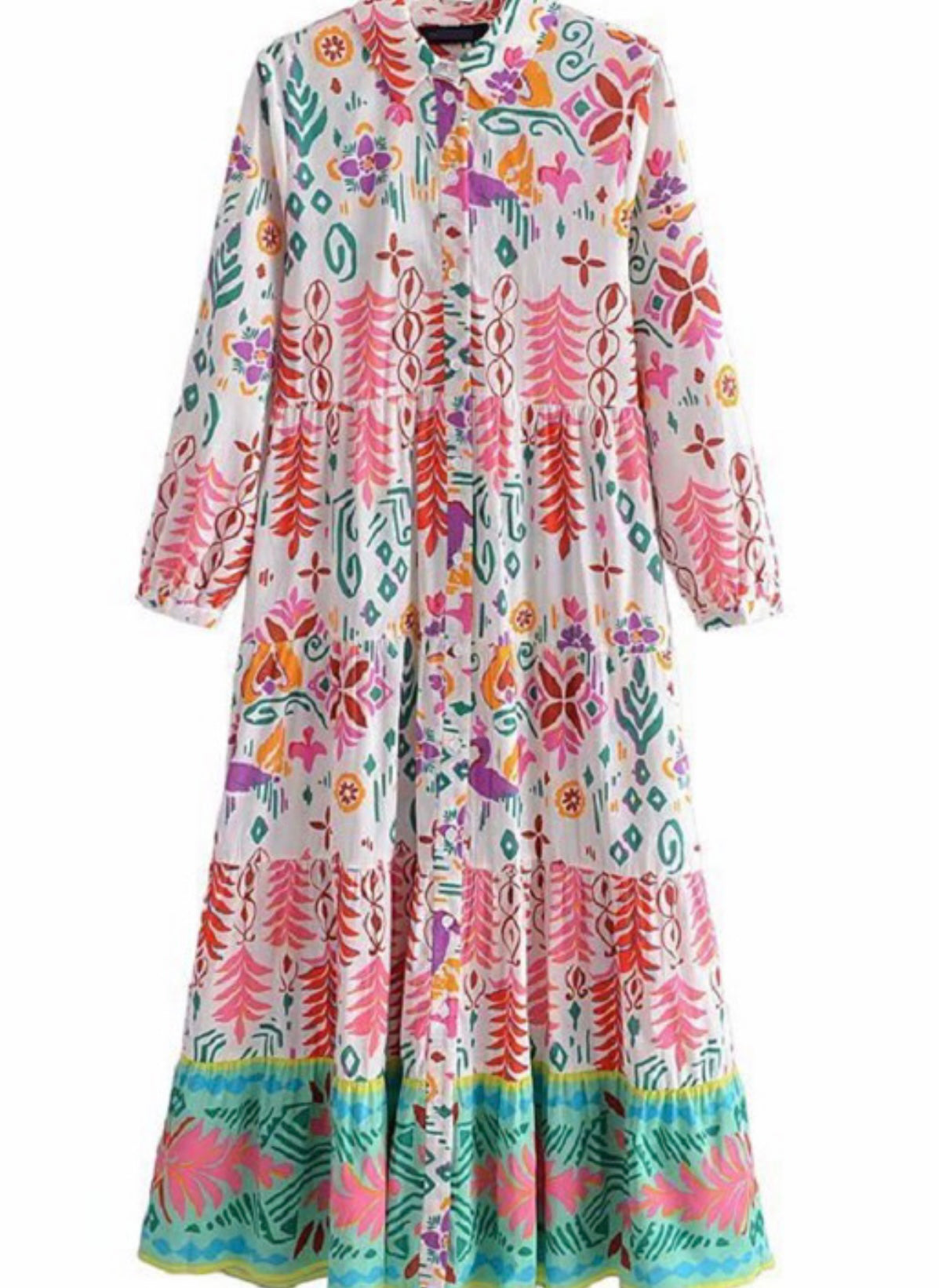 Long sleeved, button down, relaxed fit dress with bold color & a fun print. Pair with minimal accessories & heels, sandals, or boots. Style with a belt for a more fitted look, or wear as-is for comfort with an upgrade.