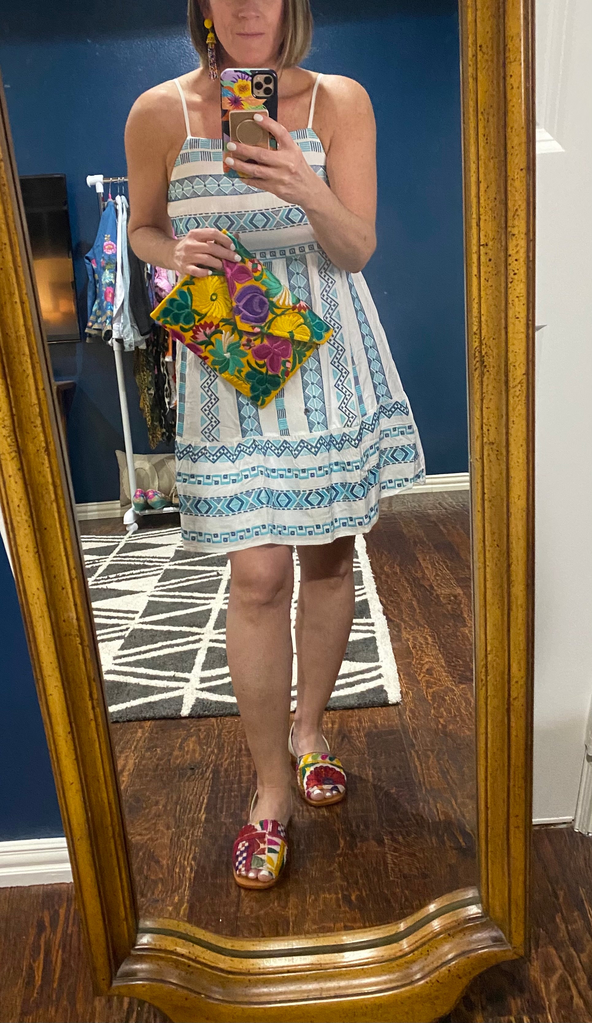 This dress is one of a kind! I ❤️ the geo inspired embroidery, adjustable straps, Grecian style, and gorgeous blue and white combo. Non sheer, lined, woven. This is going to be so good all summer long!