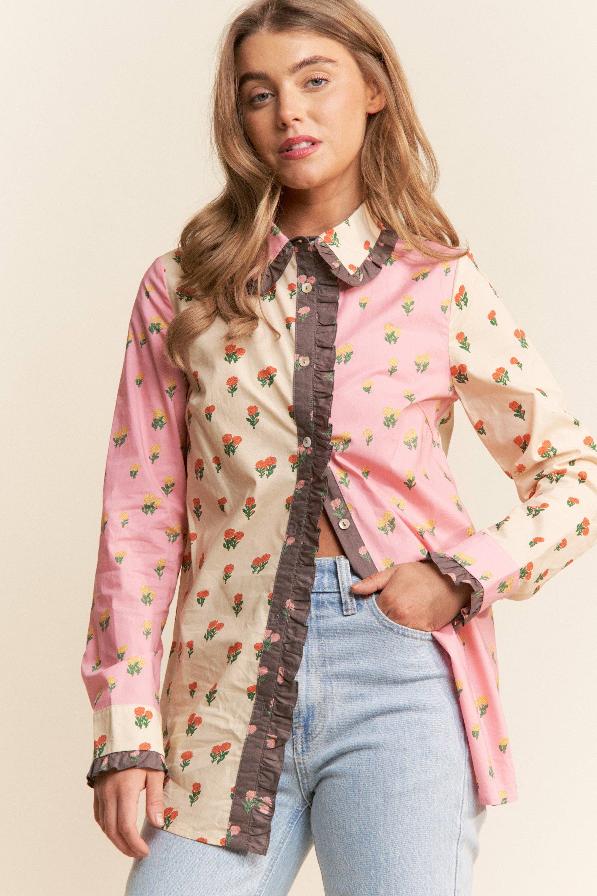 Women's button up long sleeve blouse. Floral pattern and color block design. Pleated ruffle hemline on the sleeves and button hemline.