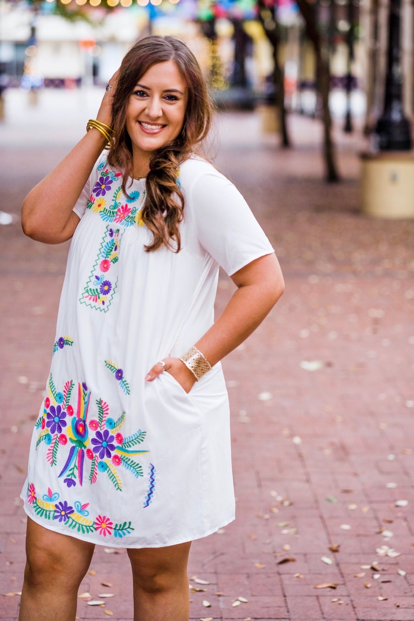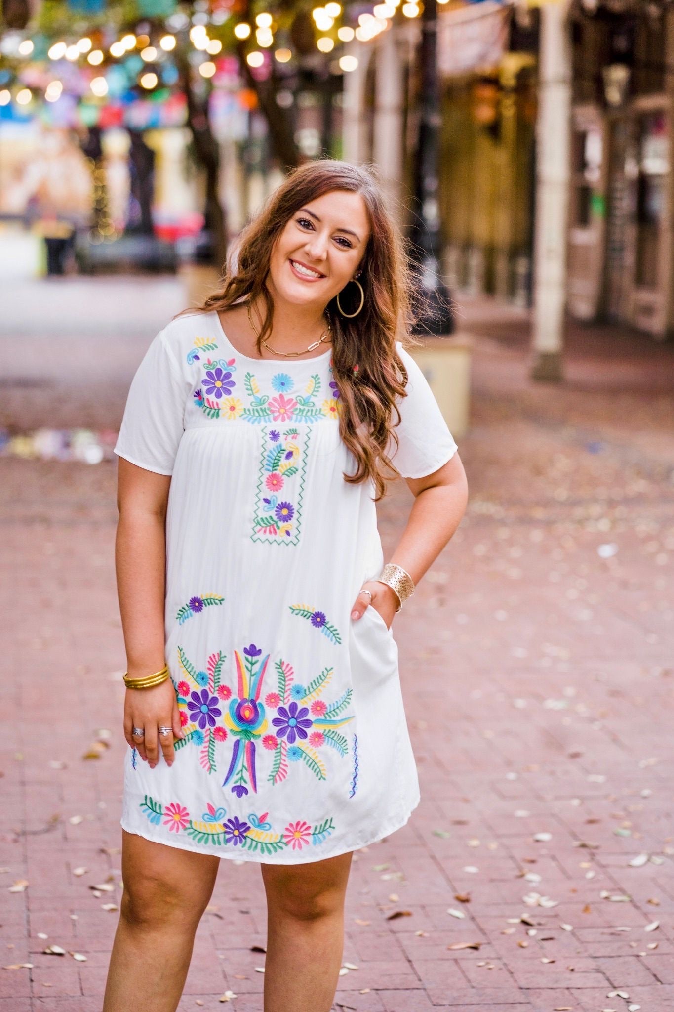 The Jackie Dress is a must have dress for everyone this spring and summer! Whether it is a bridal shower, baby shower, family beach pictures or just a fun dress to wear to the pool, you will want the Jackie Dress hanging in your closet this season! The Jackie Dress is white rayon but have no fear she is lined so she will not be see through. She features the prettiest pastel embroidery of pink, purple, turquoise, yellow and green and of course has two side pockets. I am wearing the small in the pics so size accordingly. I am generally a size 8 so this one runs generously & looks so good with a denim jacket.