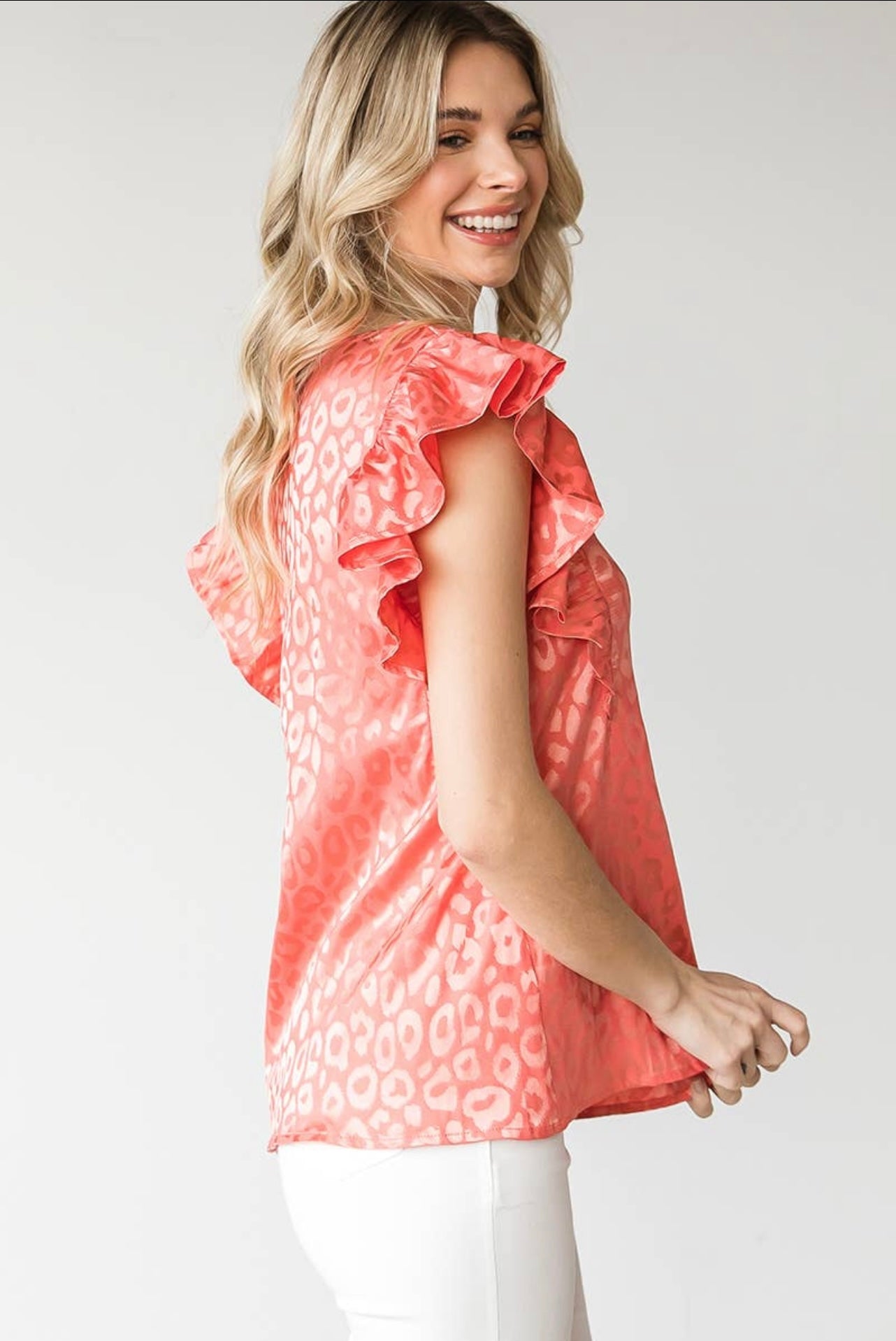 I love a great shade of peach for warmer weather! Satin leopard print top with ruffle cap sleeves. - Unlined, non-sheer, lightweight. - Model is 5'8'' and is wearing a Small. Get that summer tan ready because this color is amazing! This has a more true to size fit. Not flowy or oversized so order your normal size.