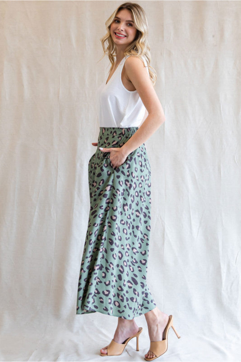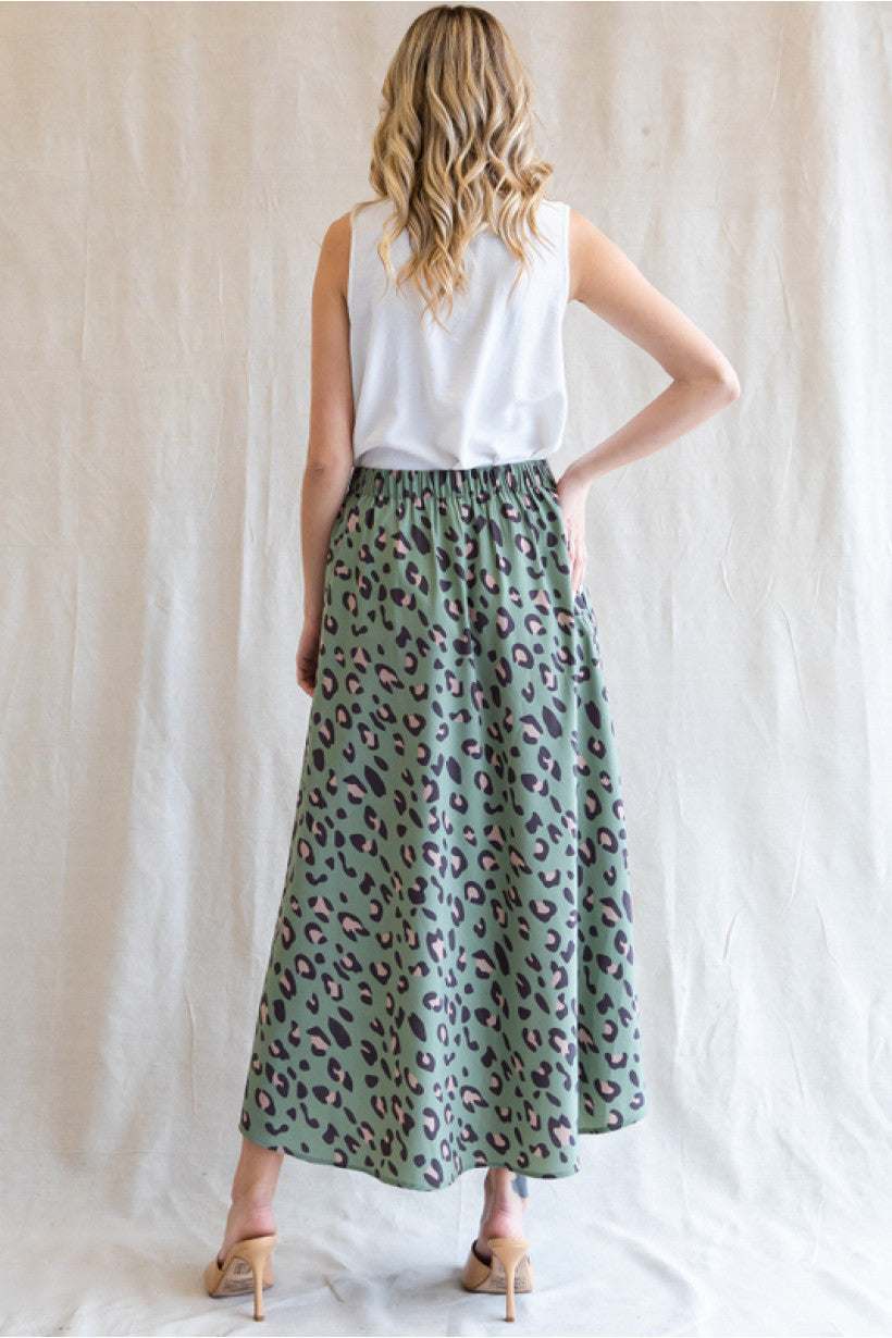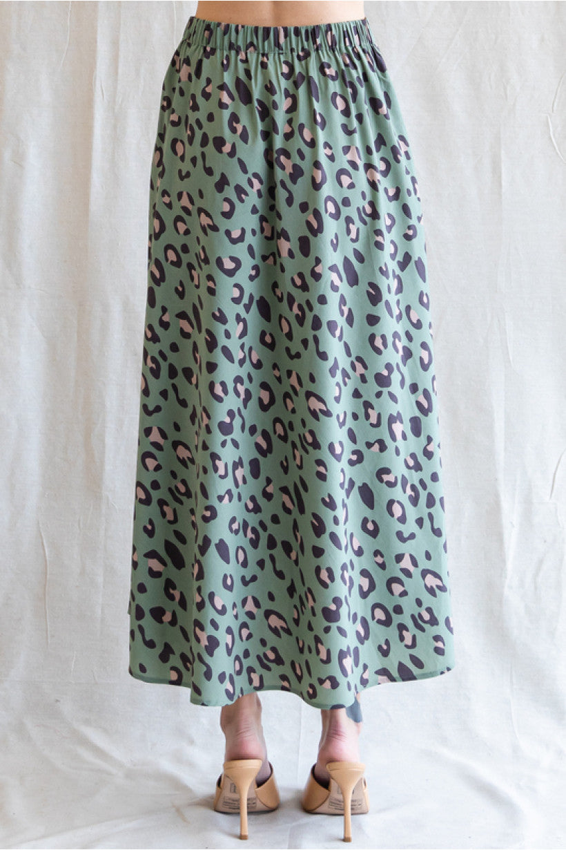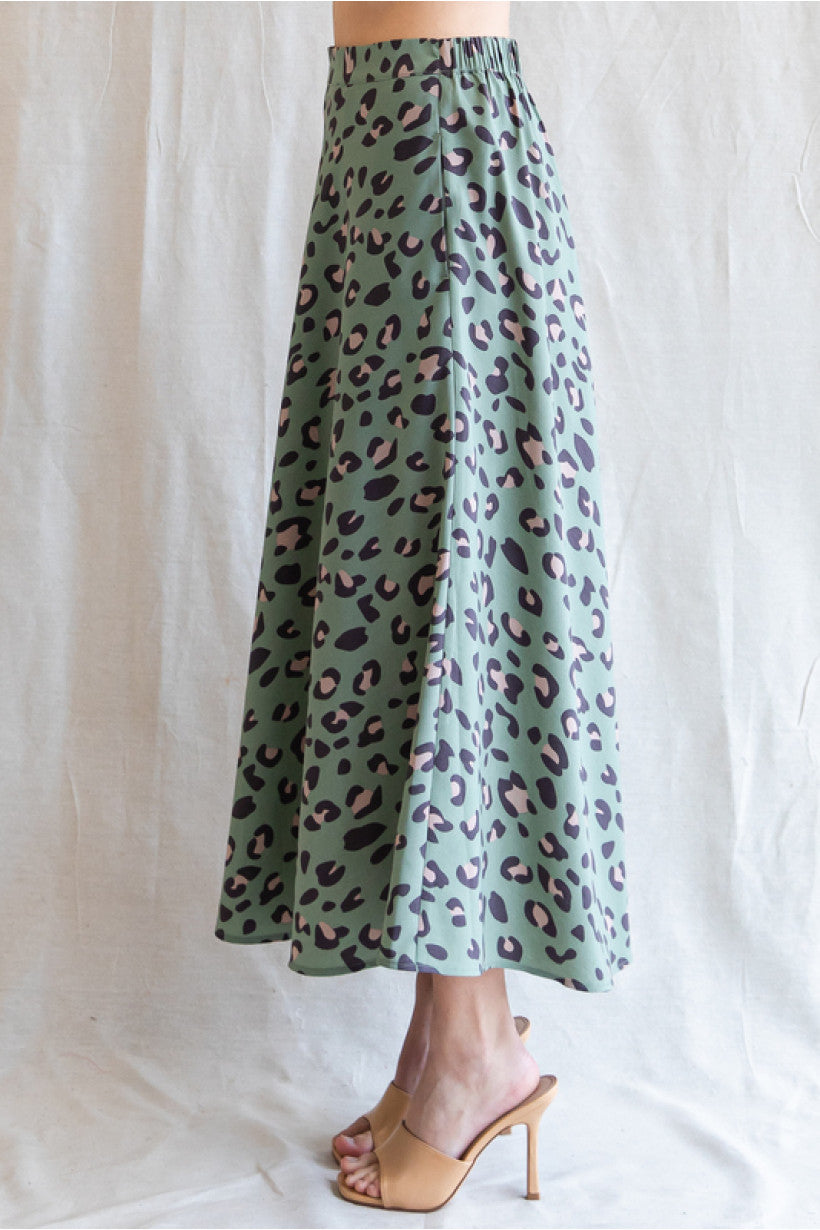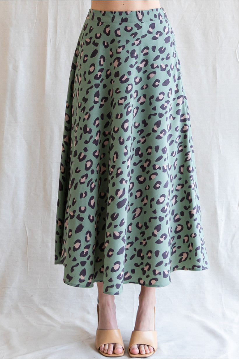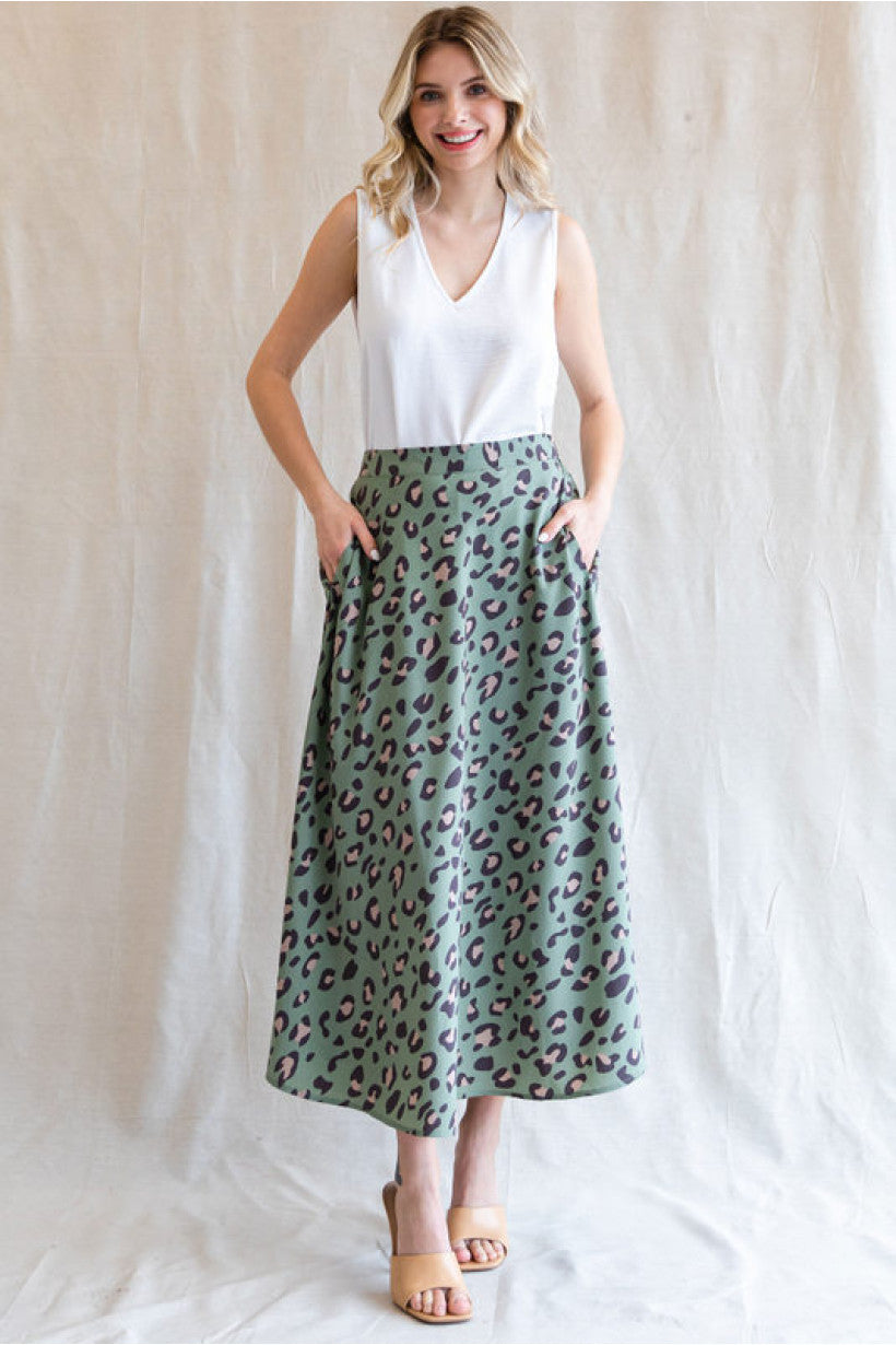 Leopard print circle skirt done in sage with back stretch-band waistline, and side pockets.