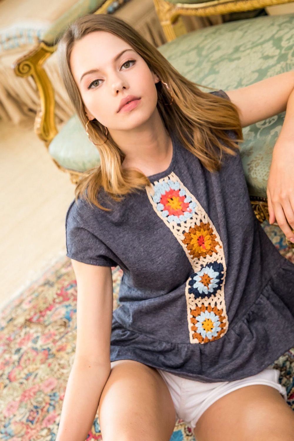This washed navy peplum knit top has crocheted flower accents and a soft feel. Love the uniqueness of the design and the comfort of this amazing top!