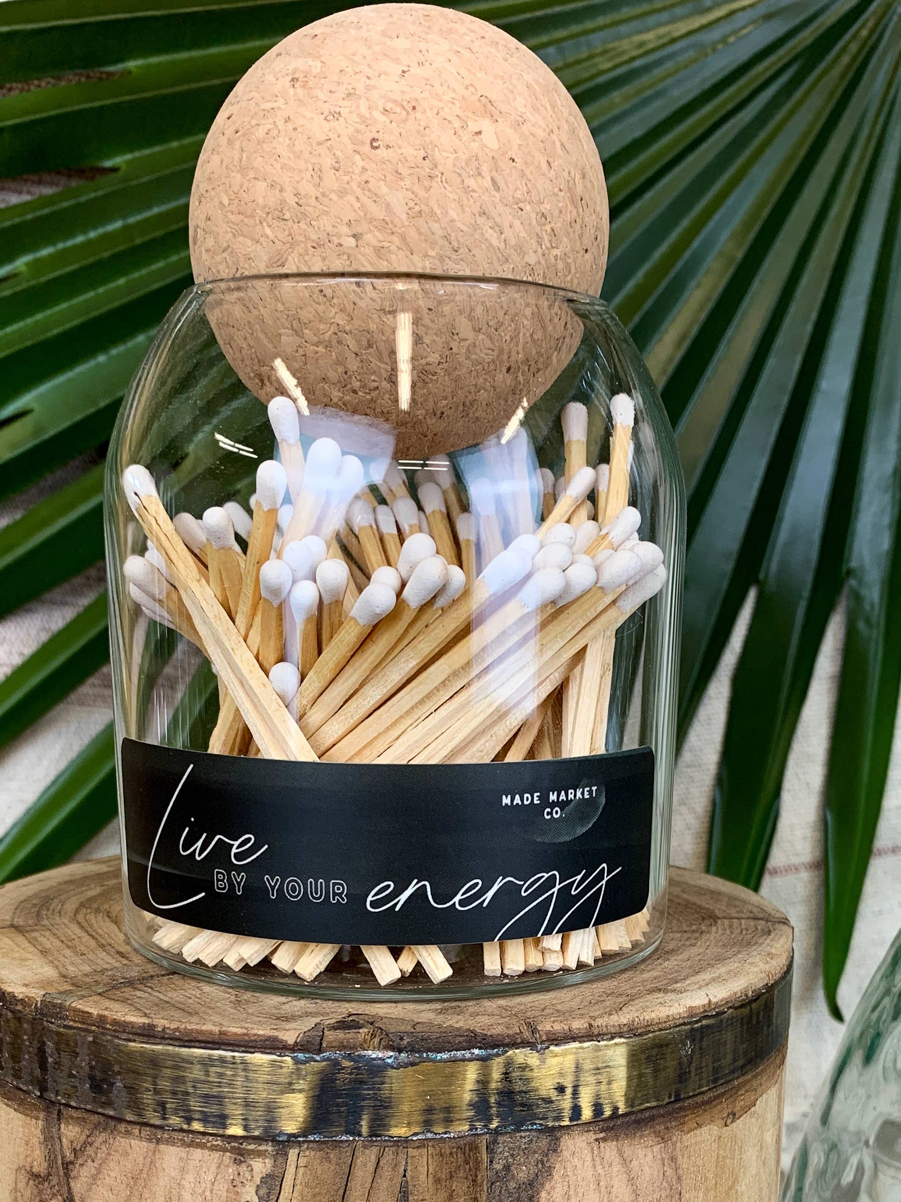 This boho inspired vessel is your decor goals for 2022. Our New Terrain Collection has an energy of it's own! The color collection is all about bold natural colors found in the terrain. A functional striker is included all for you to seamlessly enjoy time & time again. Each bottle is handcrafted with the upmost care & attention to detail by our family. • 5.5" tall x 3.5" wide vessel (with cork top) • 110 matchsticks at 3 1/2" tall • unique cork ball topper • striker on vessel