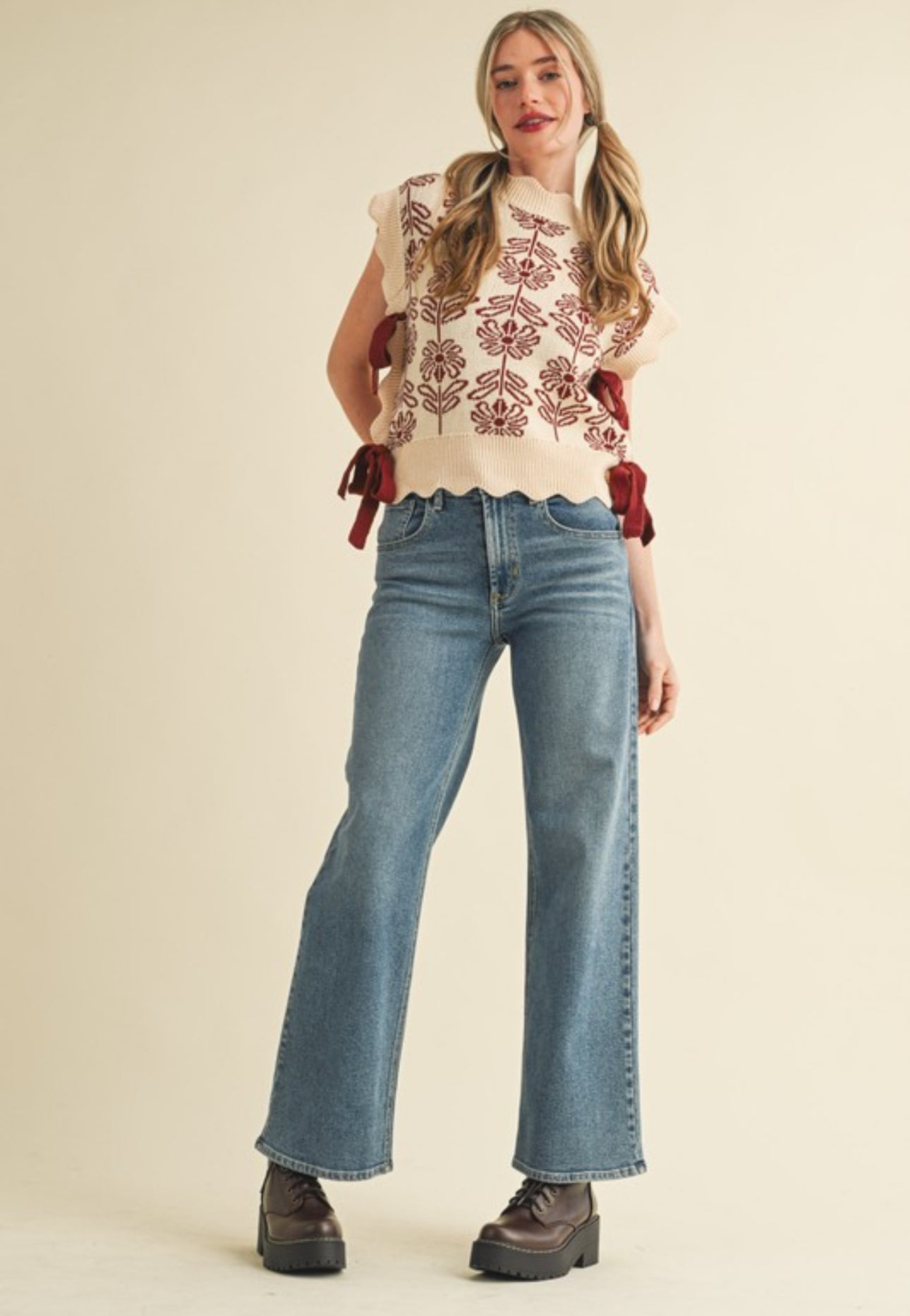 Add an effortless touch to all your fave 'fits with this floral chocolate brown & cream sweater vest! Cozy knit shapes this trendsetting sweater vest that has floral knit design, a scalloped mock neck, and contrast knit ties on the sides. Scalloped edges add a unique accent to this versatile sweater vest! + Mock neck floral sweater vest + Ribbed scalloped mock neck, hem and sides + Floral knit design + Contrast side ties + Model is 5' 10.5” 32-24-36 and wears a S