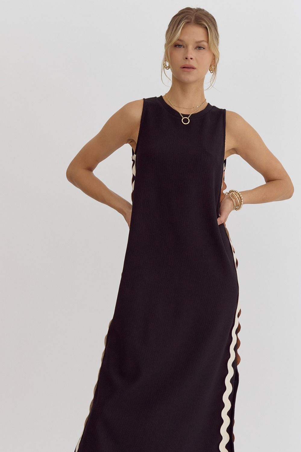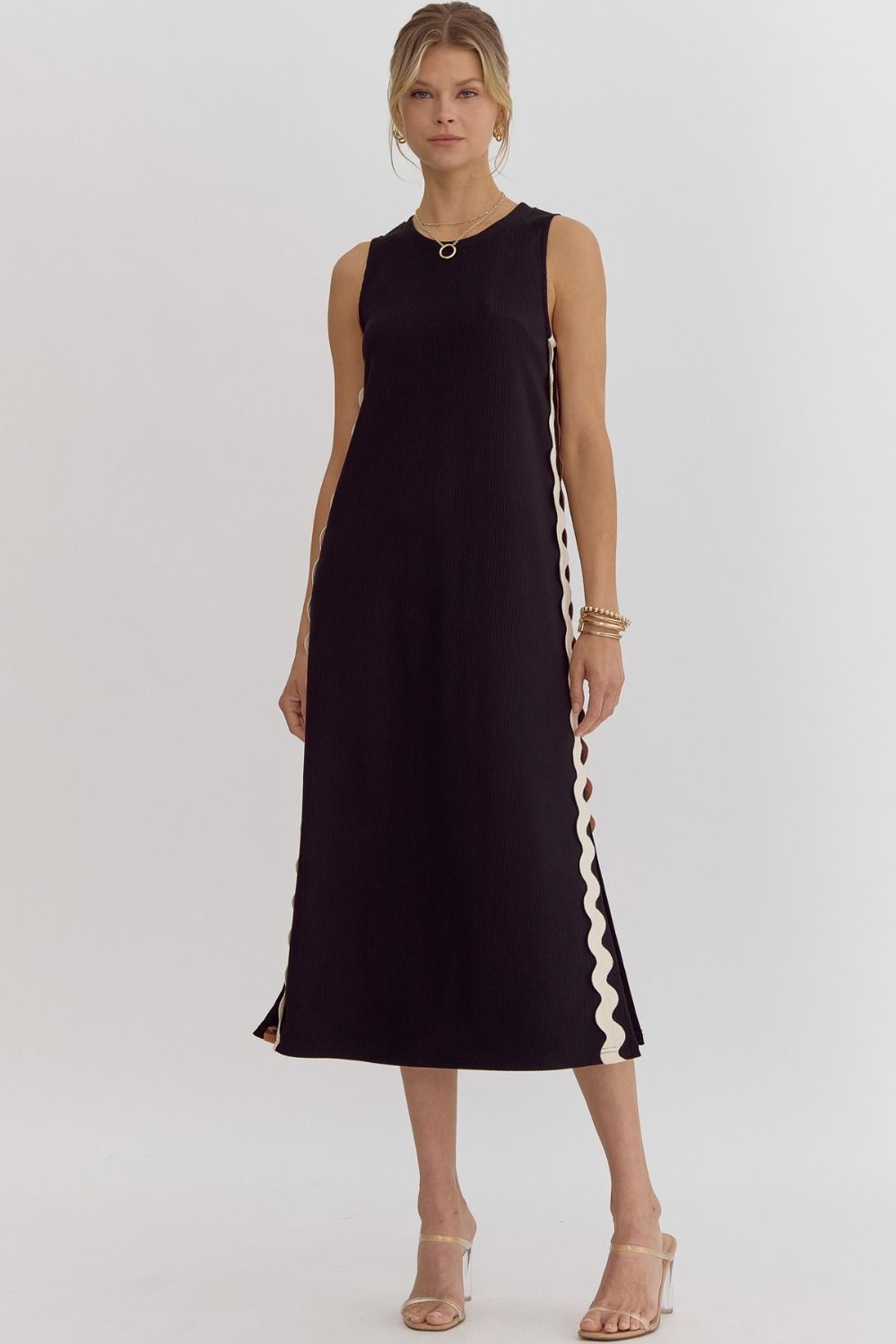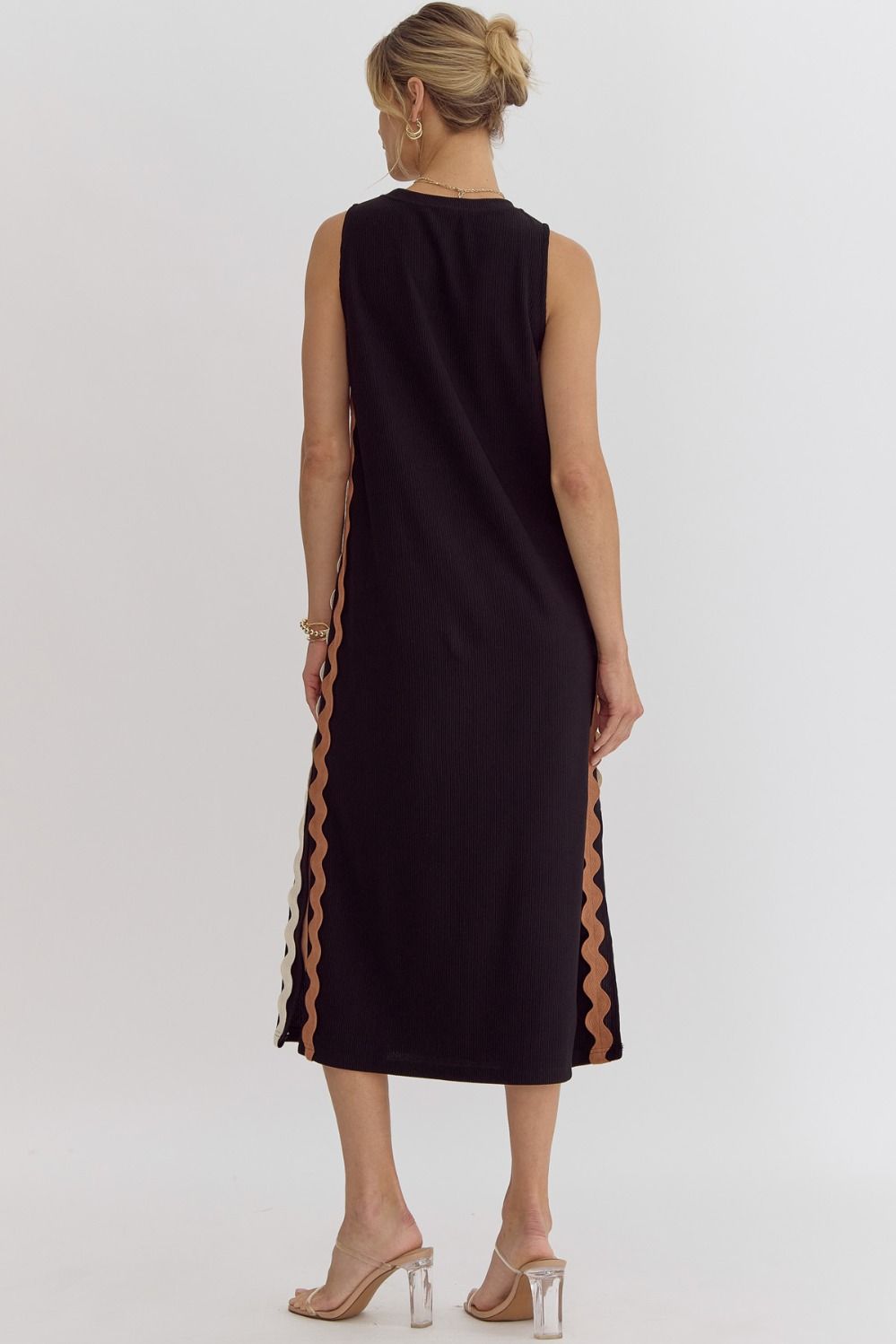 Solid ribbed sleeveless midi dress featuring ric rac trim at sides. Slit at sides. Unlined. Knit. Non-sheer. Lightweight.