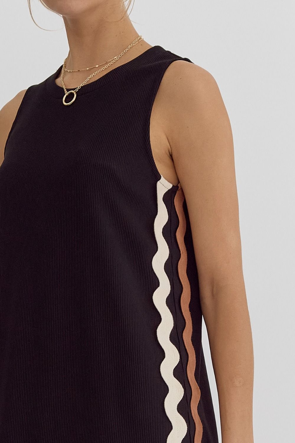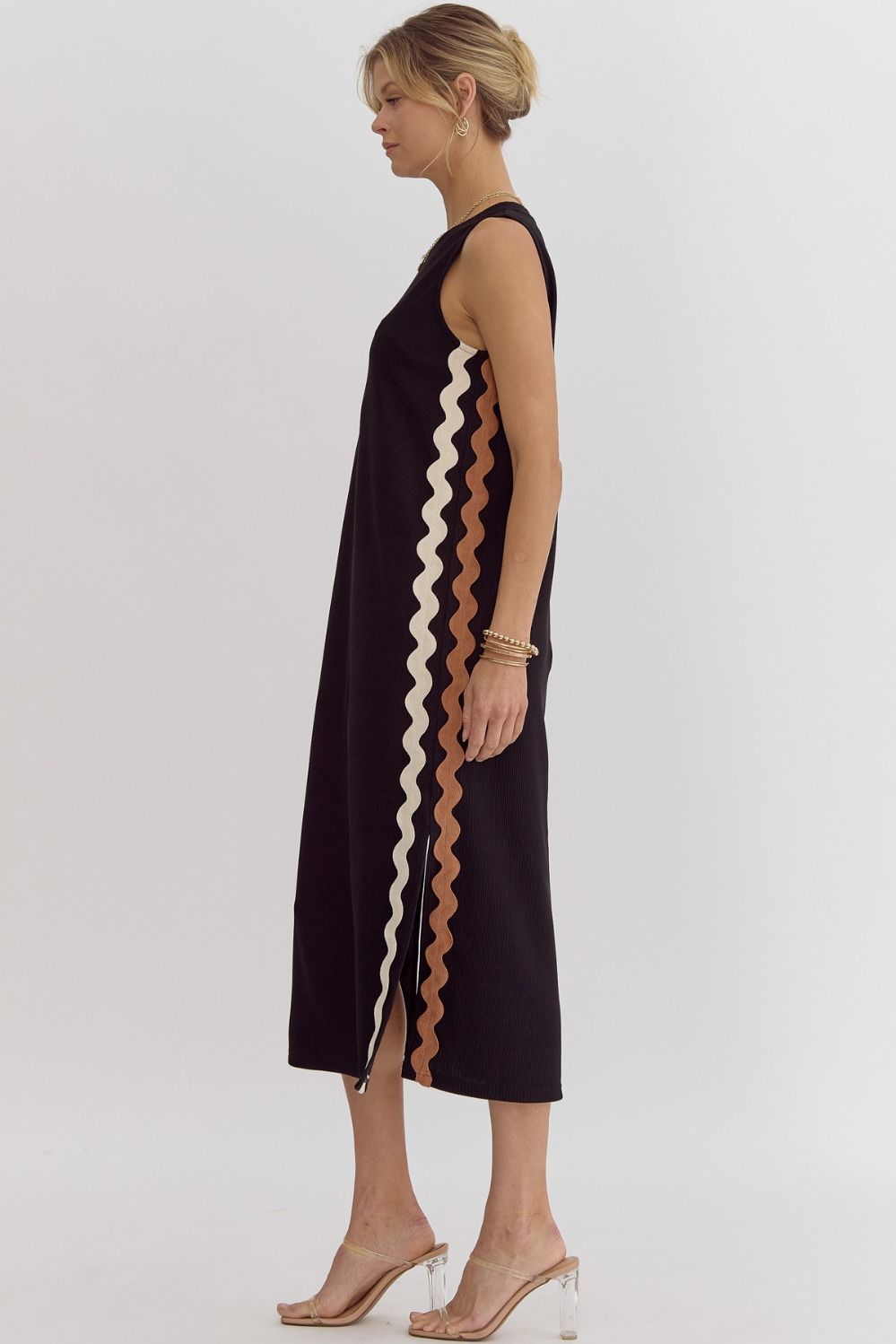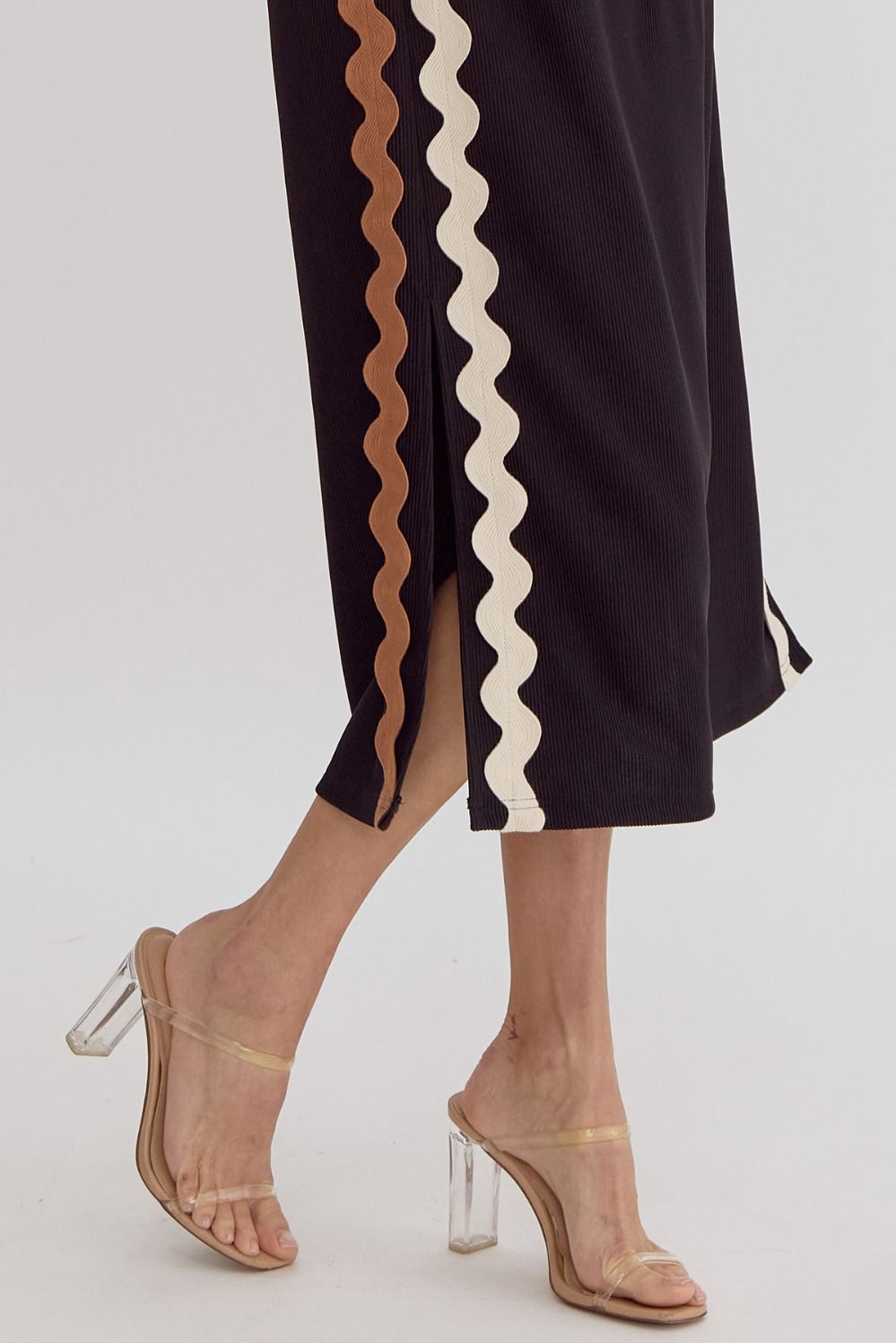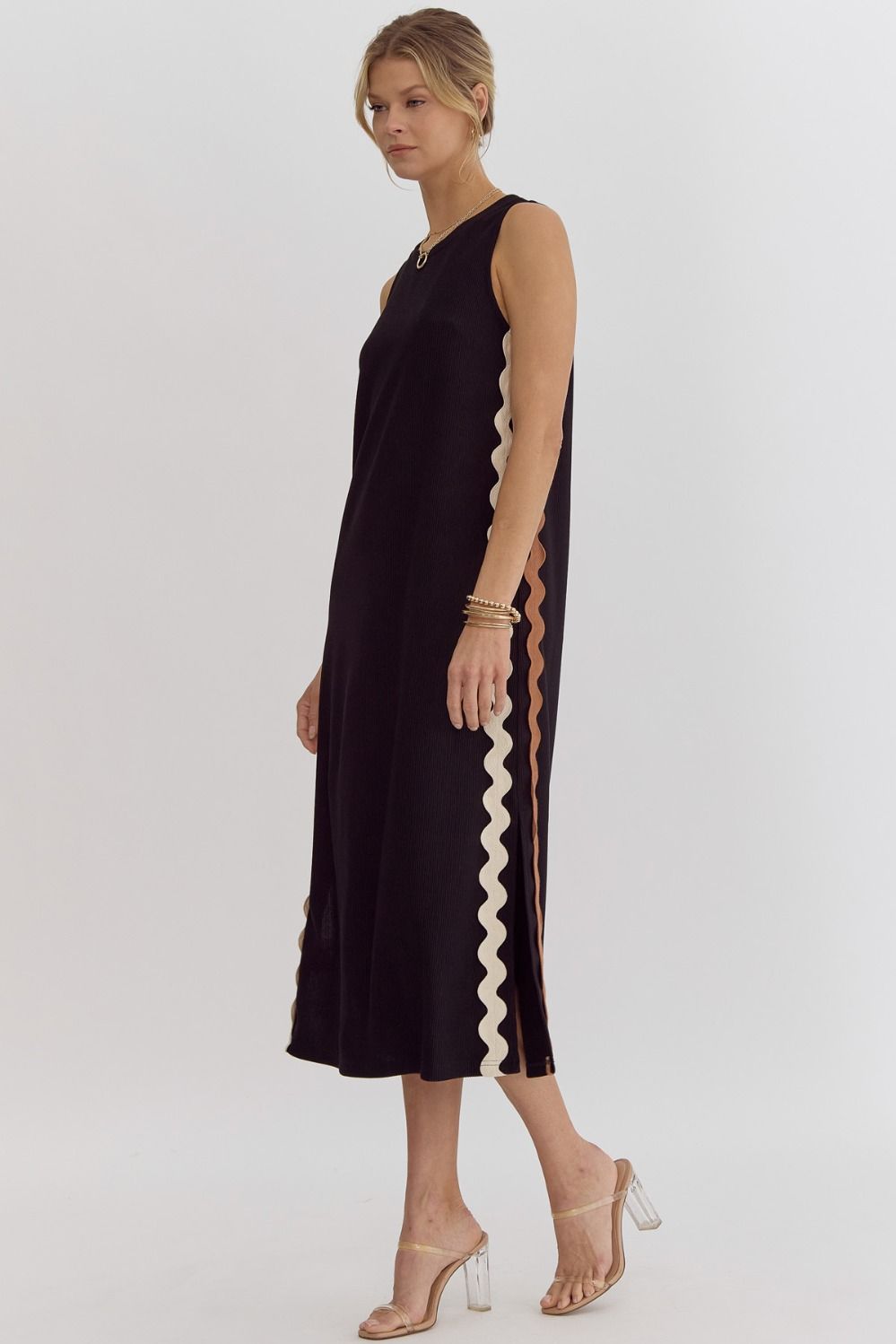 Solid ribbed sleeveless midi dress featuring ric rac trim at sides. Slit at sides. Unlined. Knit. Non-sheer. Lightweight.