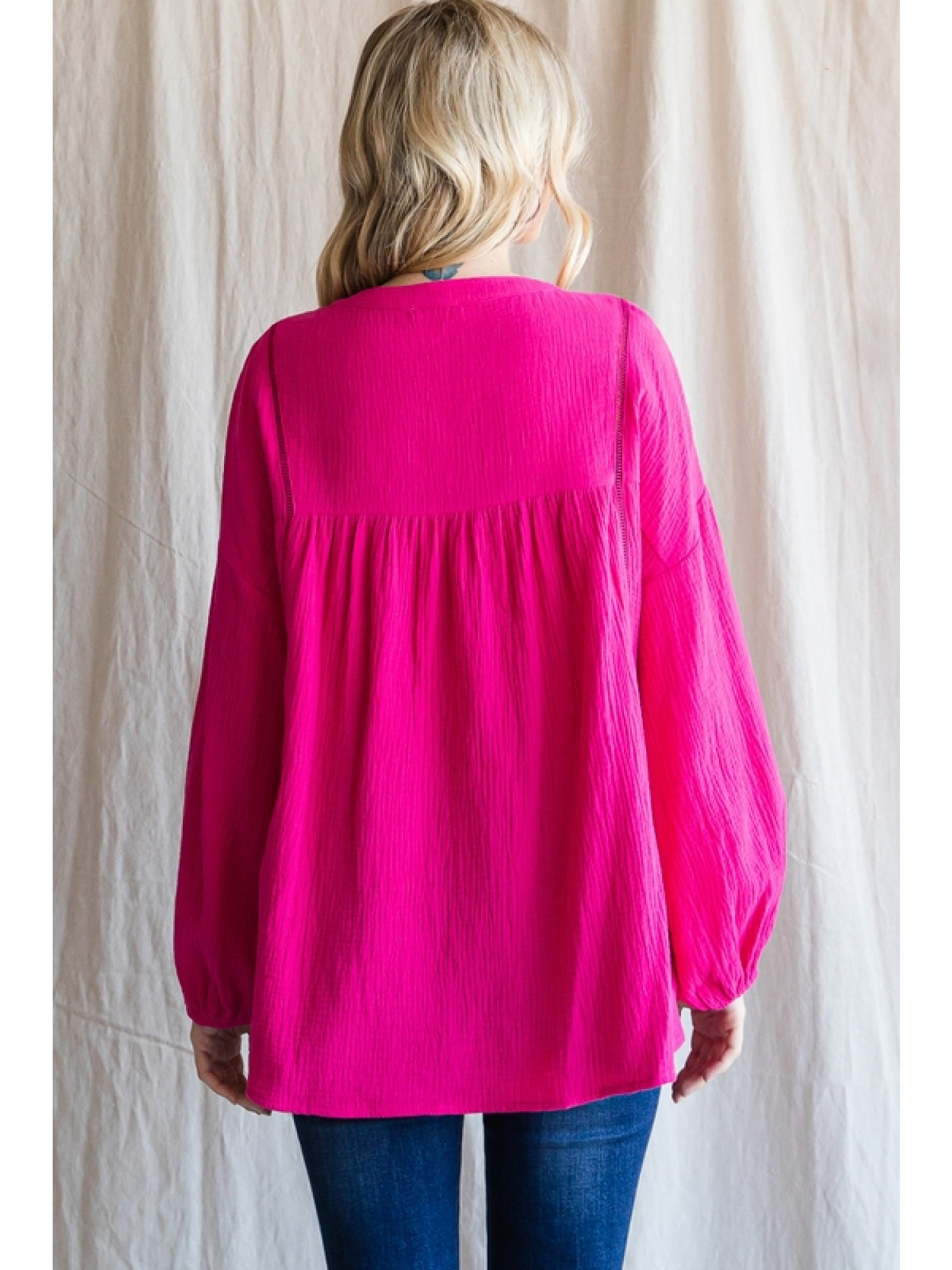 Solid top with long bubble sleeves and an embroidered yoke featuring a tassel tie keyhole.