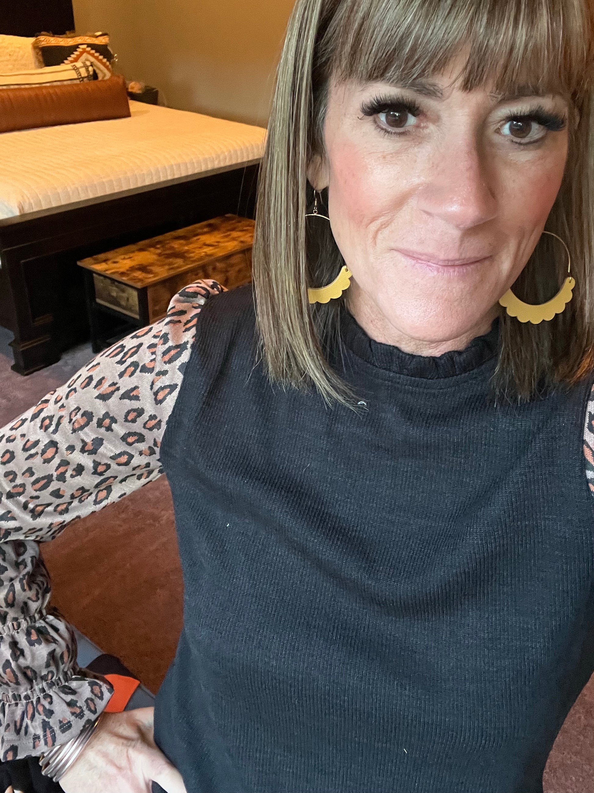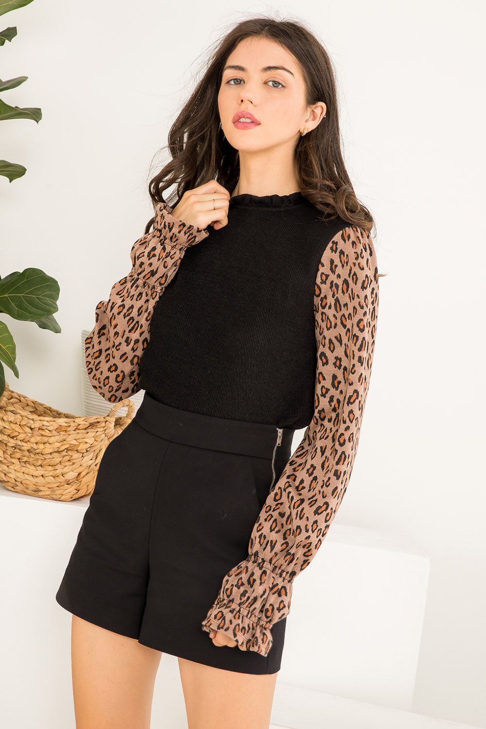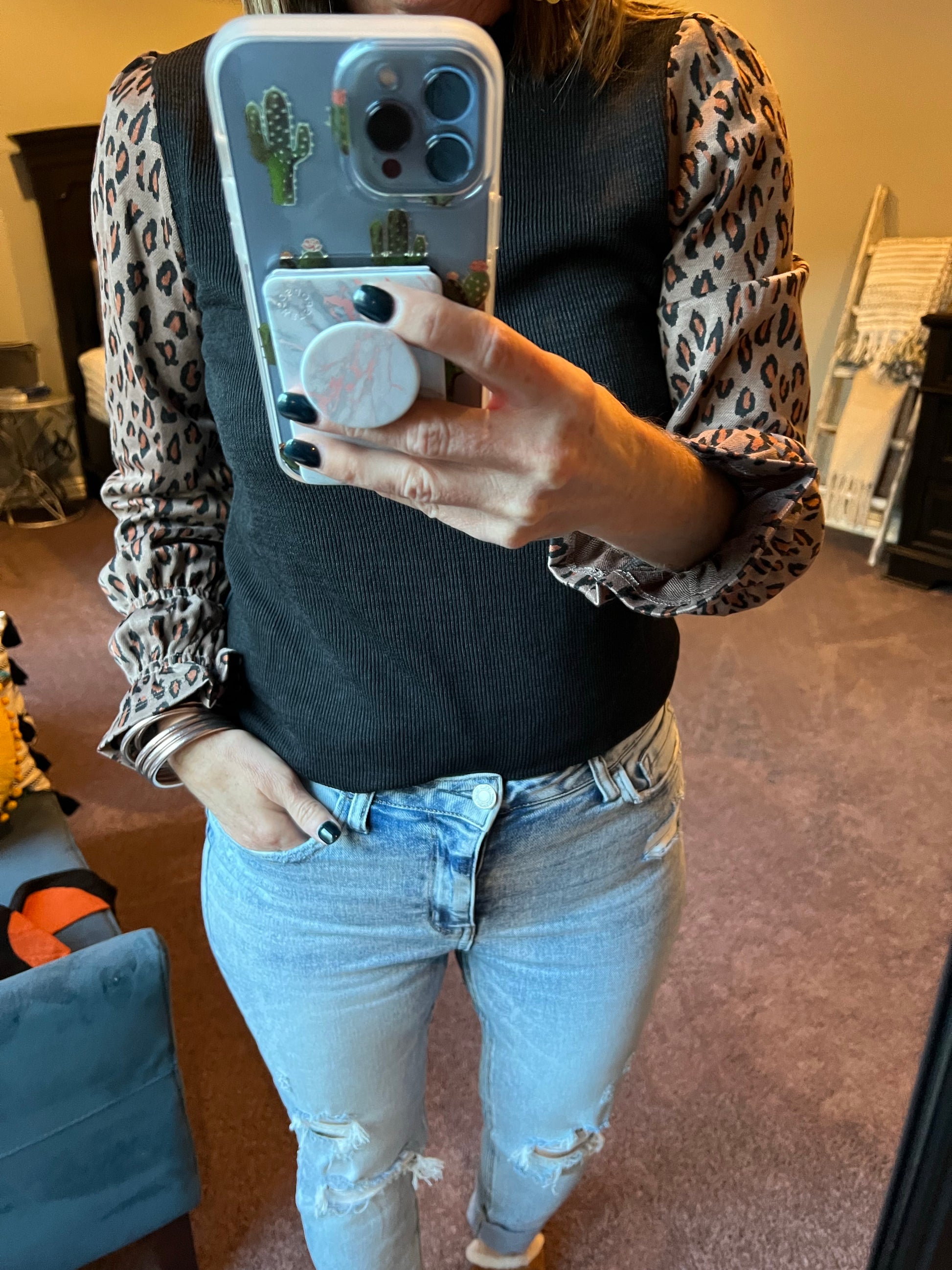 This knit top is an adorable way to dress up basic denim. The sleeves MAKE the top with elastic banding at the wrist and slight ruffle details. Runs small! Size up.