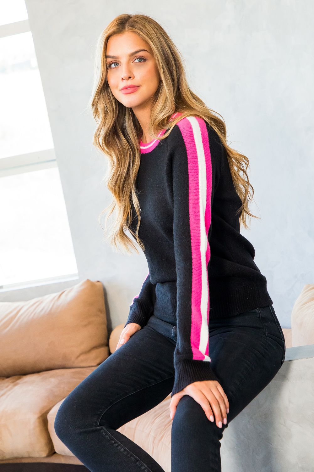 A cozy sweater from THML that will keep your casual Fridays classy. Basic black with a pop of pink & white stripe down the sleeve & around the neckline. Grab this one before it’s gone!
