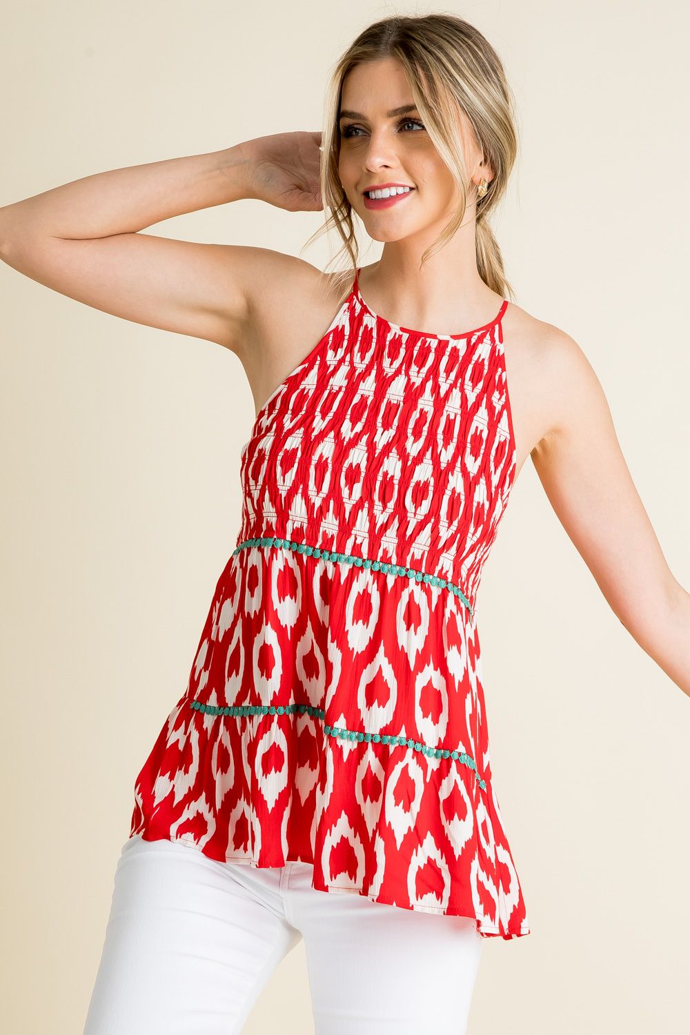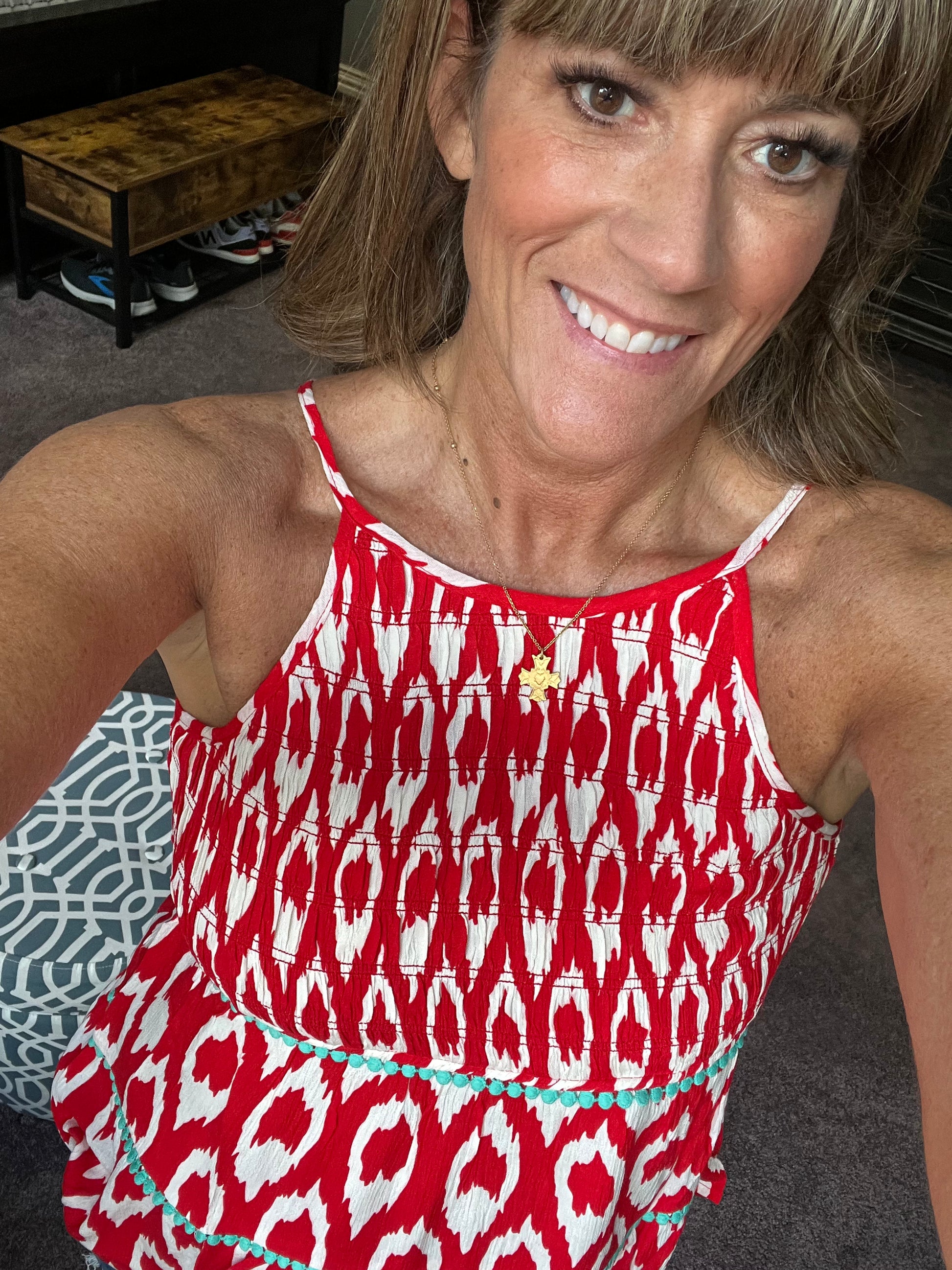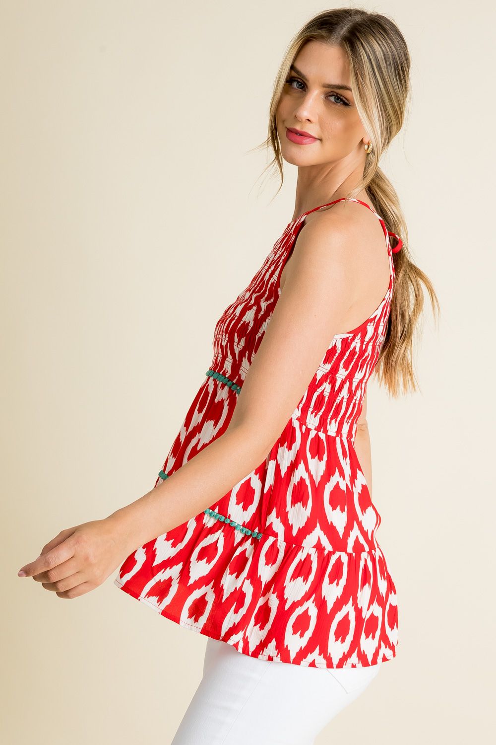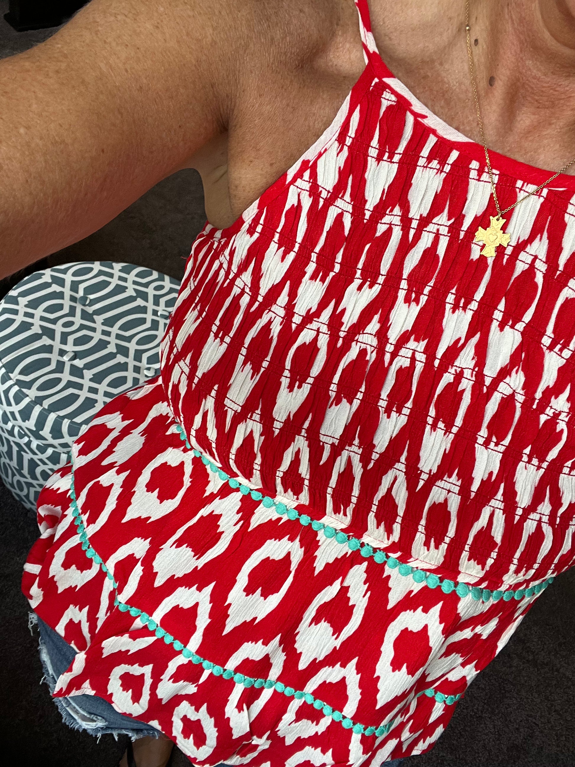 Ahhh!!! This top just screams “vacation”! Red and cream print with turquoise trim makes this one unique and stand out from the crowd! Tie neck back and stretchy bust area. You will pull this one out of your closet time and time again!