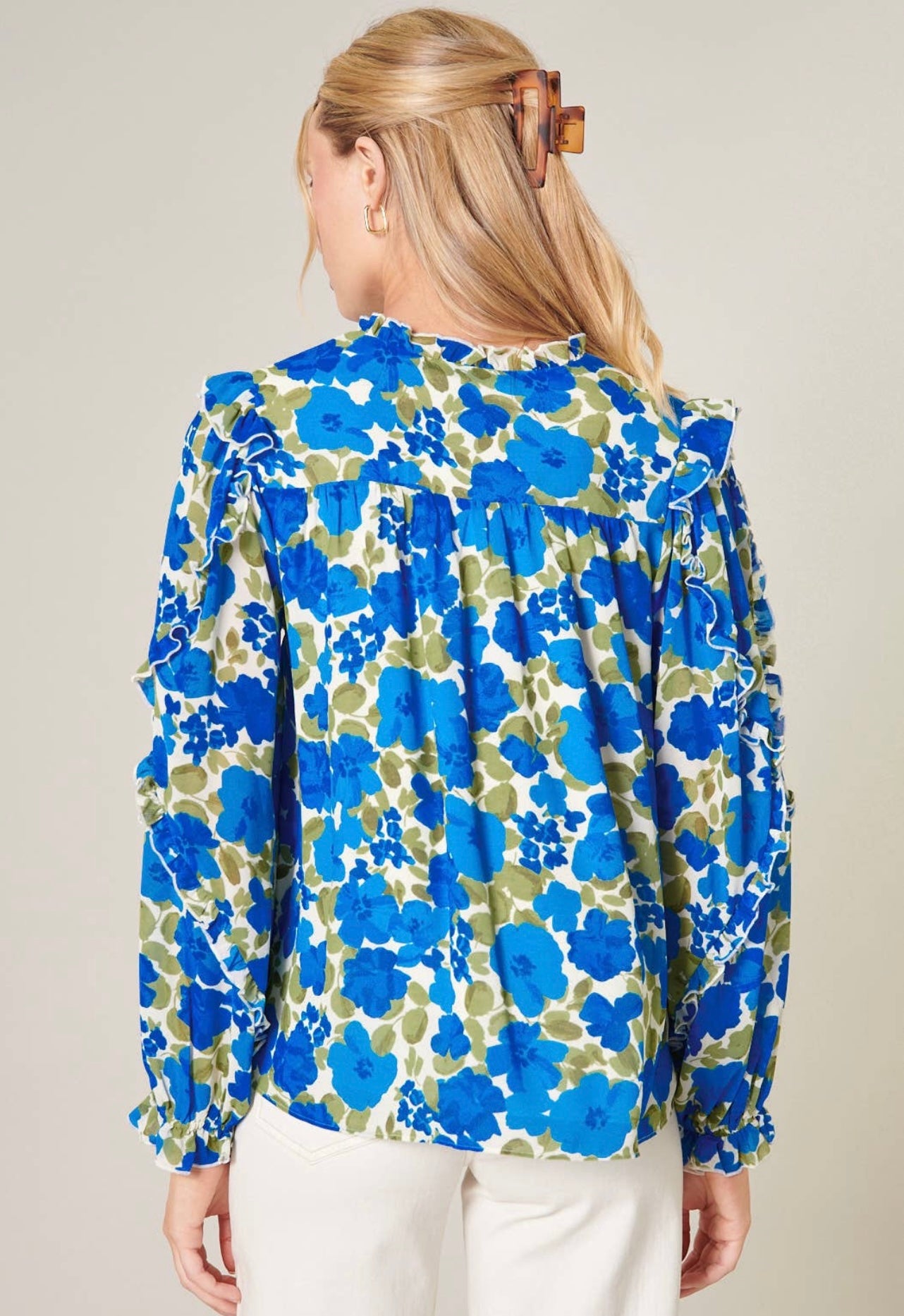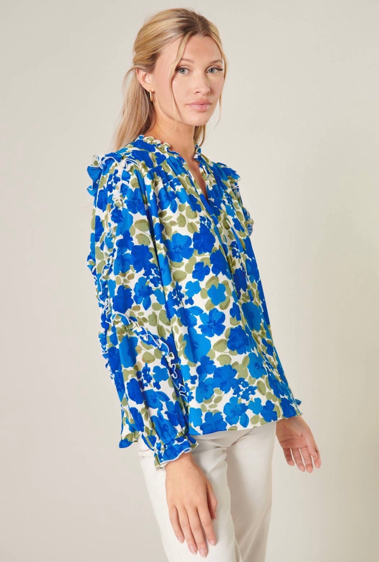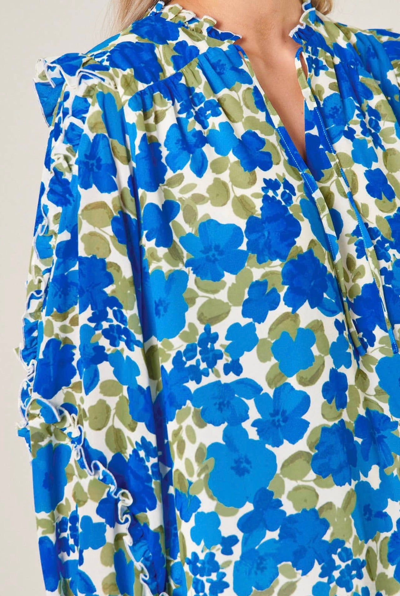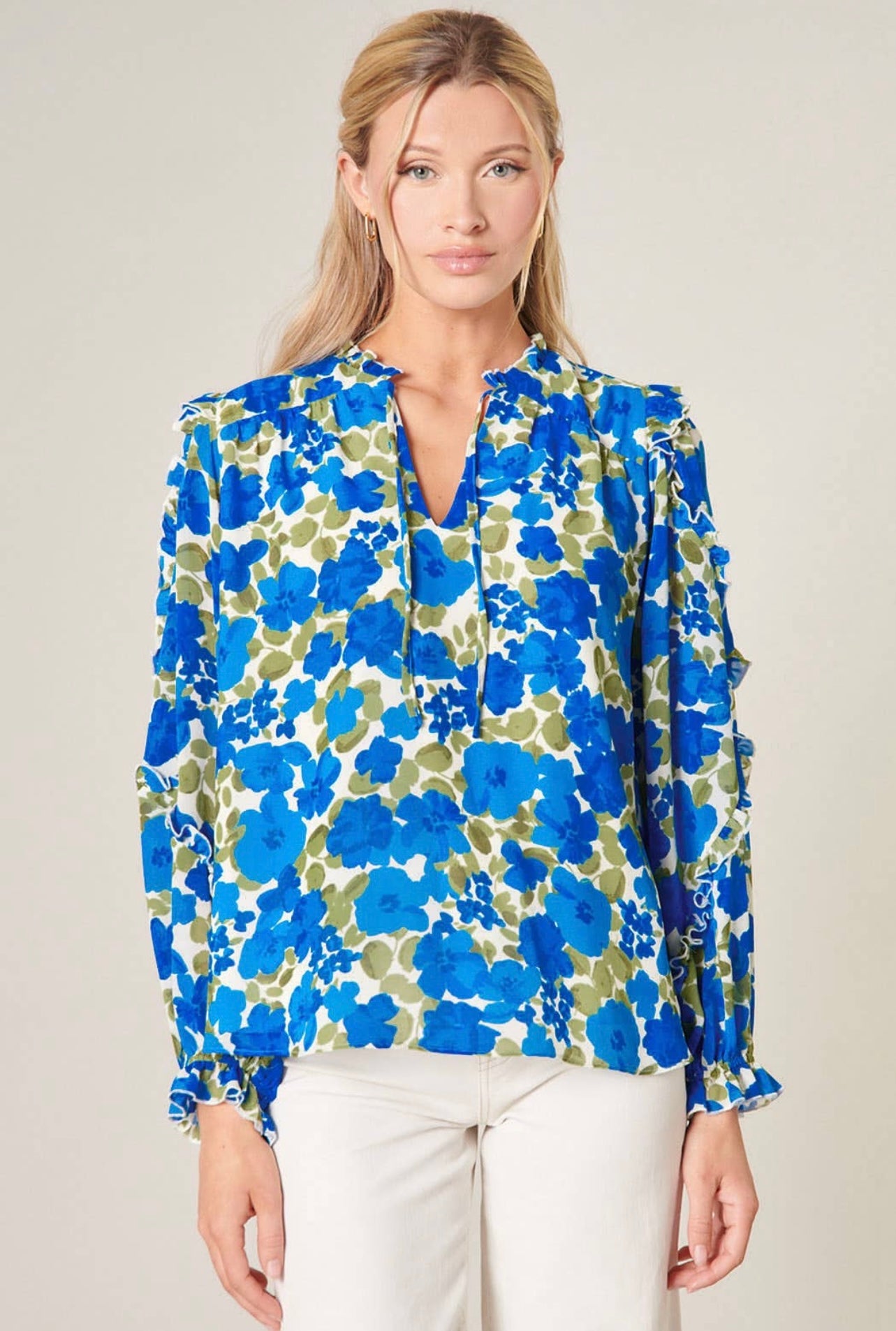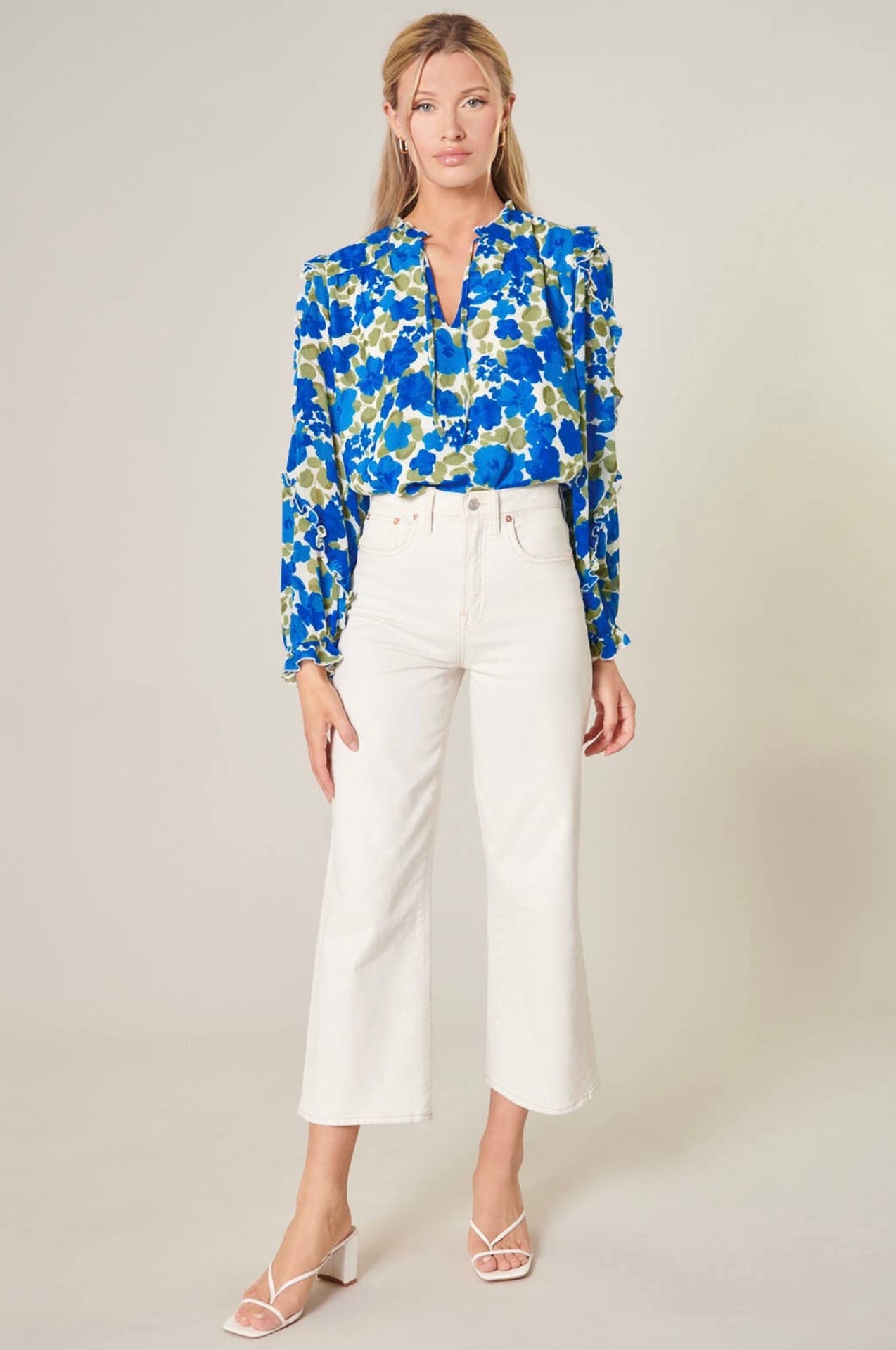 Blue tropical flowers shape the classic Raj Blouse. Ruffle trim coils a long balloon sleeve, framing a simple bodice with a relaxed fit. A notch neckline with a tie detail adds a flirty flair. Easily tuck it into your favorite high rise bottoms and pair it with loafers for a work appropriate ensemble.