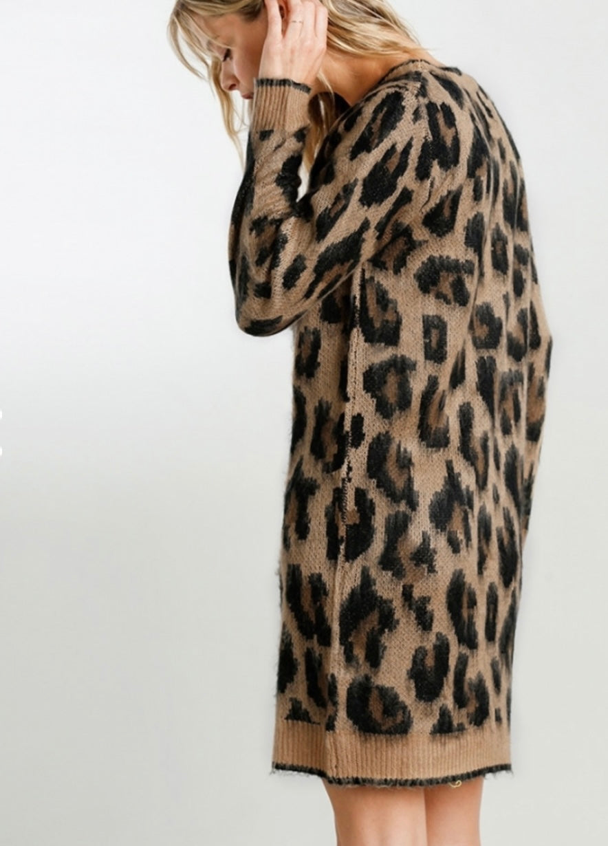 Pair this with leggings or tights & stay warm in style. Soft, body-hugging fit. Perfect print. Great length that falls just above the knee. Animal Print Round Neck and Long Sleeve Sweater Dress.