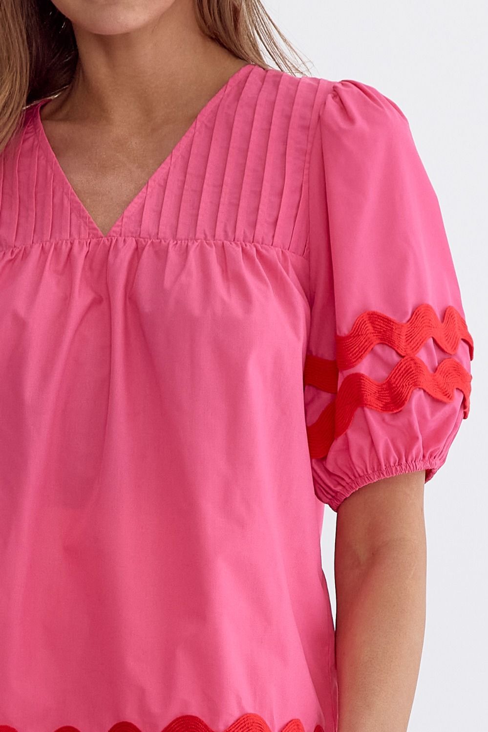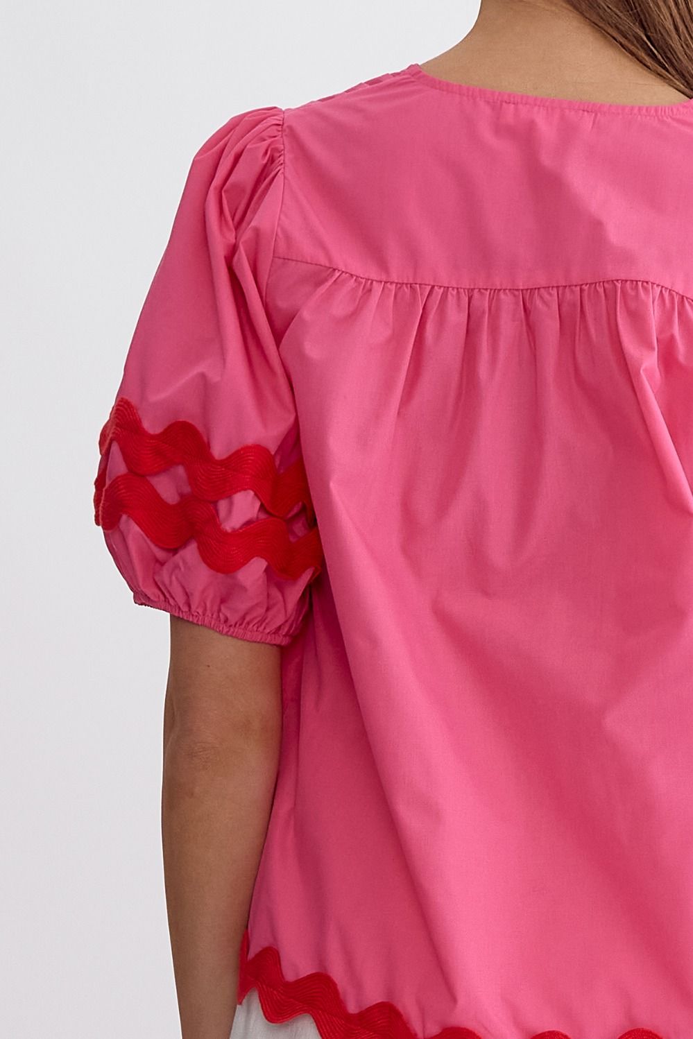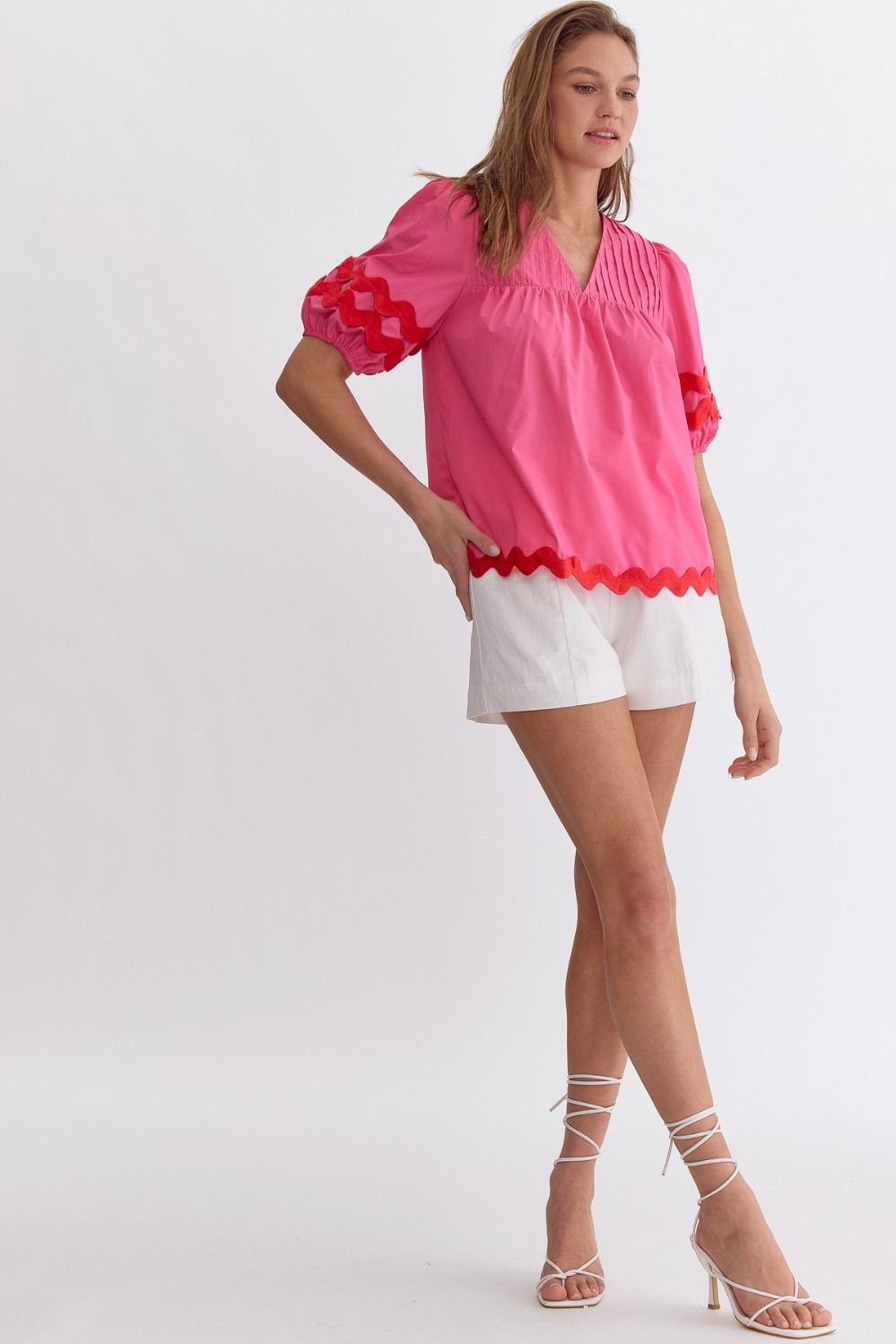 Solid bubble sleeve v-neck top featuring ric rac detail. Unlined. Woven. Non-sheer.