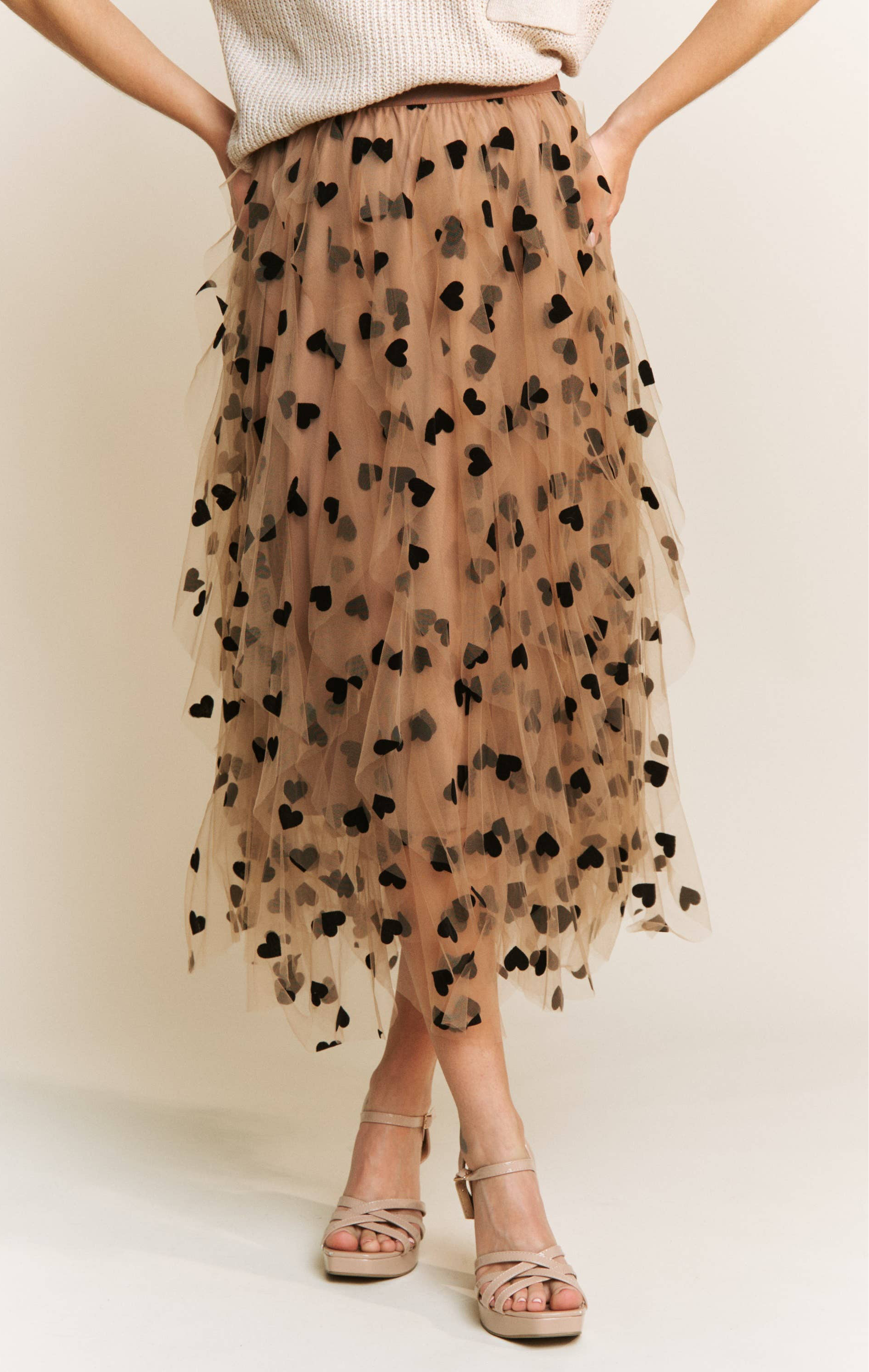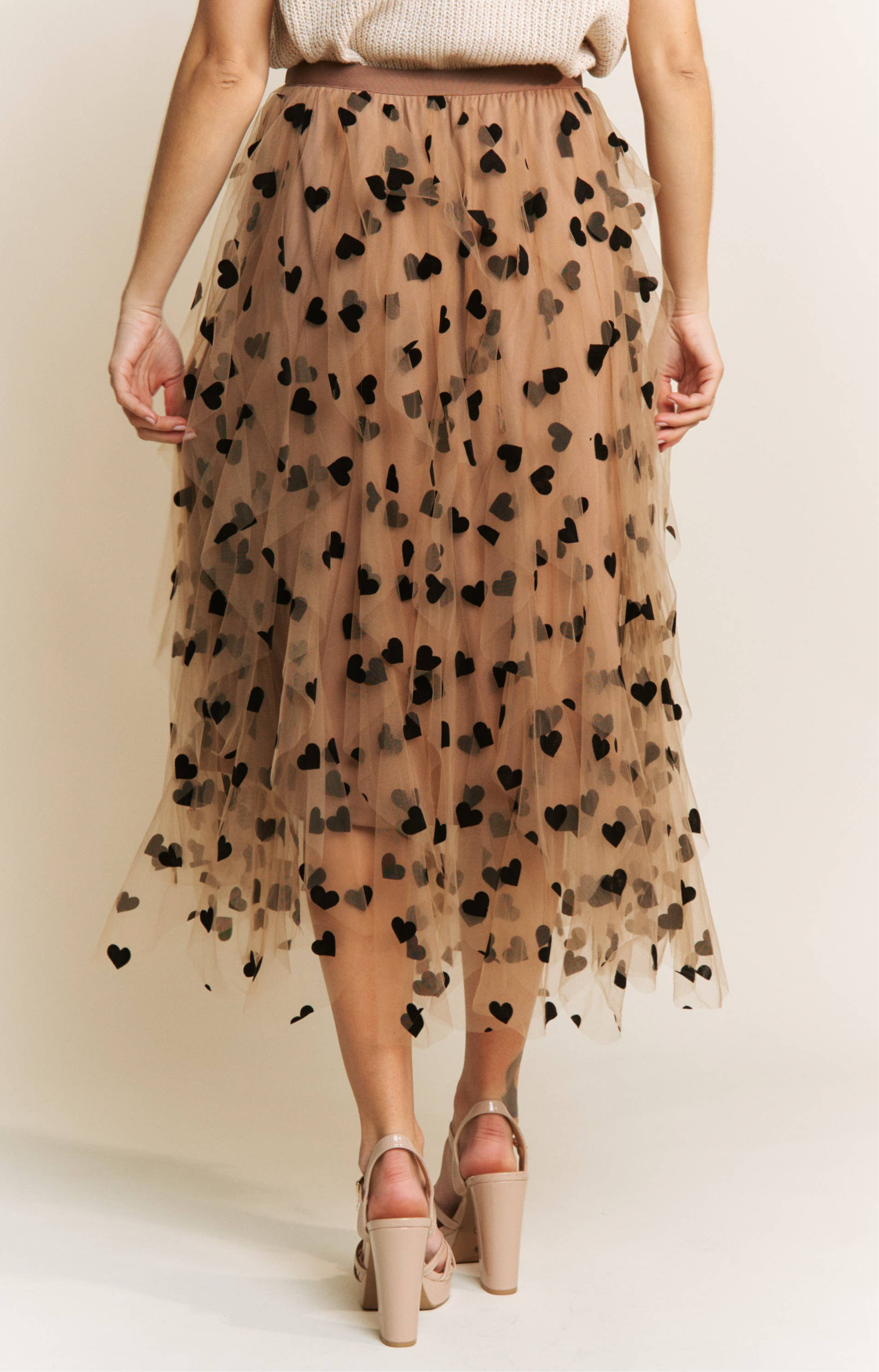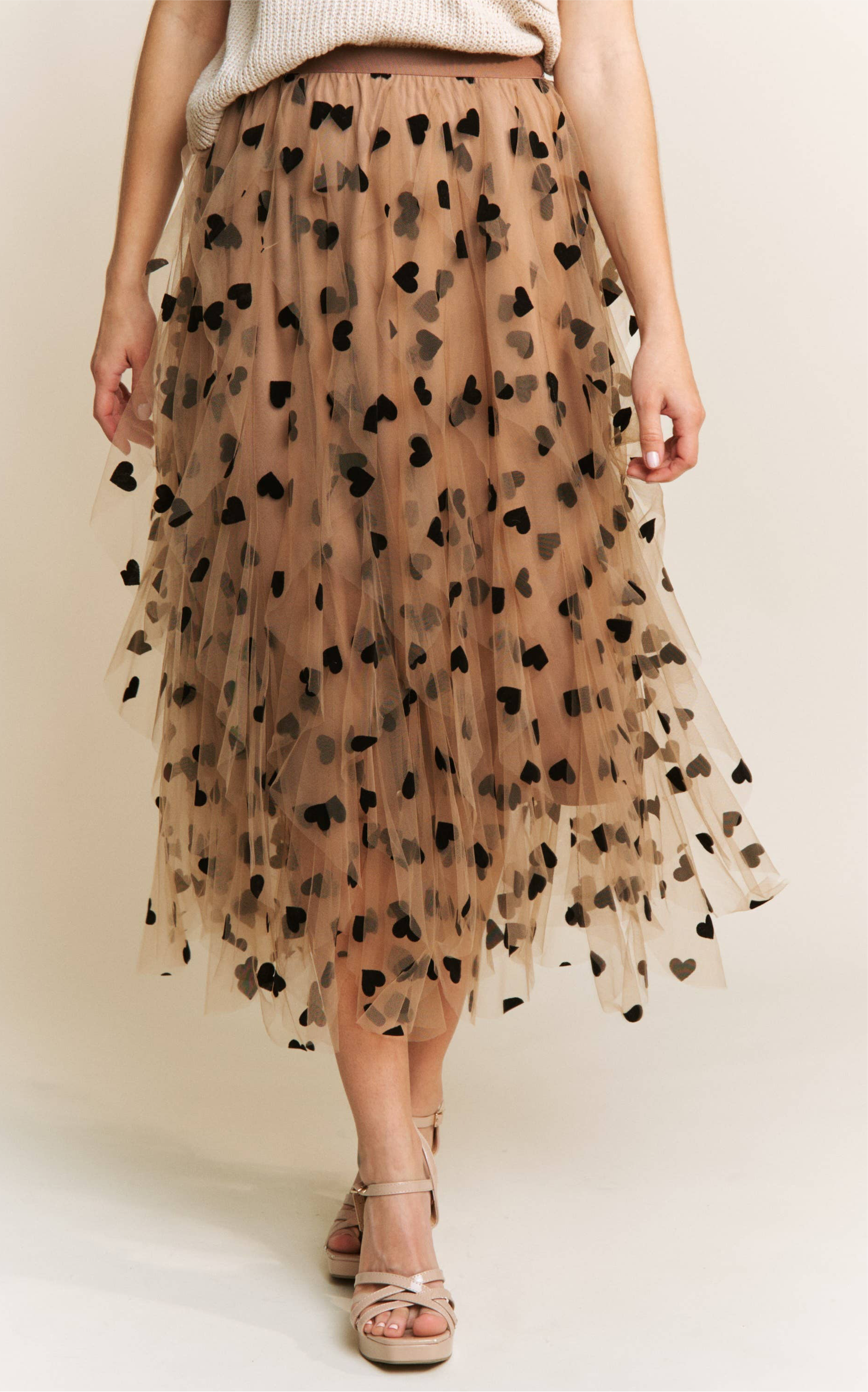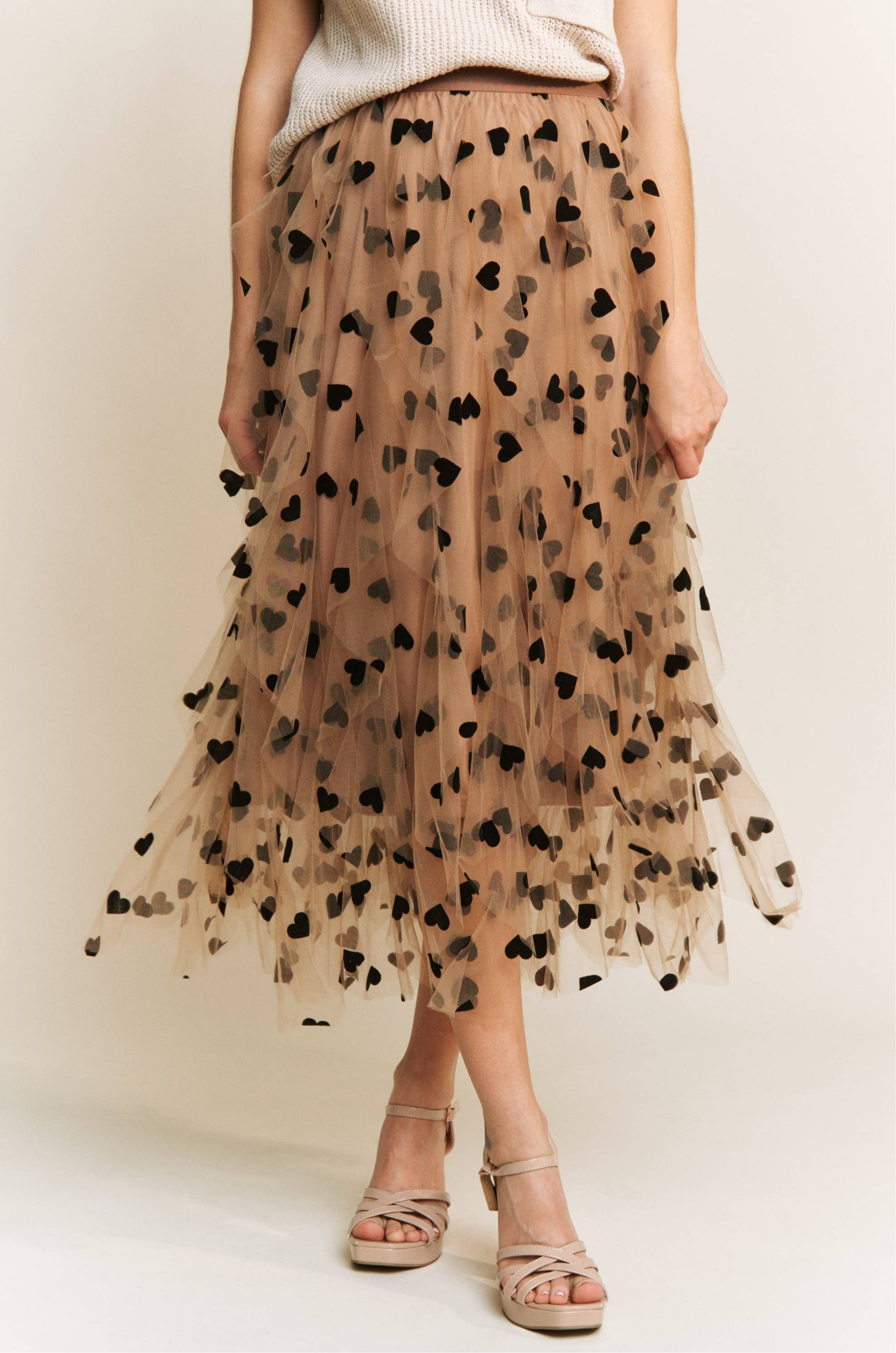 High waist with elastic band - Layered heart velvet flocking mesh fabrics - Lined shorter skirt inside.