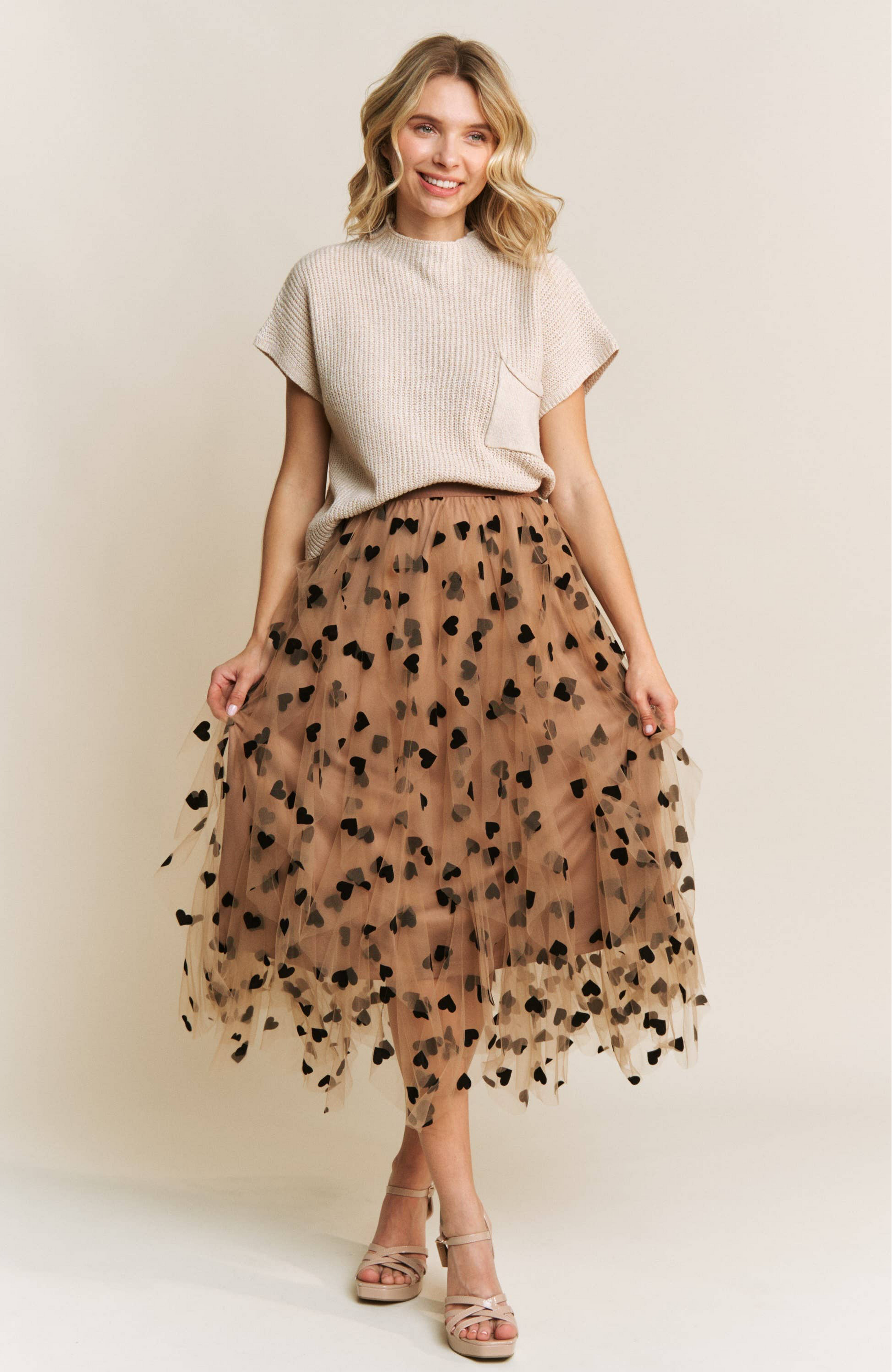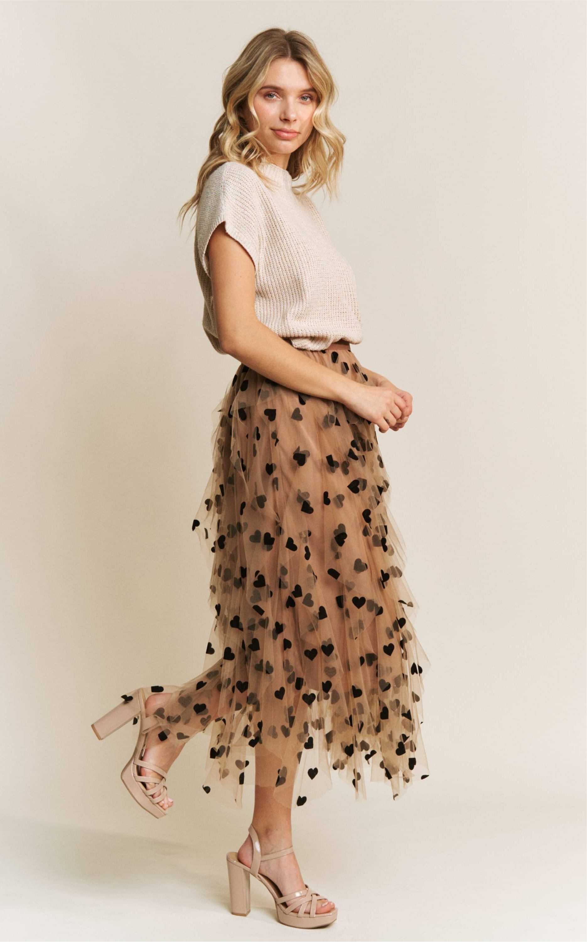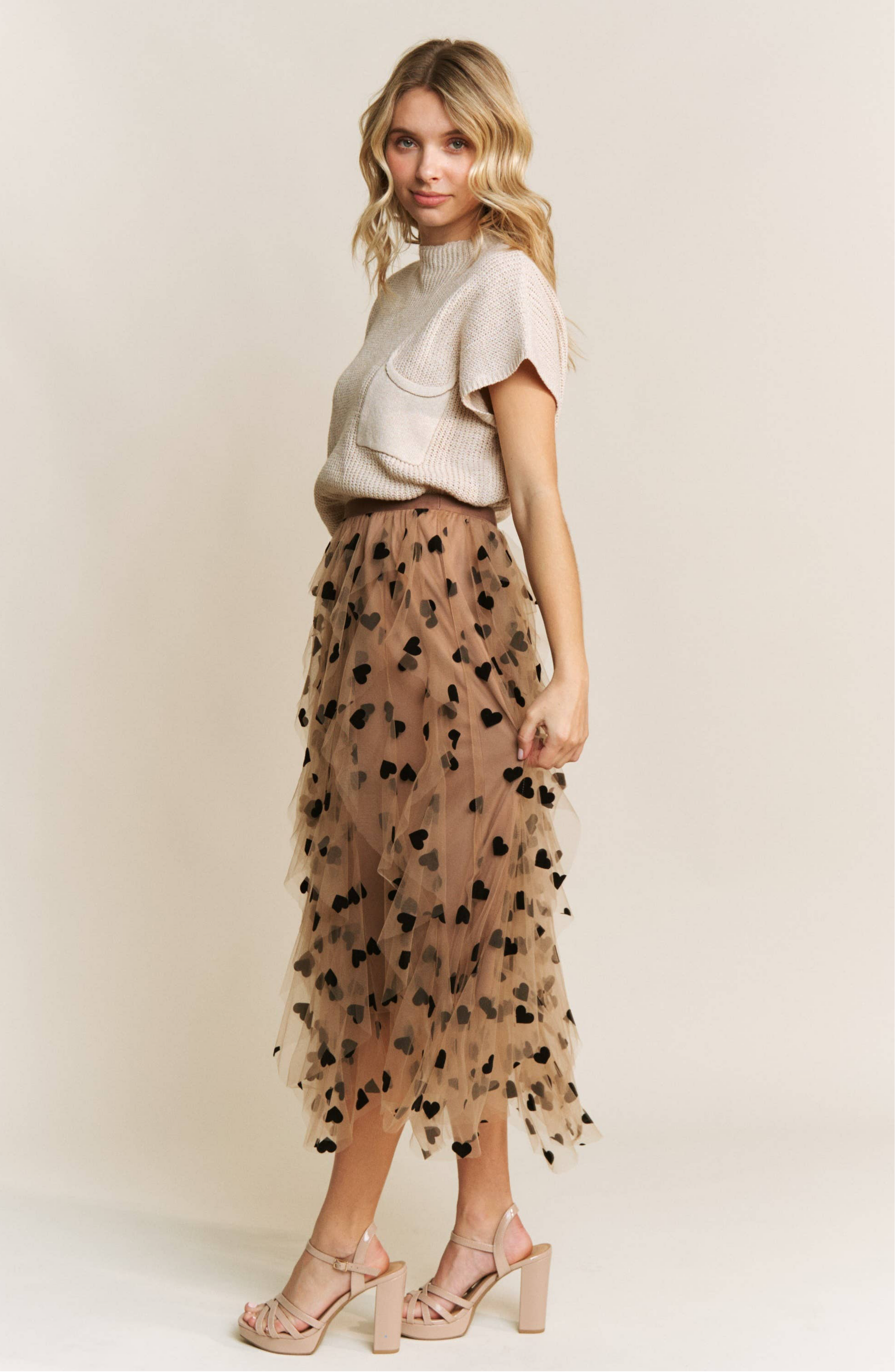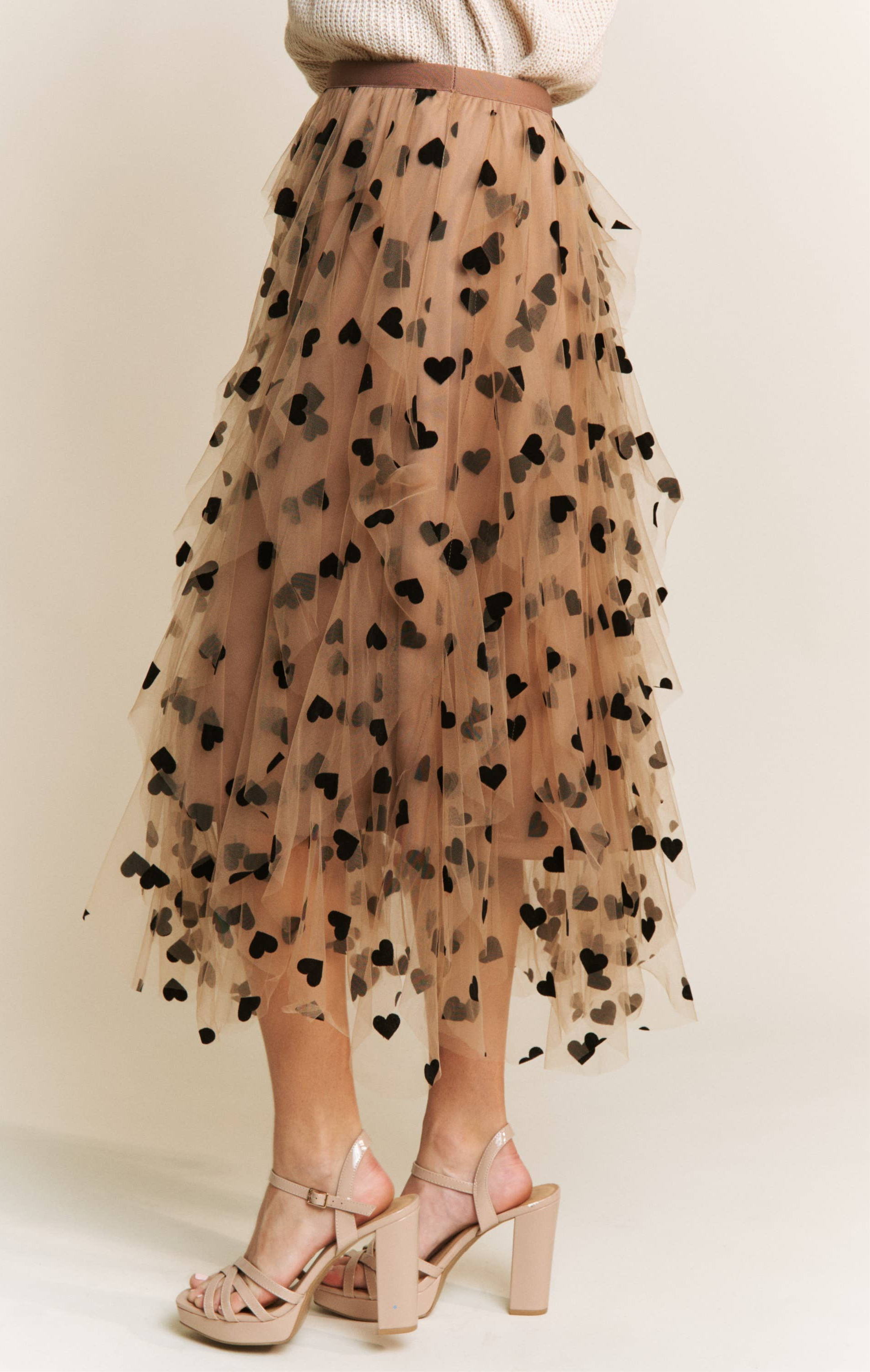 High waist with elastic band - Layered heart velvet flocking mesh fabrics - Lined shorter skirt inside.