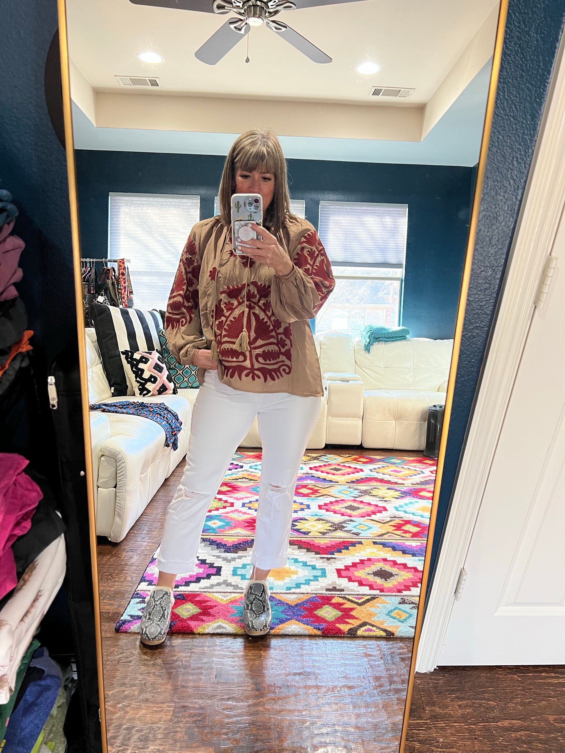 The Taryn Top is a beauty! The taupe fabric makes the maroon embroidery pop and together they make the perfect color combination. We love the chunky tie at the neck that can be adjusted, the oversized sleeve and the large embroidery detail. For work or for play the Taryn Top is perfection!