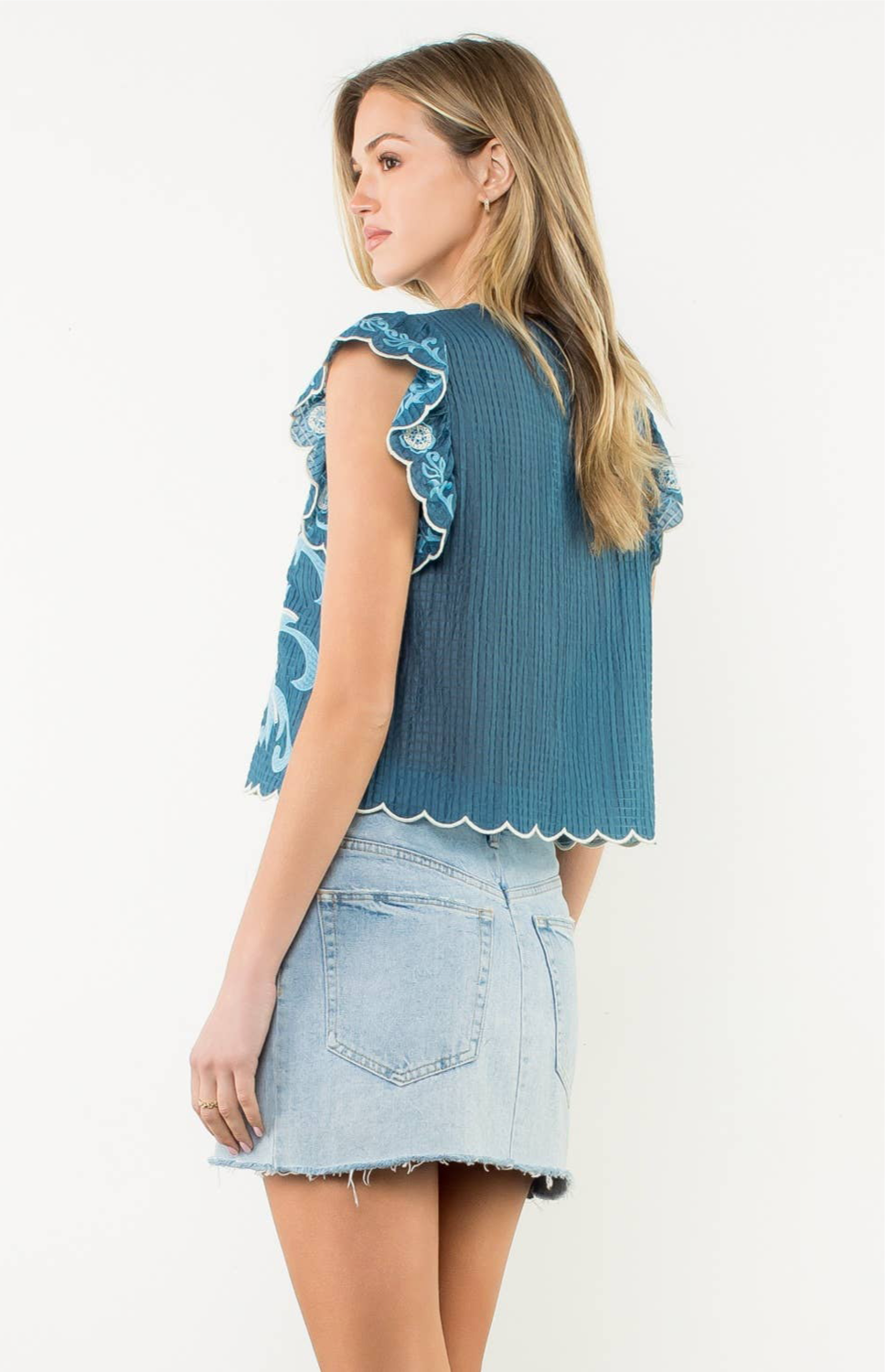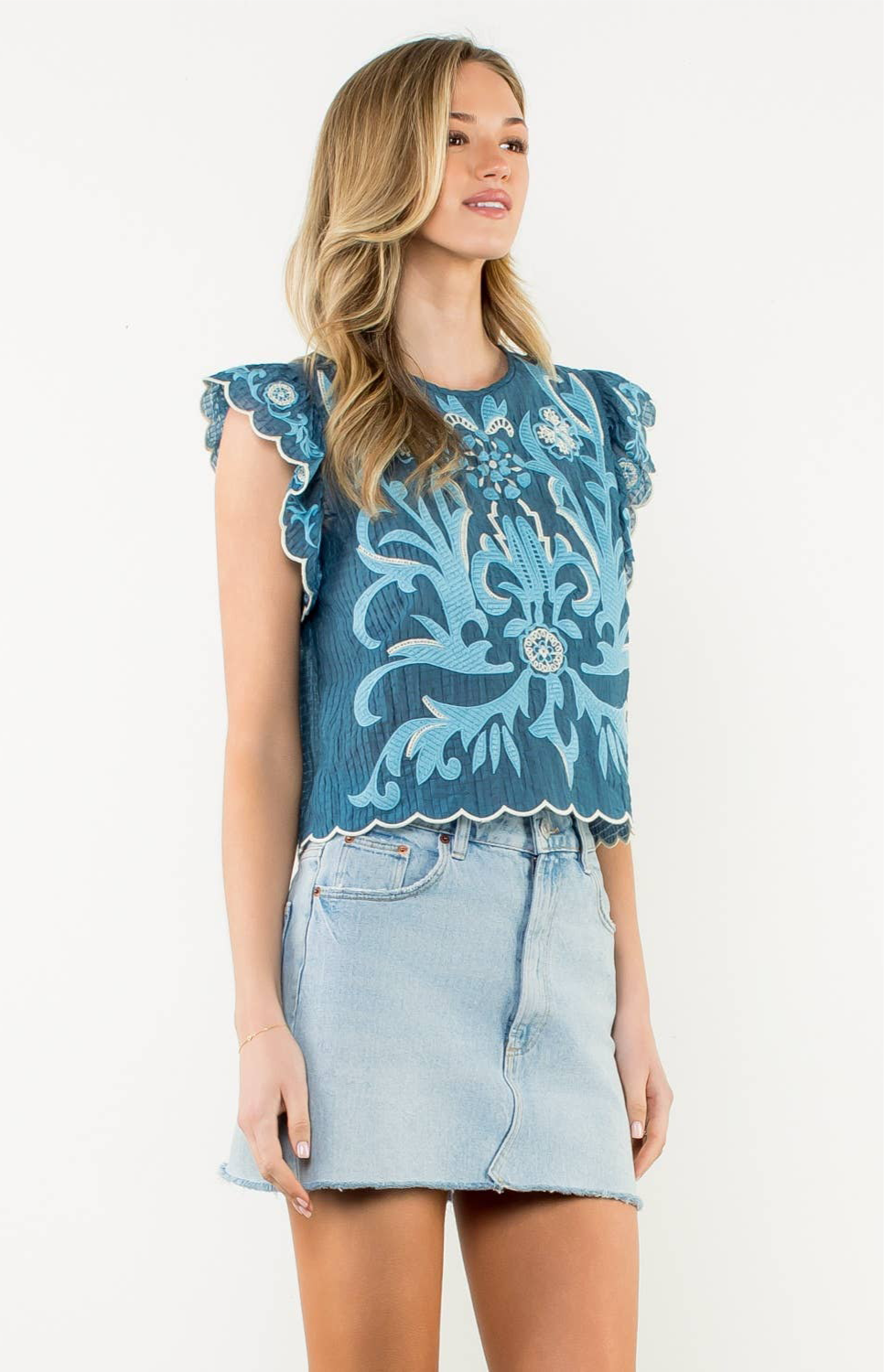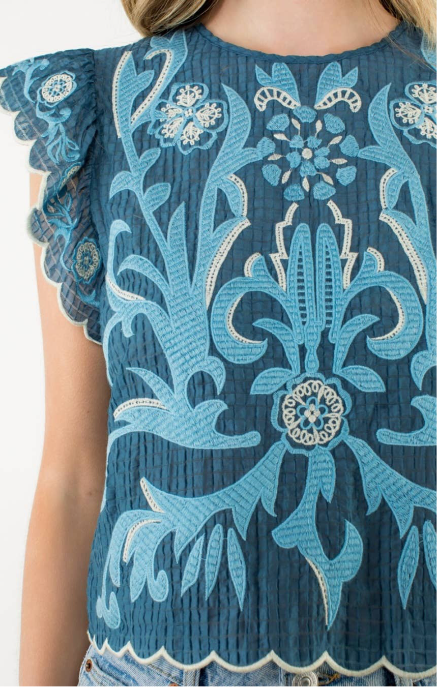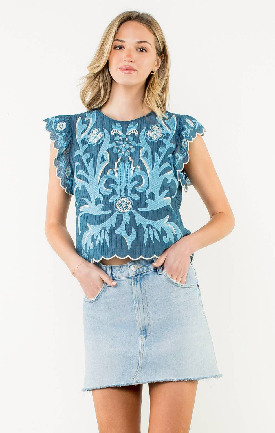 Seabreeze Embroidered Flutter Sleeve Scallop Top: THML