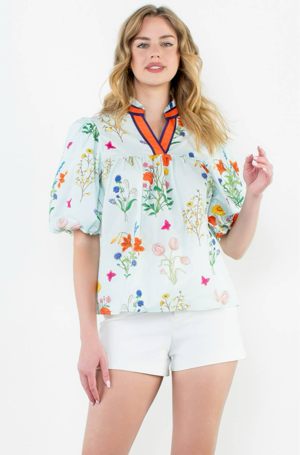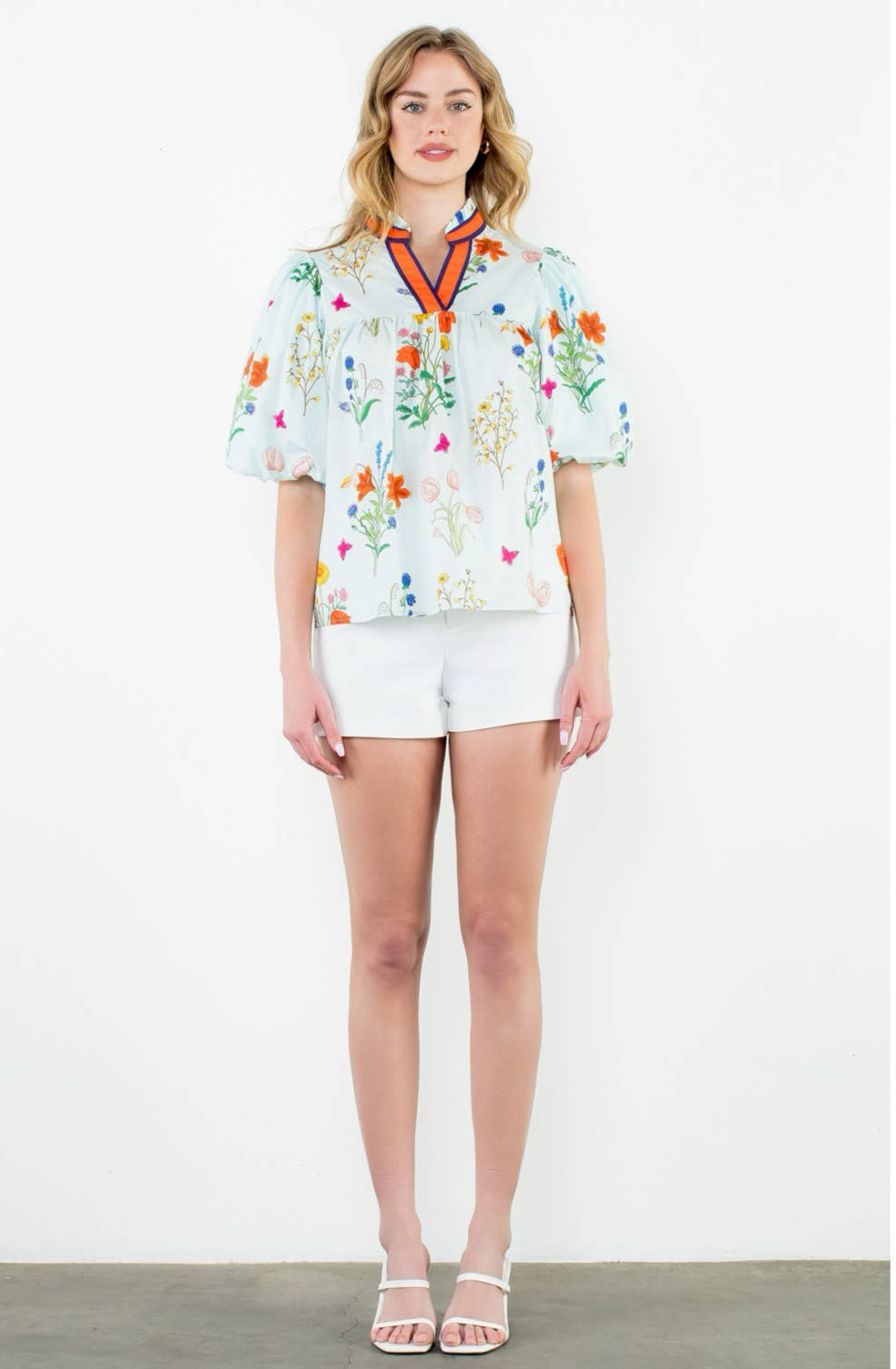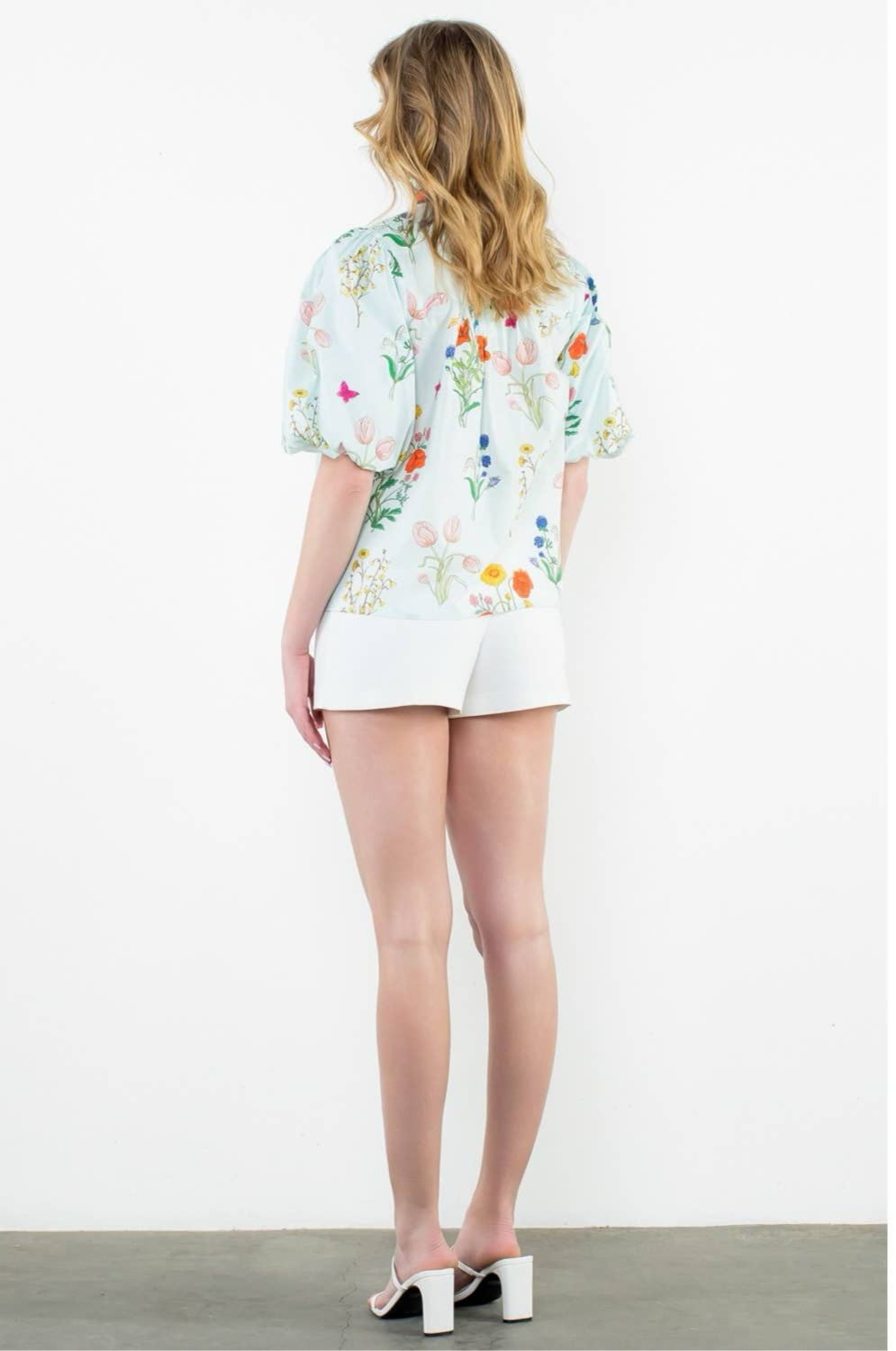 Step into spring in new THML! Gorgeous florals adorn this crisp mint top perfect for light, dark, or colored denim.