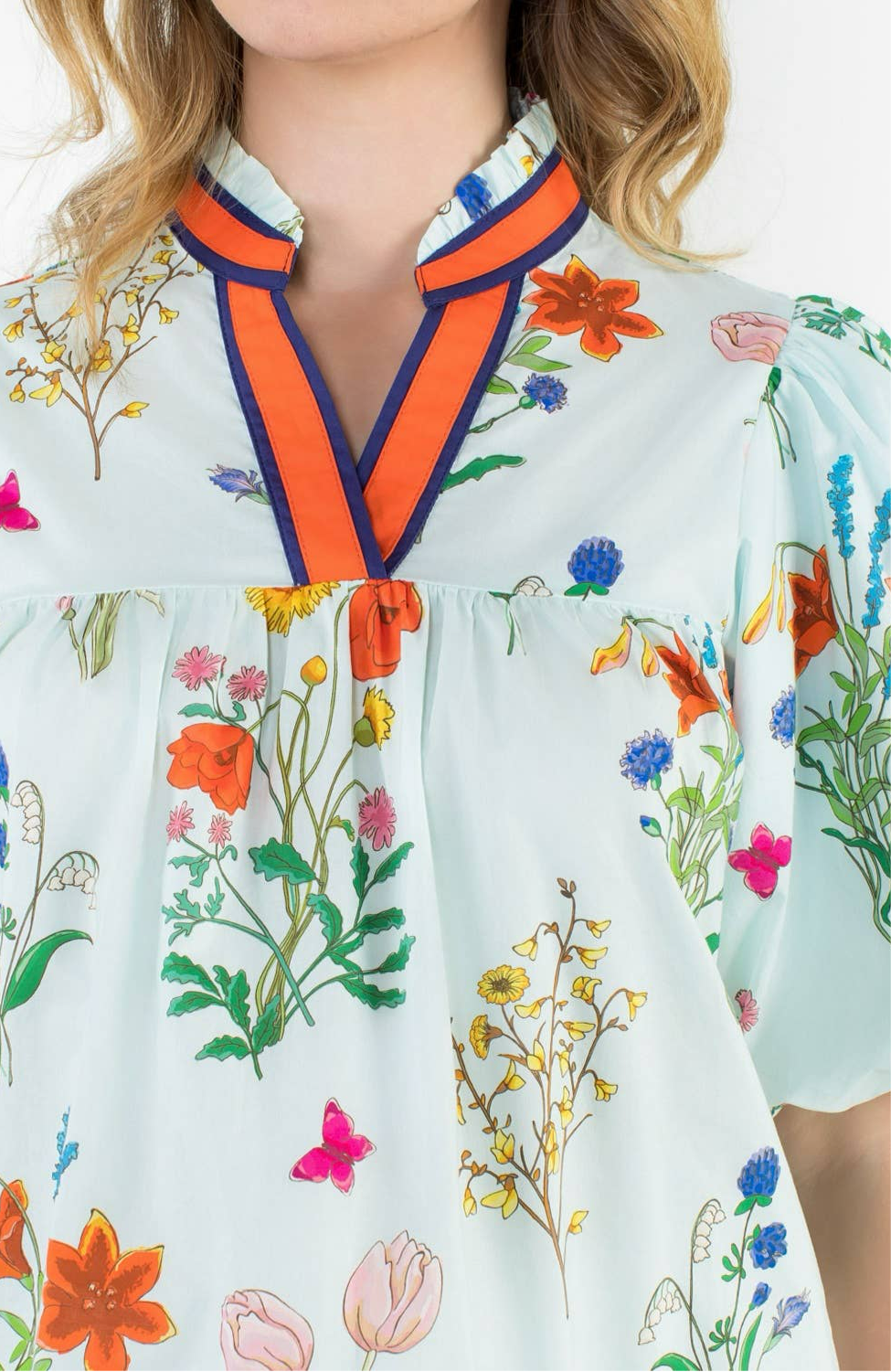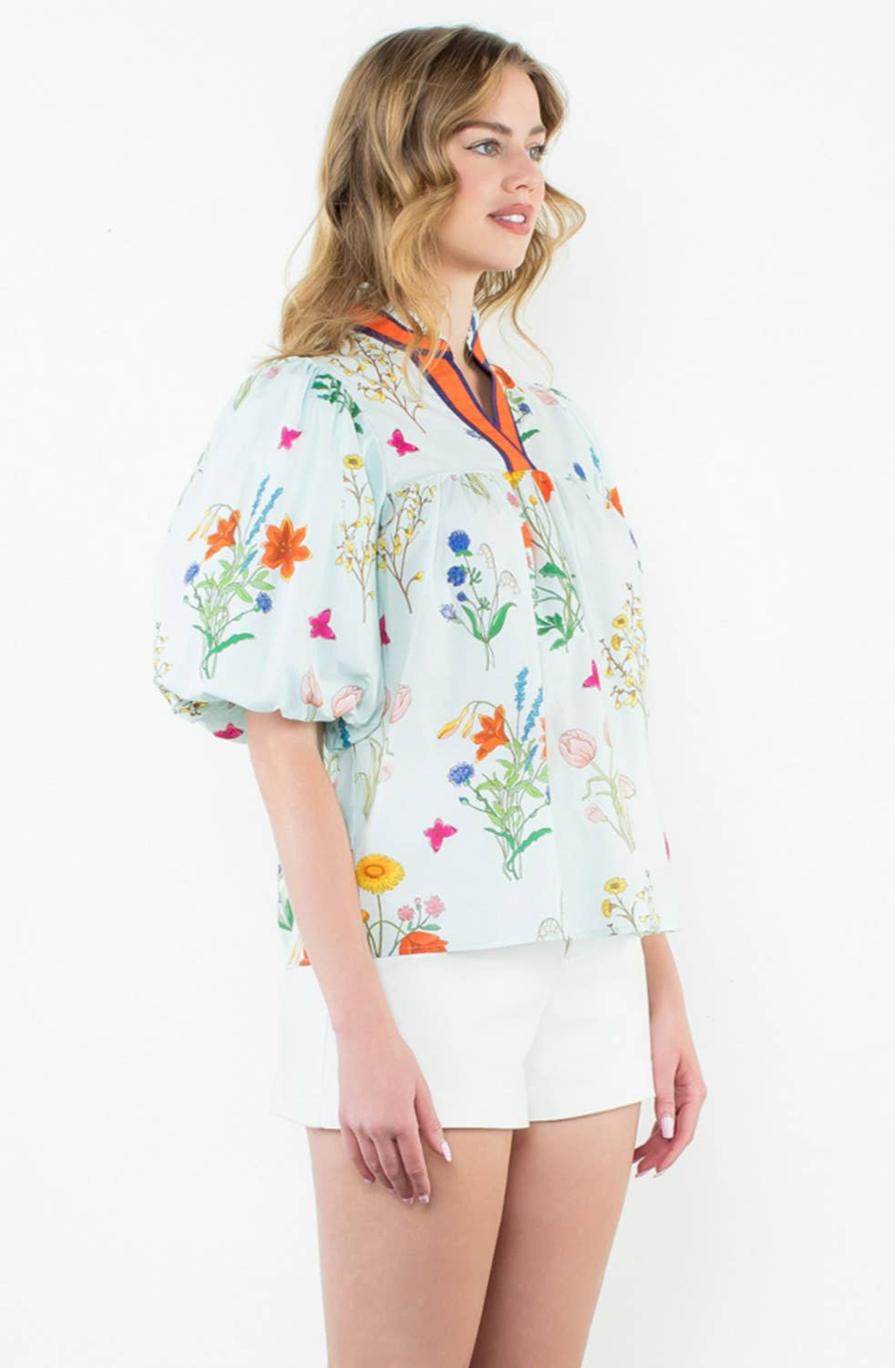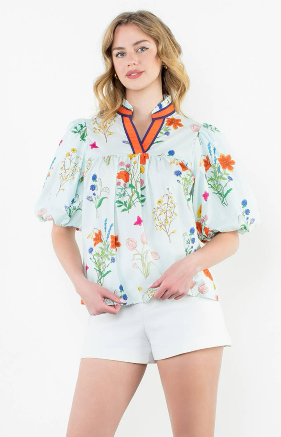 Step into spring in new THML! Gorgeous florals adorn this crisp mint top perfect for light, dark, or colored denim.