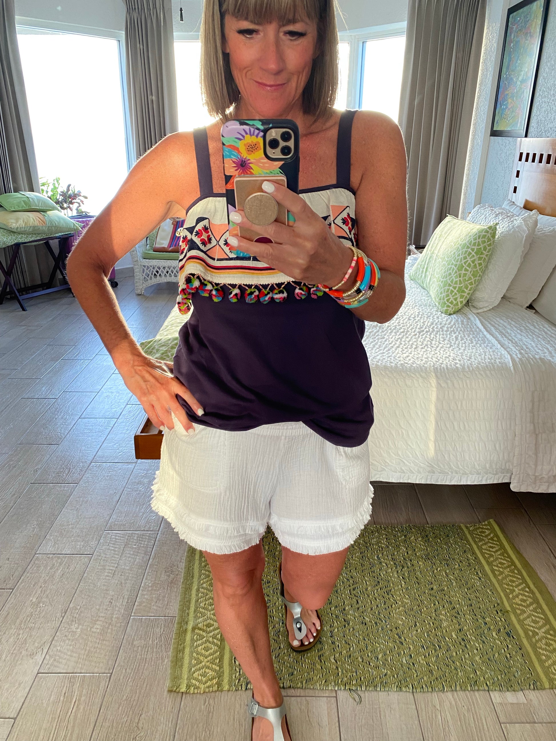 Adorable flounce top with pom pom trim from THML. I love this one so much & it’s bra-friendly! Embroidery & poms with pops of color on a navy top.