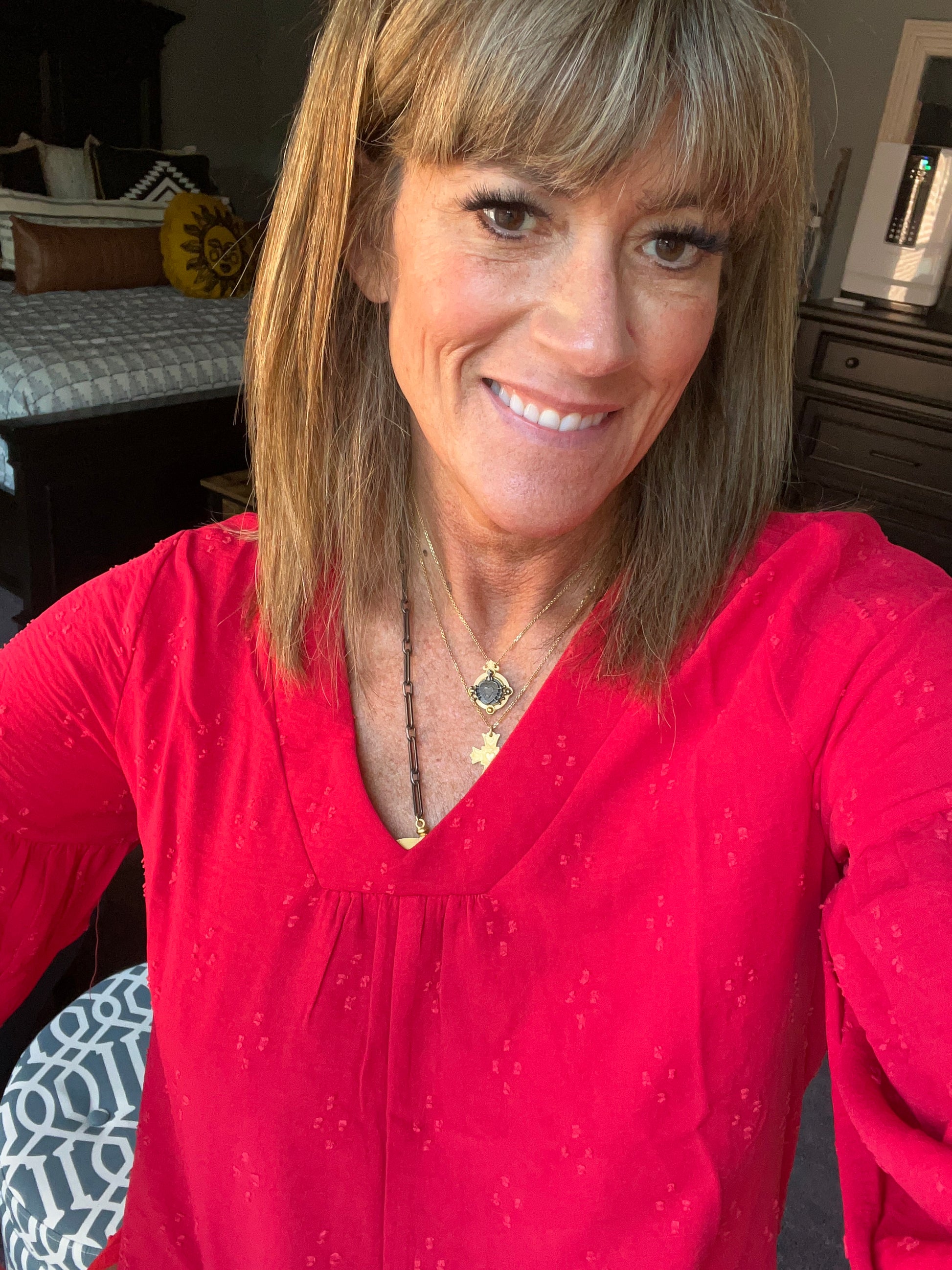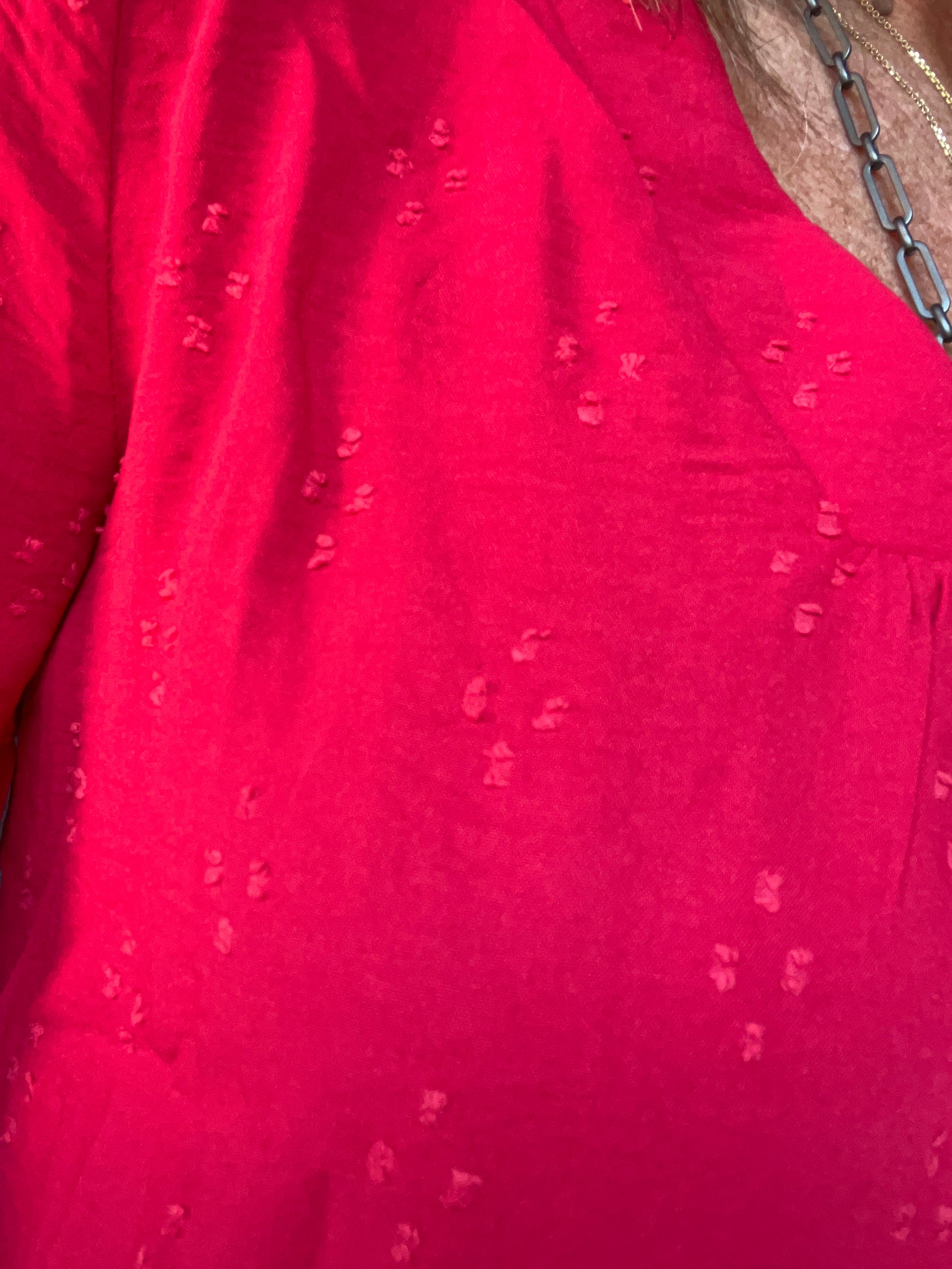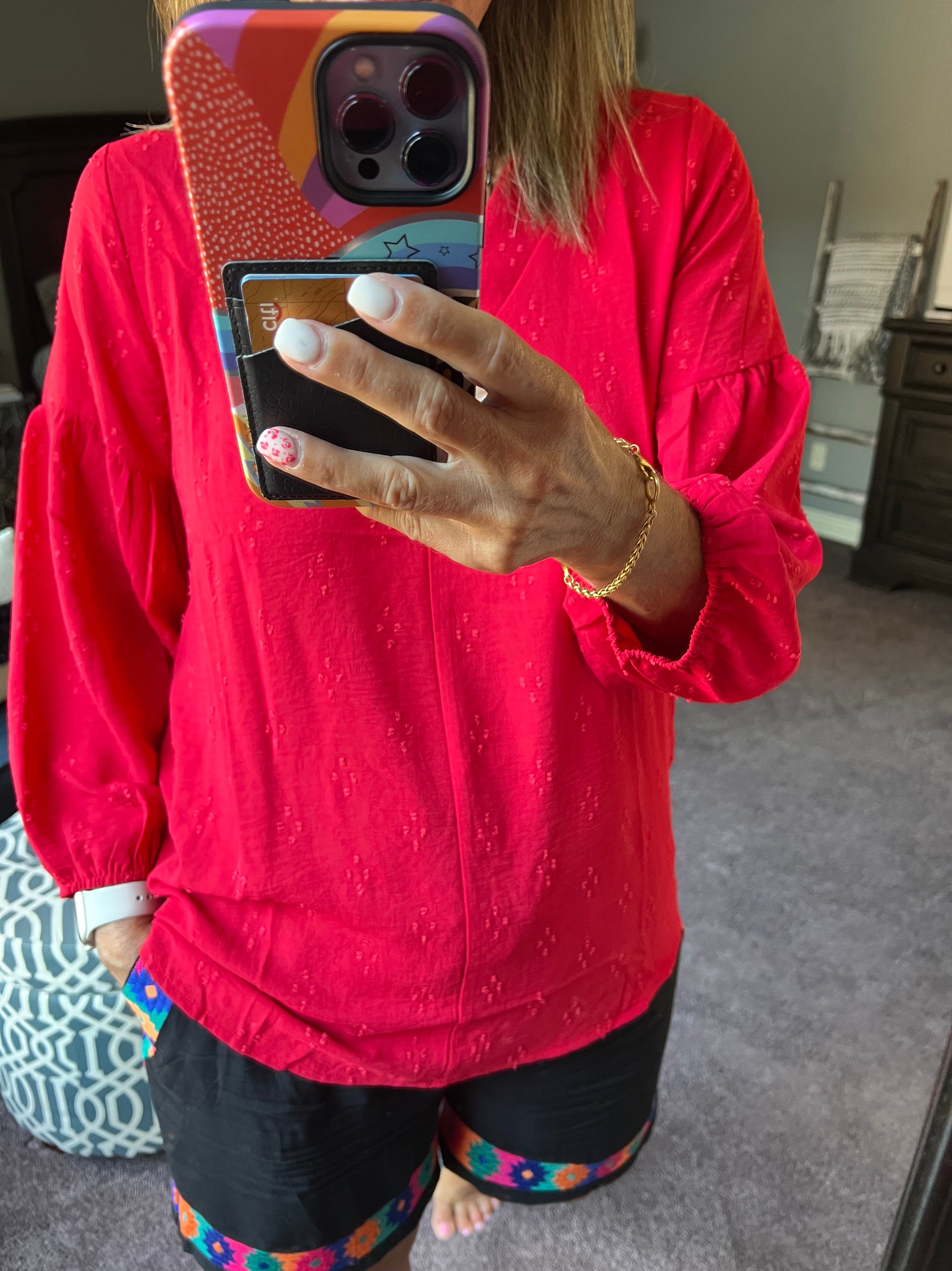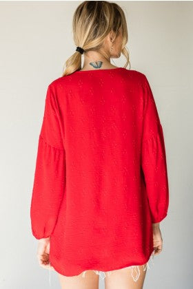 Solid textured top with a V-neckline and three quarter bubble sleeves.