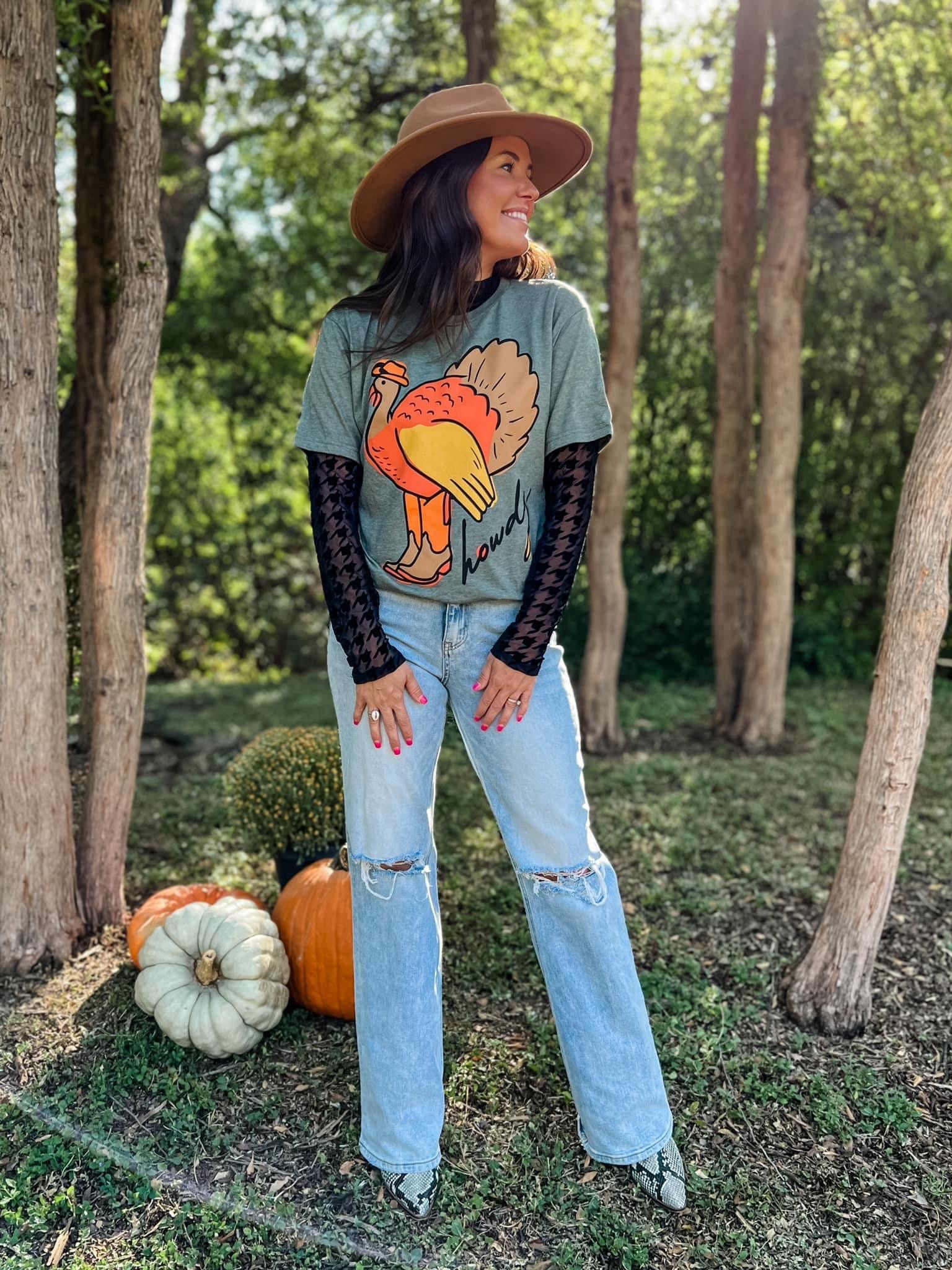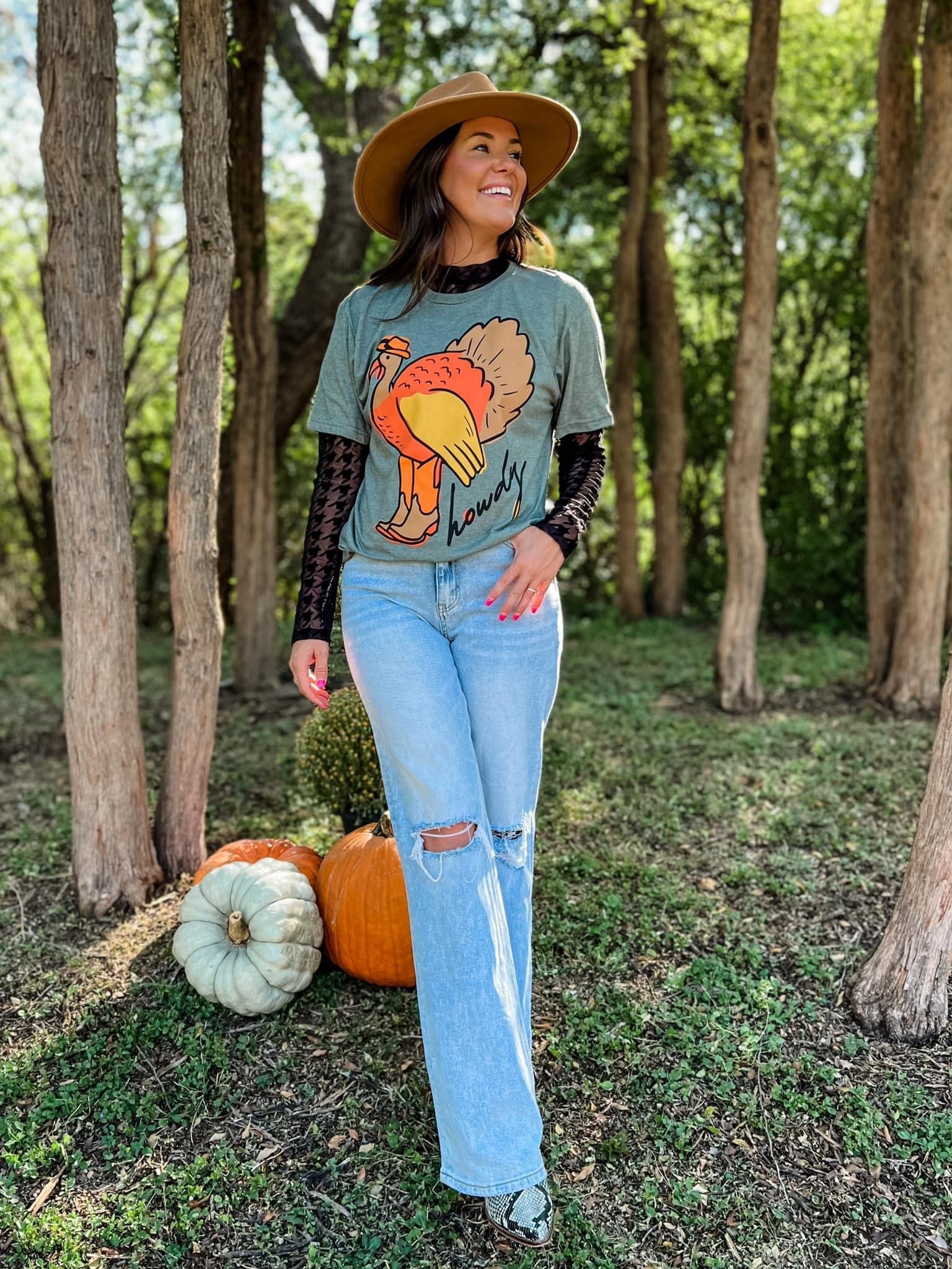 Gildan Olive graphic tee. Fit is true to size. Size up for extra room for all that holiday feasting.