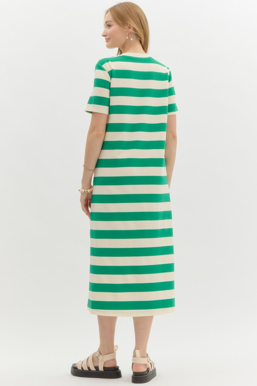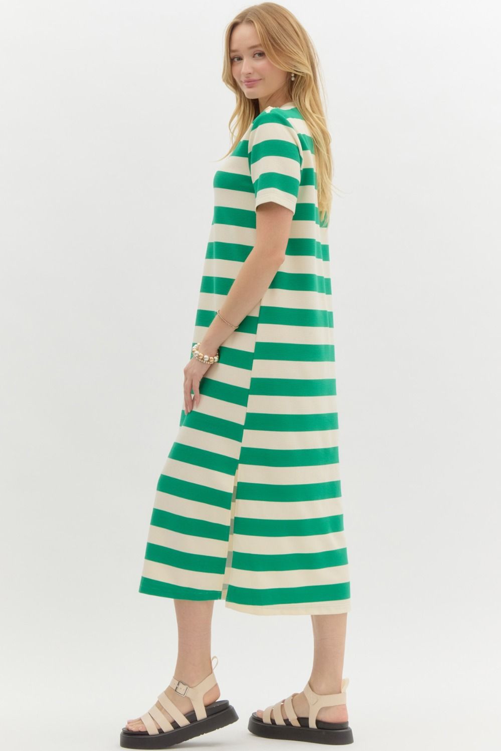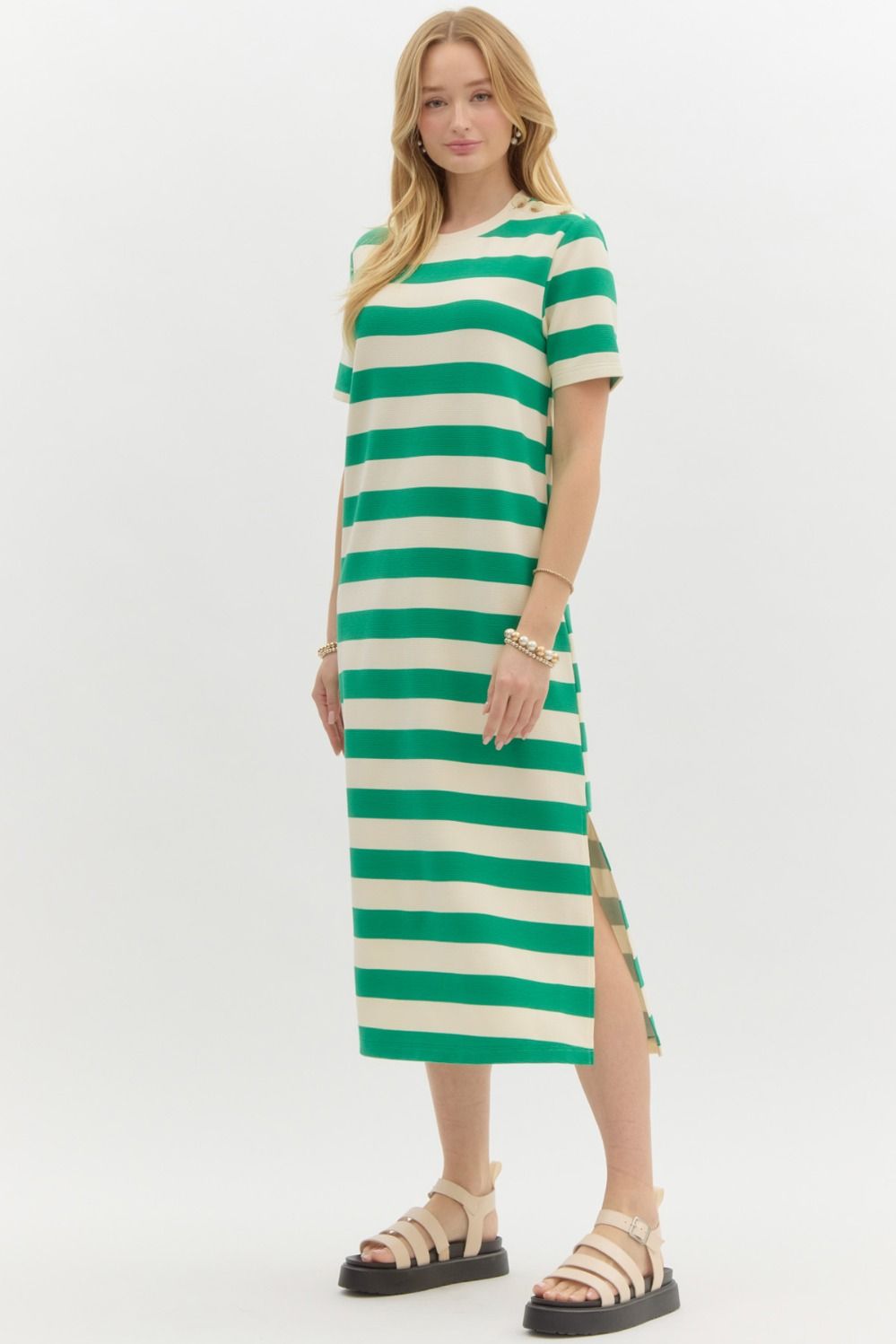 Striped short sleeve midi dress featuring side slit hem. Unlined. Knit. Non-sheer. Lightweight.