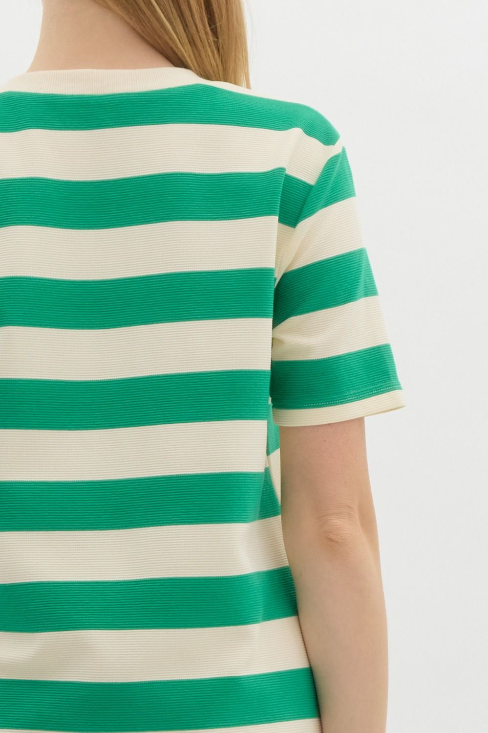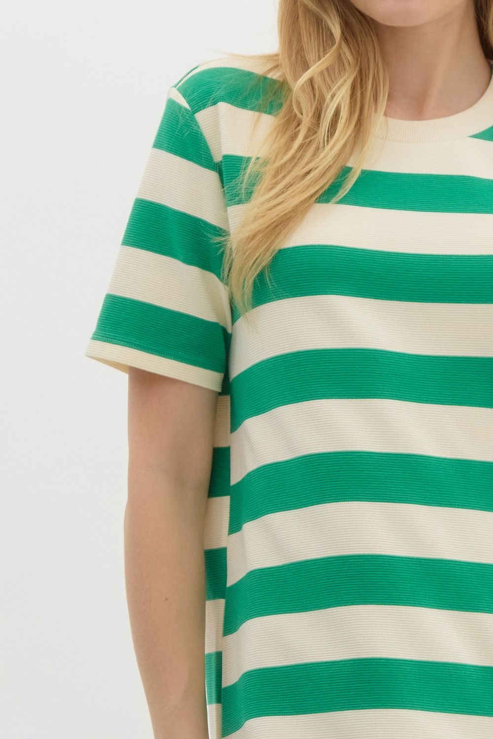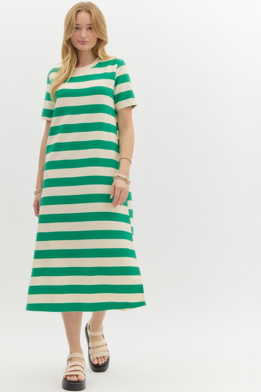 Striped short sleeve midi dress featuring side slit hem. Unlined. Knit. Non-sheer. Lightweight.