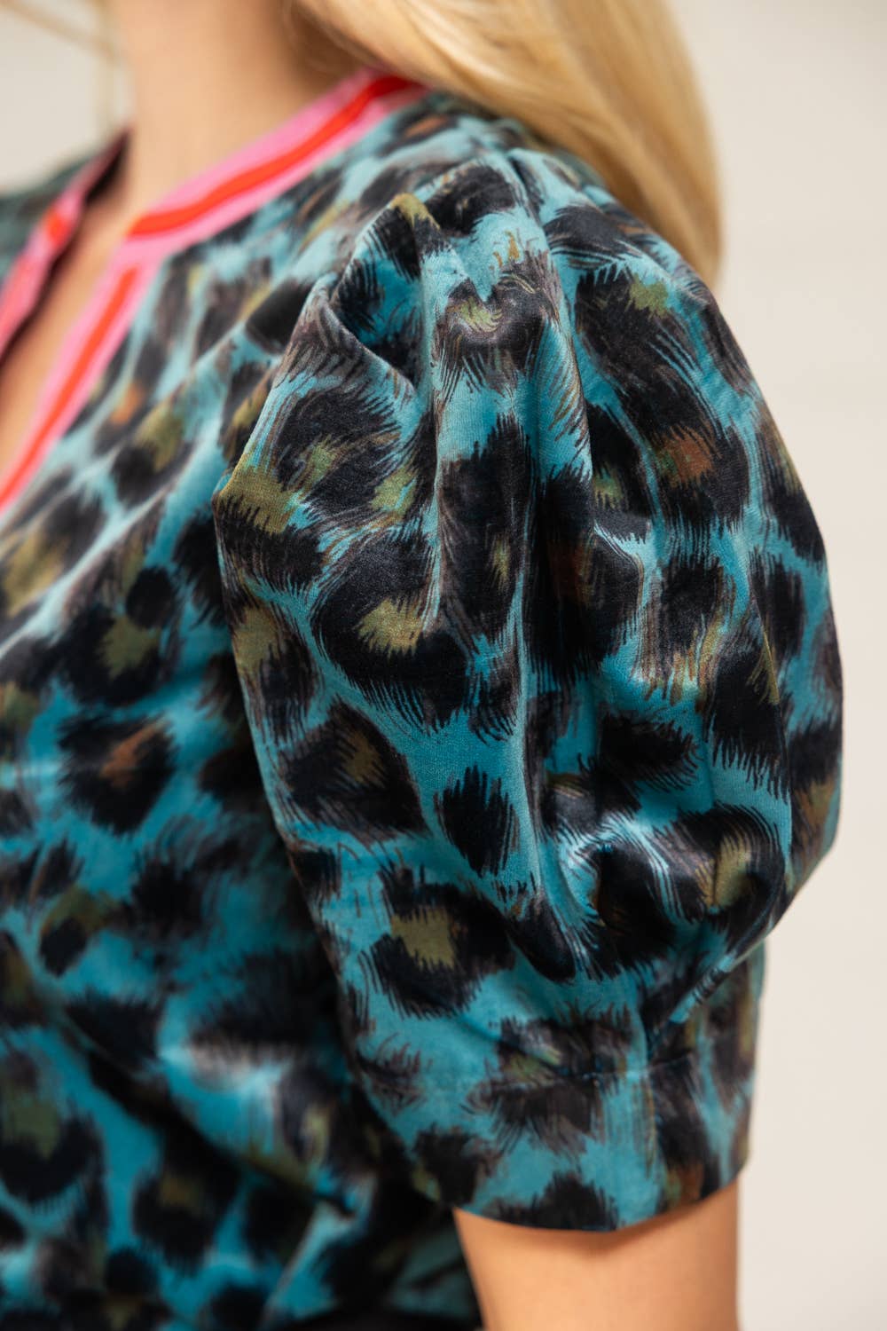 Bold yet playful, this statement blouse combines a vibrant velvet teal leopard print with a striking contrast neckline trim in hot pink and coral. Featuring a relaxed silhouette with short puff sleeves and a split V-neck, this top is designed to elevate both casual and dressy looks.