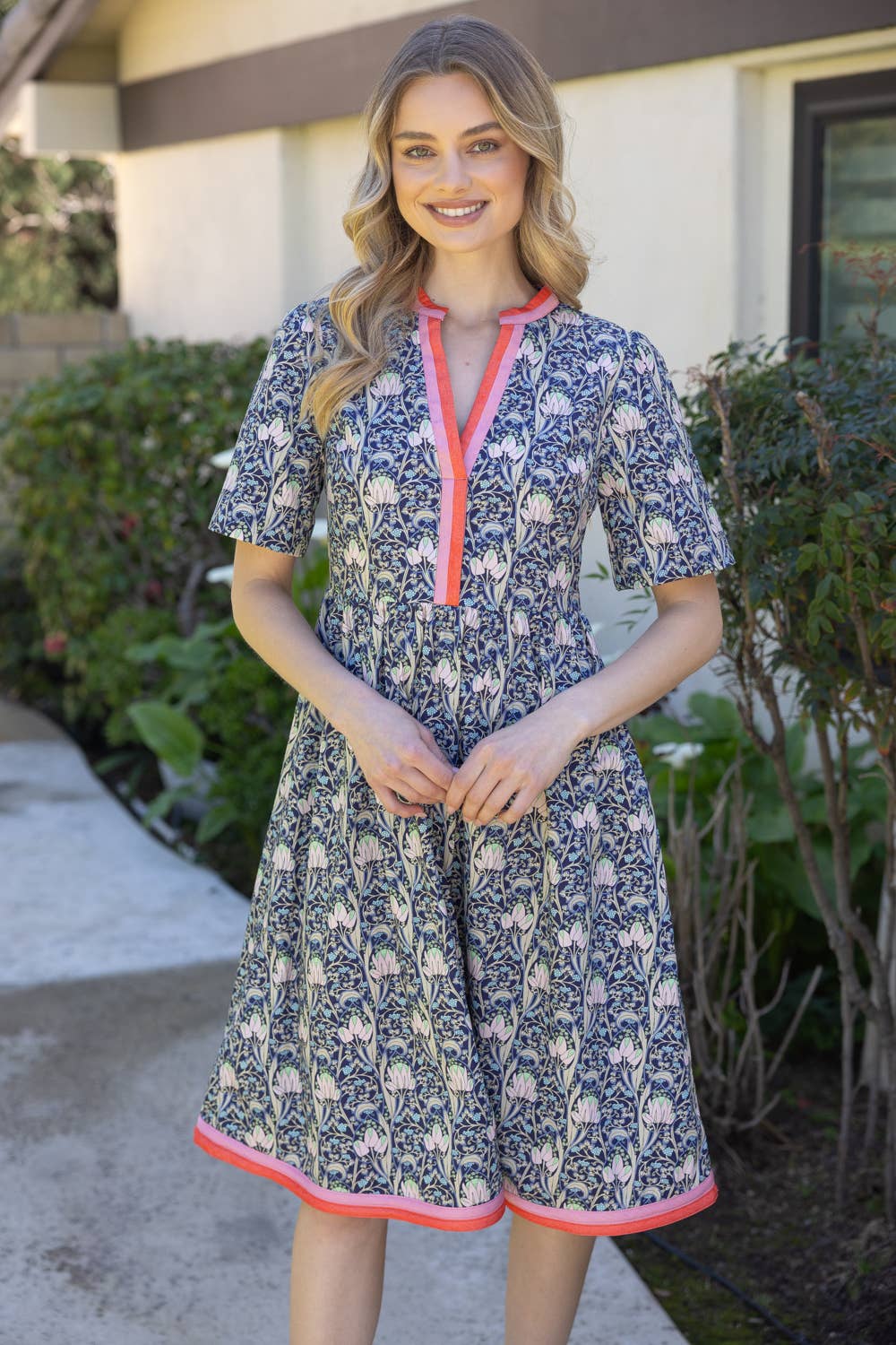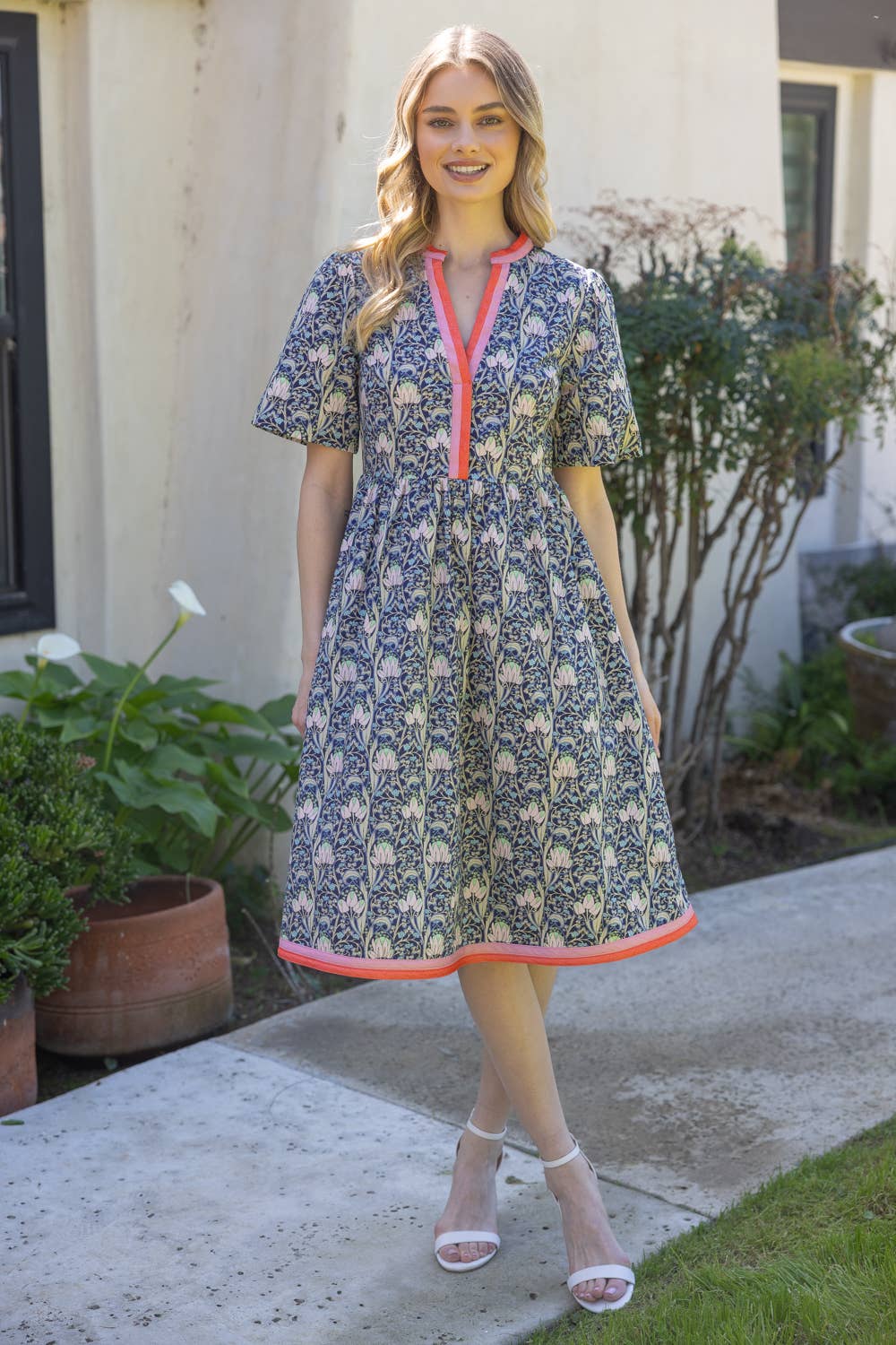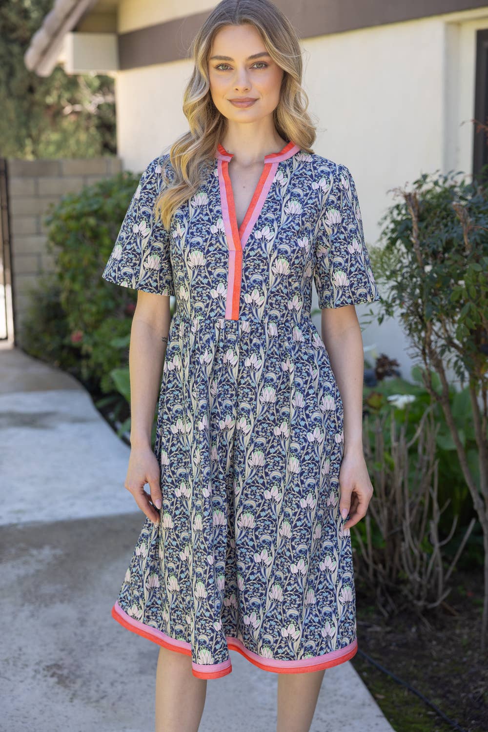 • V-neckline • Short sleeve • Contrast striped neck and hem detail • Midi length dress • Floral woven fabric • Size information: Model height 5' 8”, wearing size Small