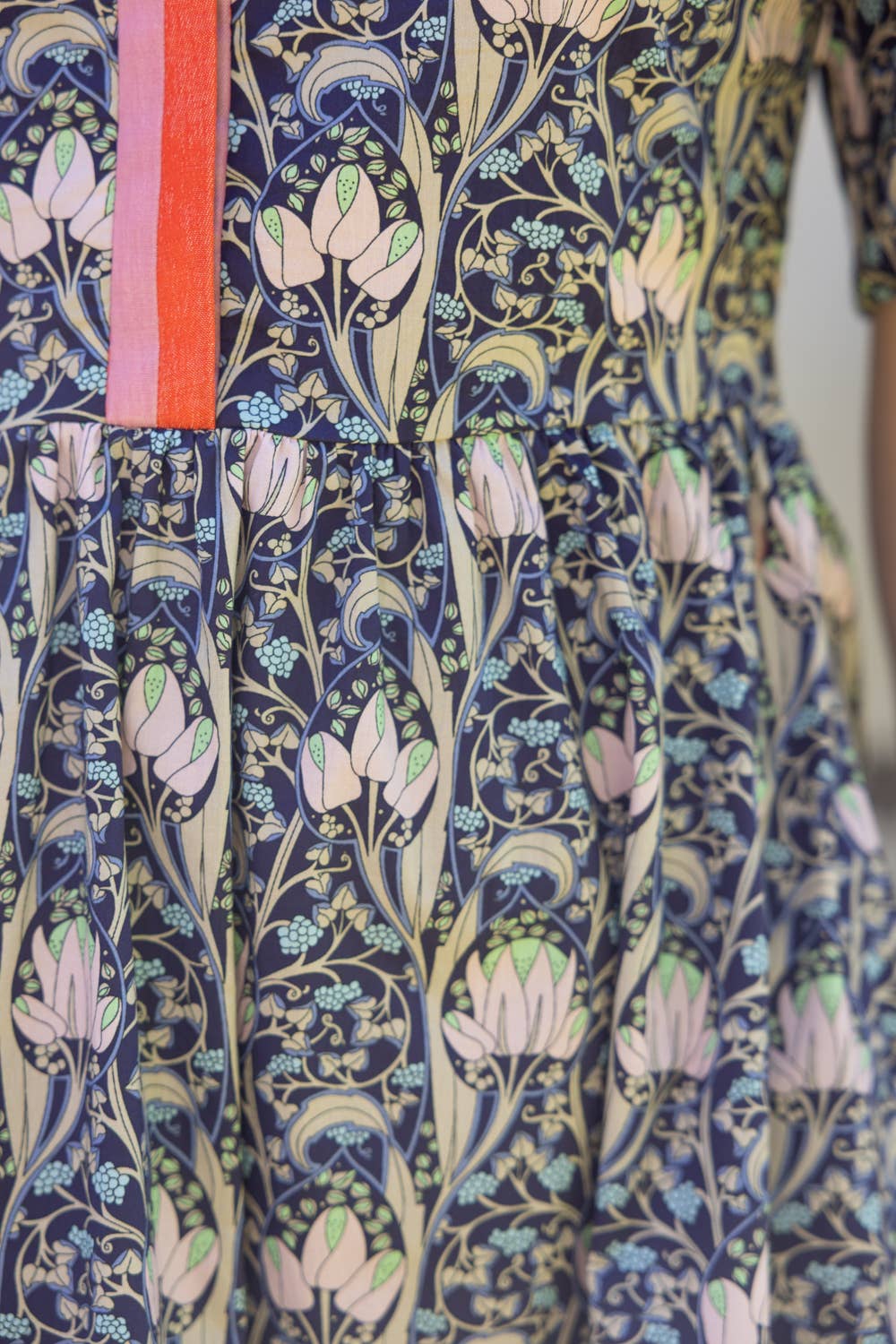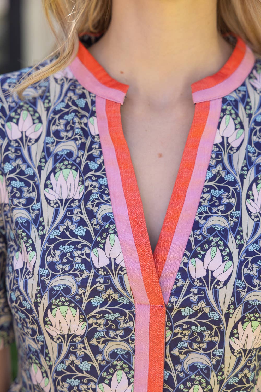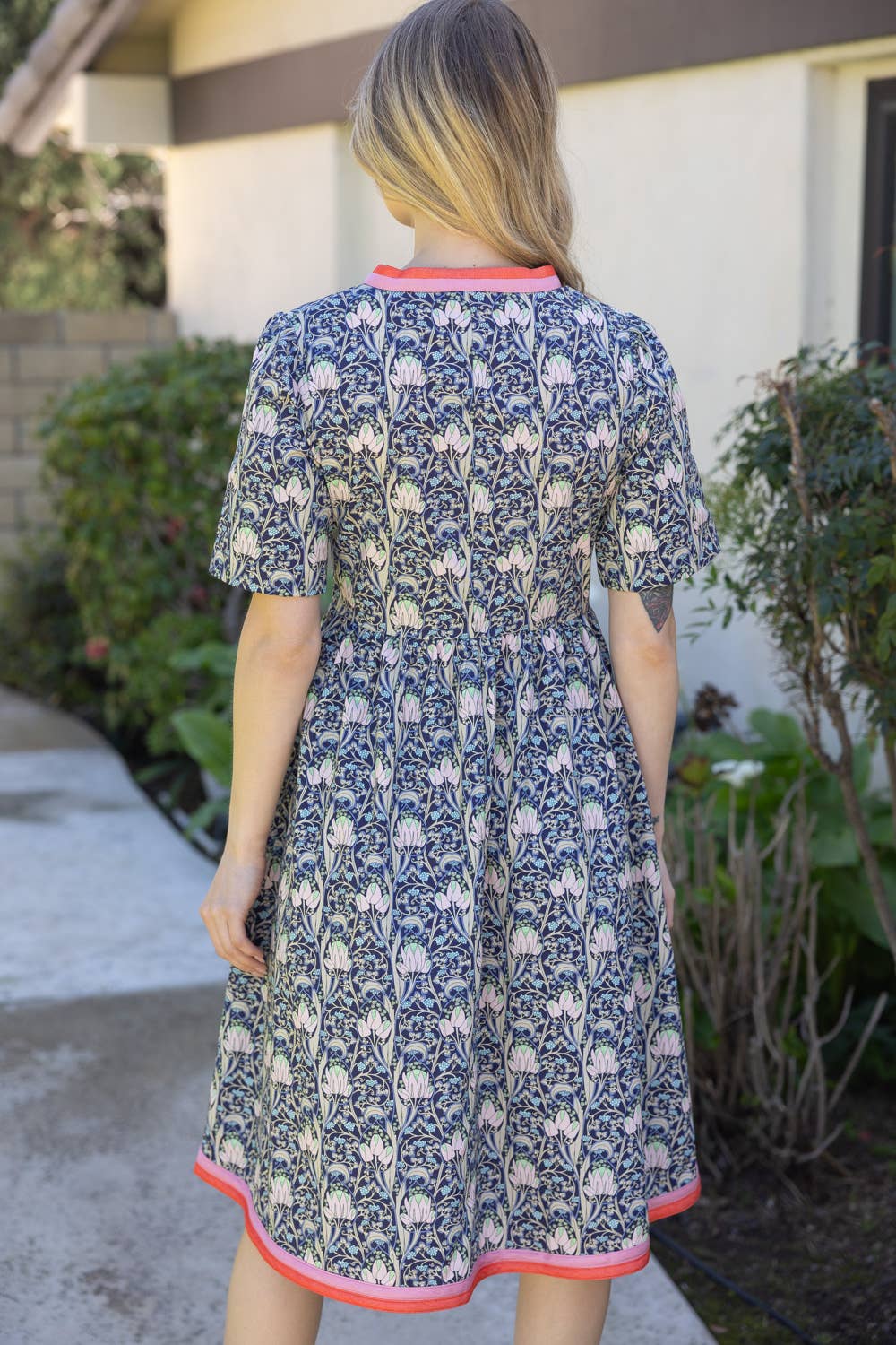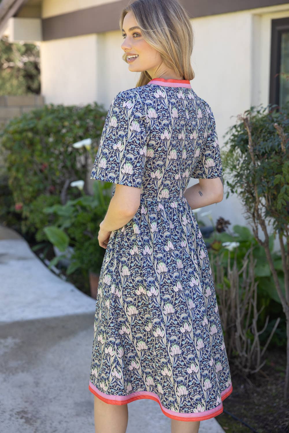 • V-neckline • Short sleeve • Contrast striped neck and hem detail • Midi length dress • Floral woven fabric • Size information: Model height 5' 8”, wearing size Small